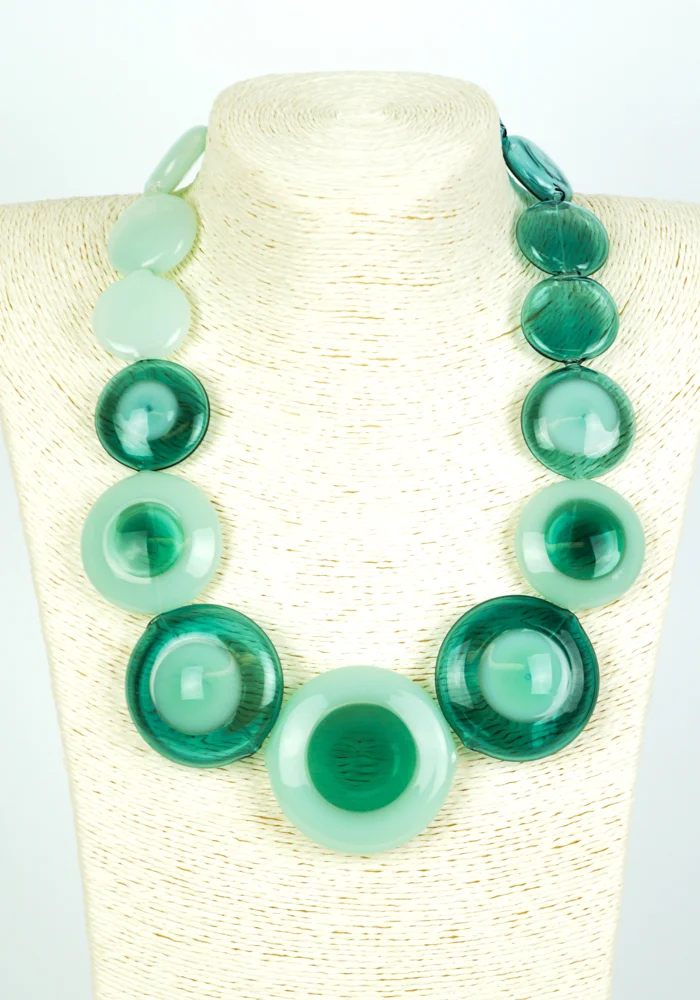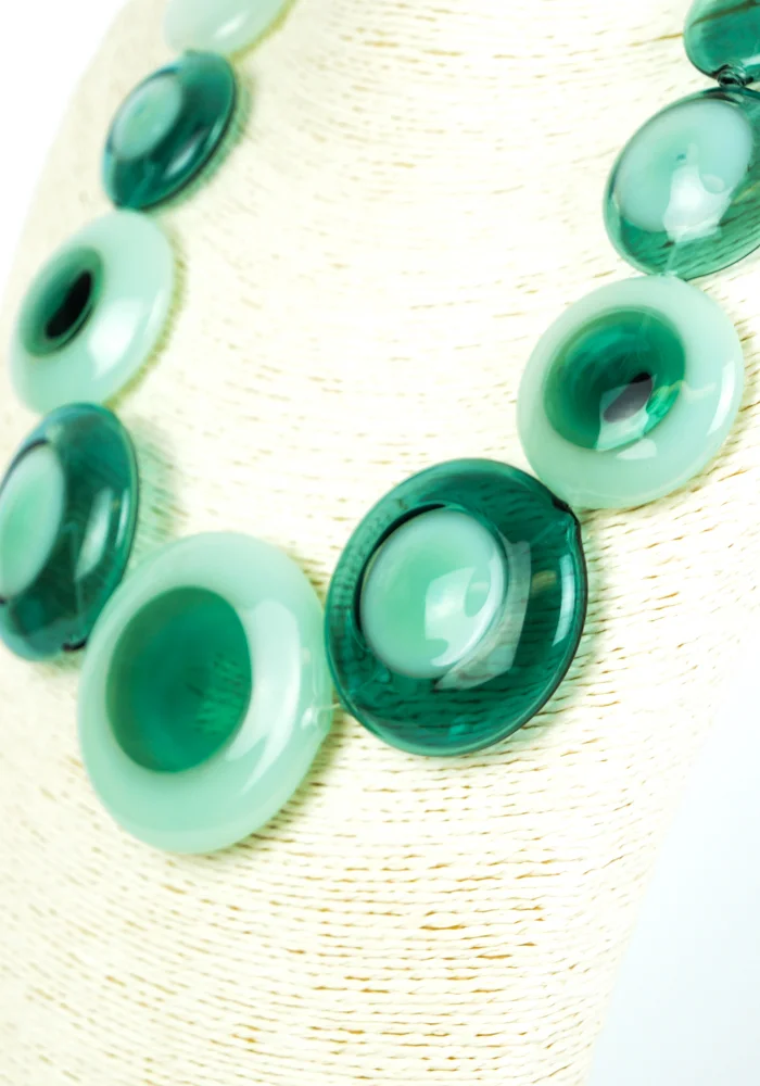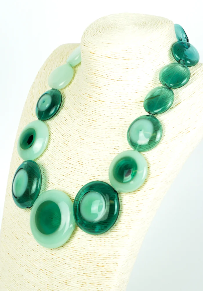 Le nostre collane in vetro soffiato di Murano sono interamente fatte a mano con la tecnica della lavorazione del vetro a “Lume”, come questo fantastico gioiello Indio di colore opalino e verde smeraldo in vetro Murano, eseguito dal nostro Maestro vetraio veneziano De Mio. Eleganza e leggerezza sposate in una magnifica opera in vetro artistico di Murano. Le misure della collana sono adattabili per qualsiasi collo. Opera esclusiva MadeMuranoGlass.