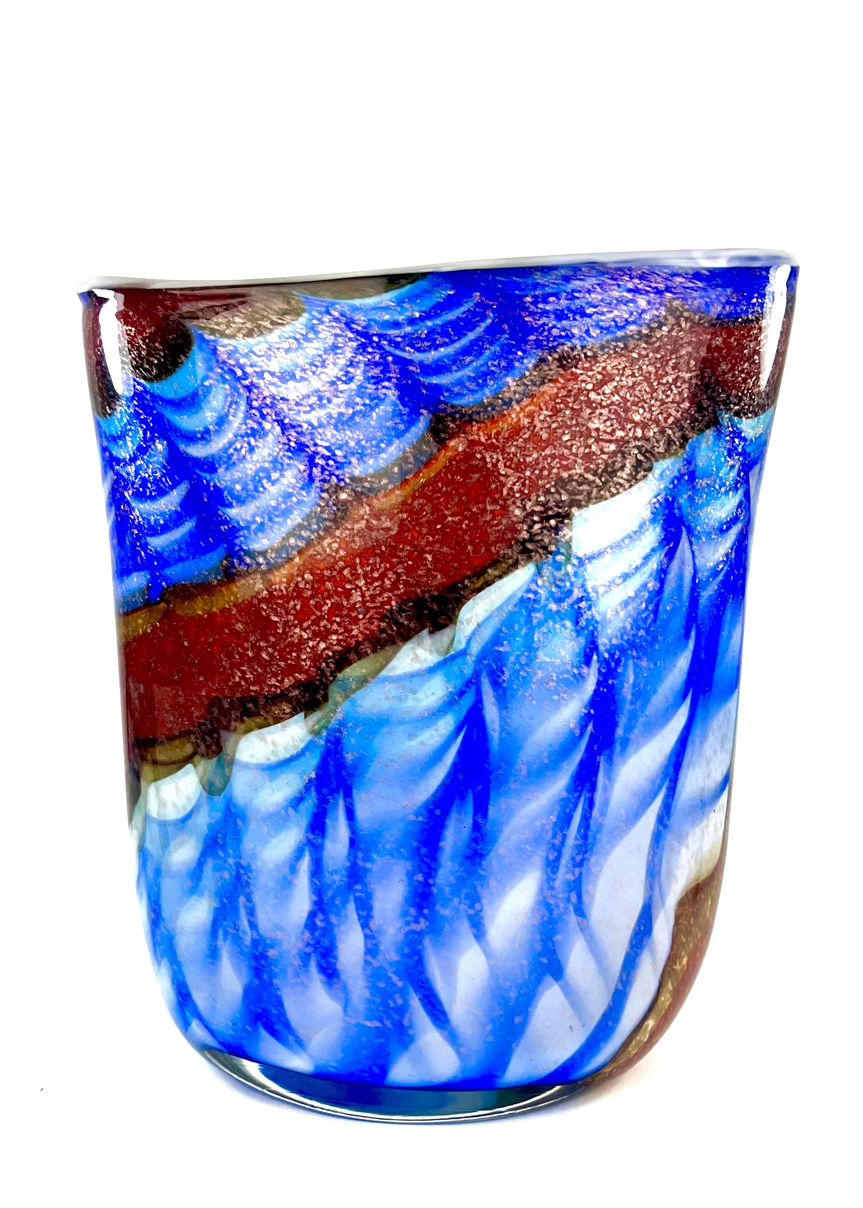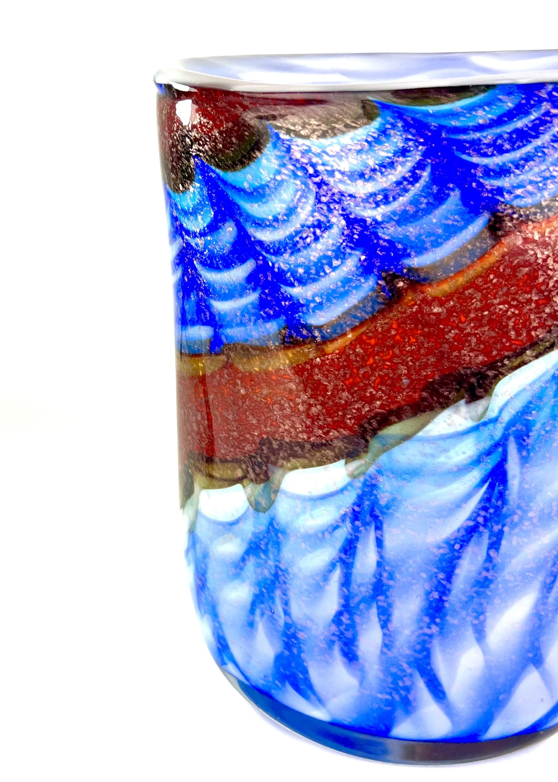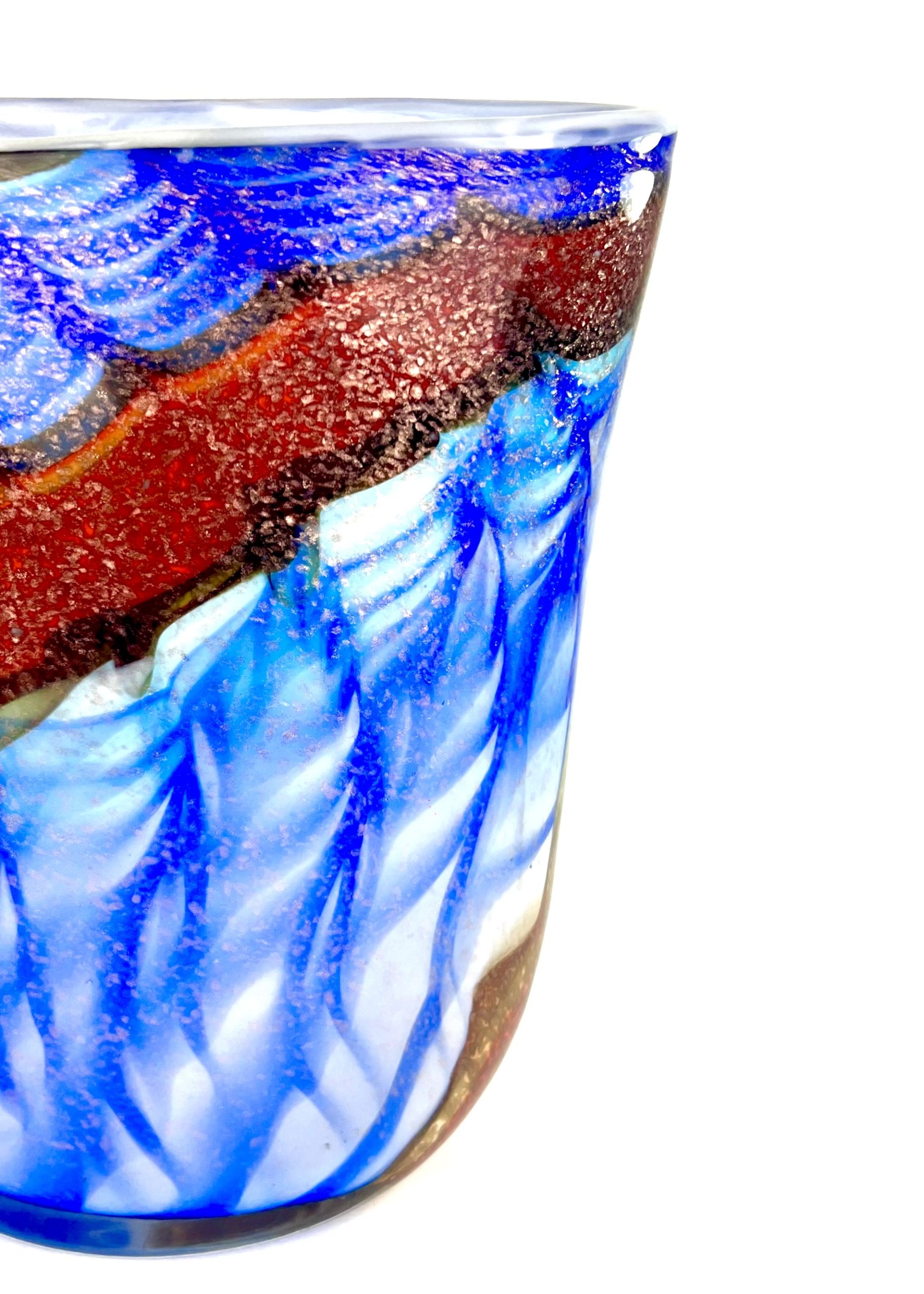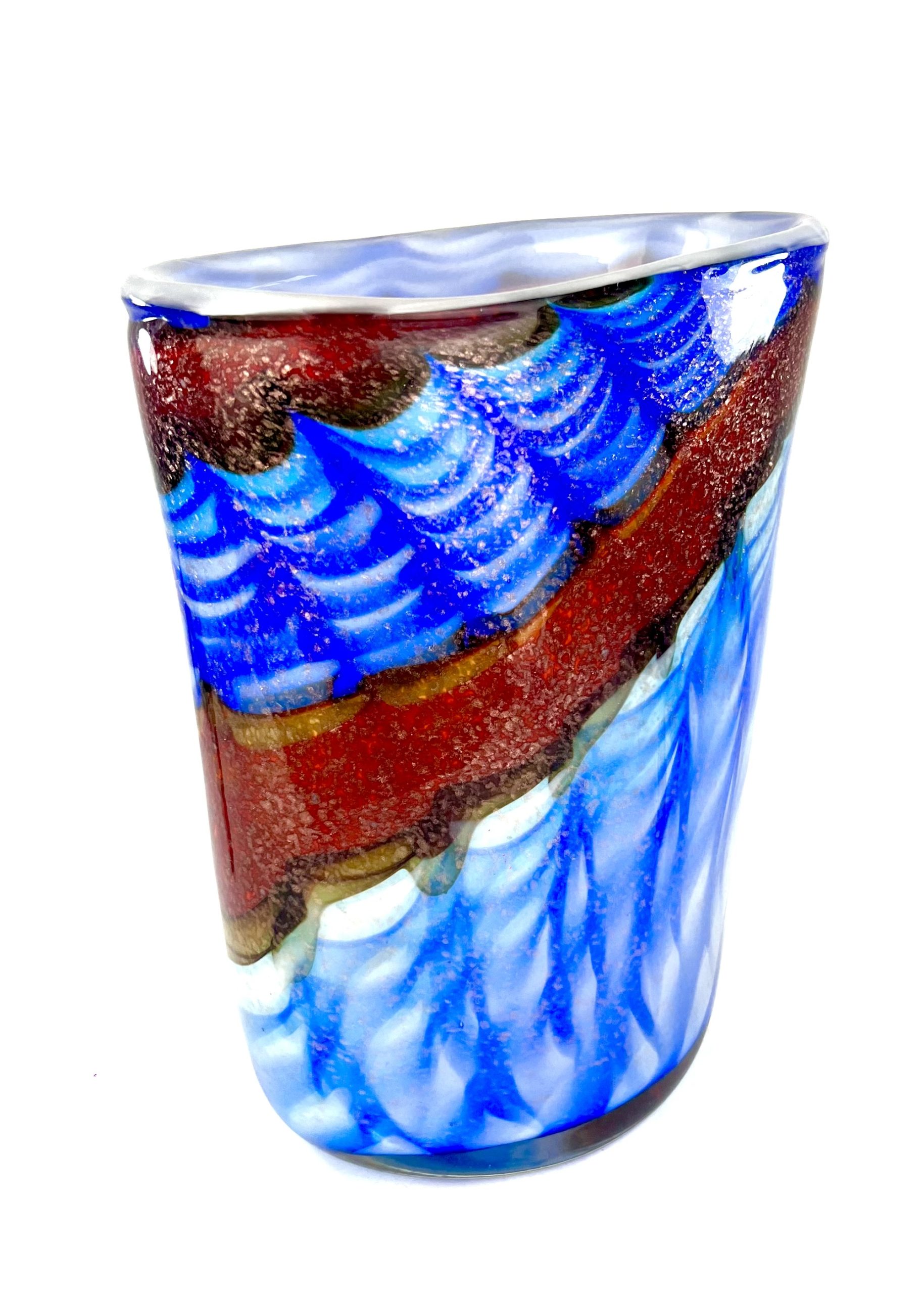 Fantastico vaso esclusivo in vetro soffiato di Murano interamente lavorato a mano con lavorazione “Fenicio” rosso e blu.