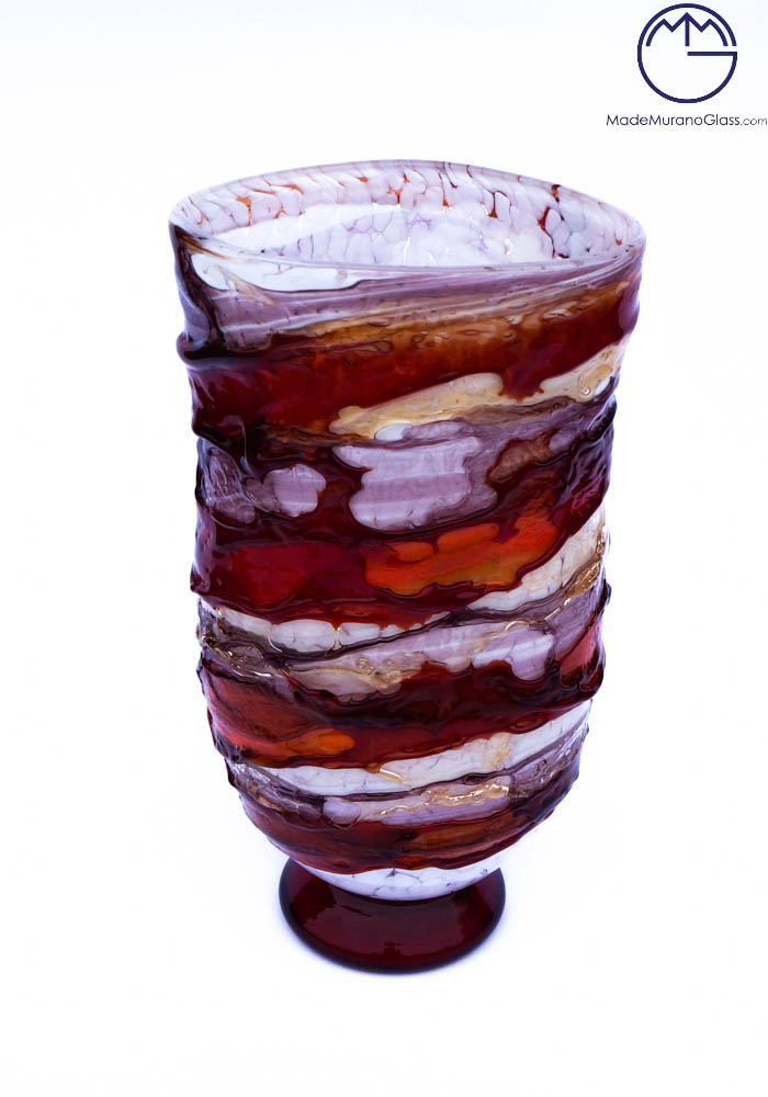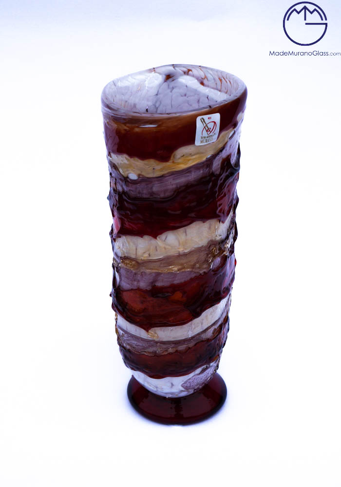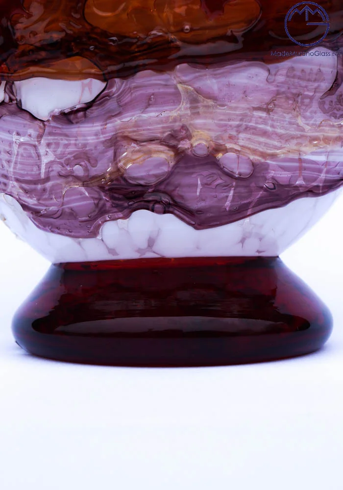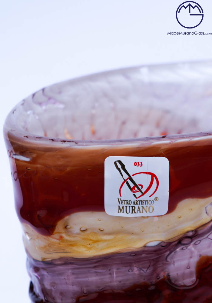 Vaso in vetro soffiato di Murano con colature in rilievo applicate nell’opera, colore rosso, viola, ambra e bianco all’interno, questa lavorazione viene chiamata “Sbruffi”. Opera firmata con incisione a freddo Dal Maestro vetraio (Imperio Rossi). Etichetta Vetro Artistico® Murano. Vedi foto dettagli.