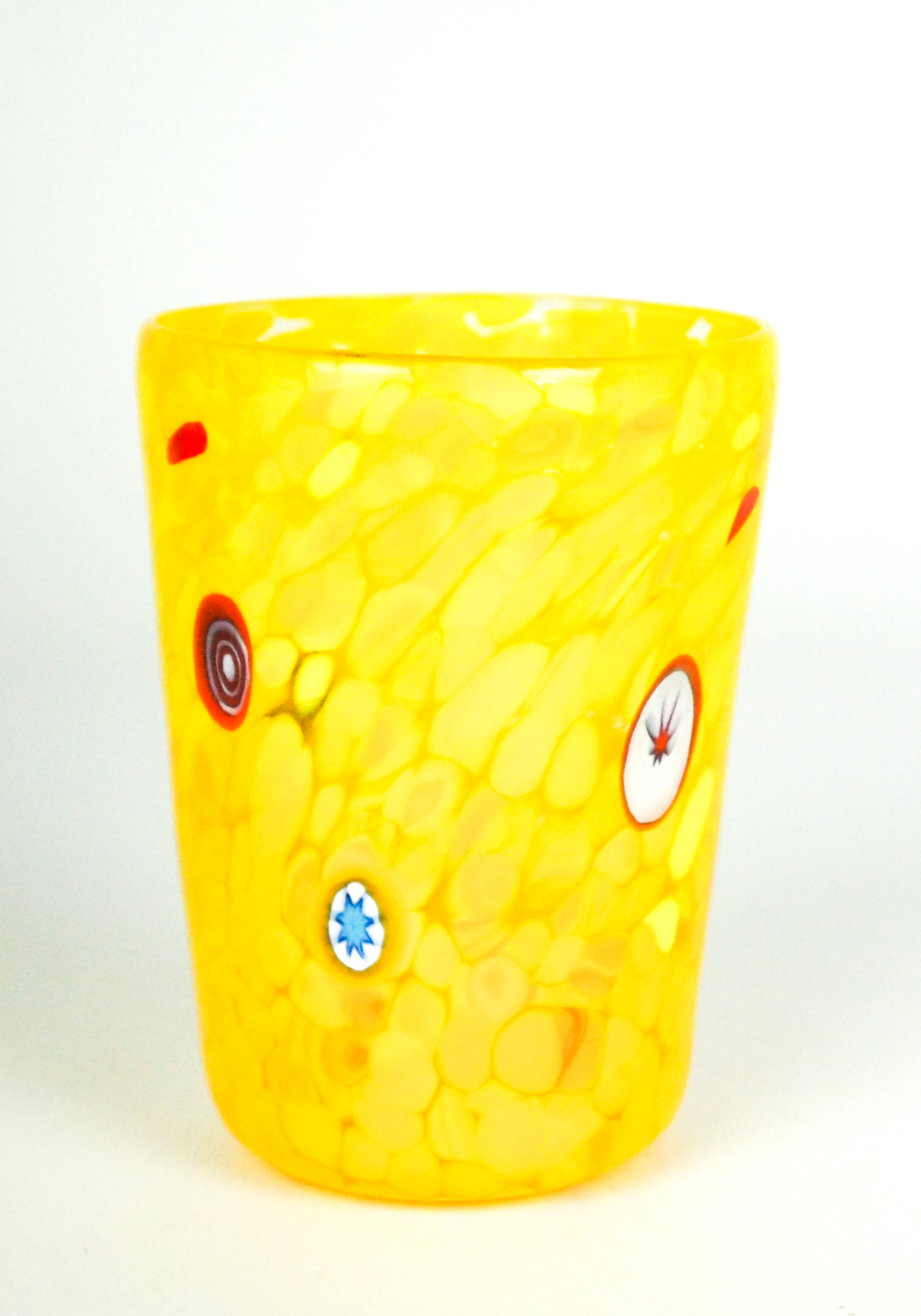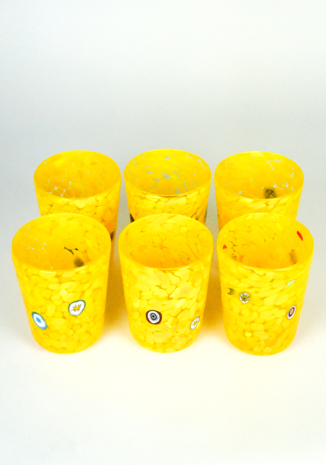Lemon è un Set di 6 bicchieri in vetro soffiato di Murano per acqua o vino eseguiti interamente a mano colore giallo con decorazioni in murrina Millefiori.