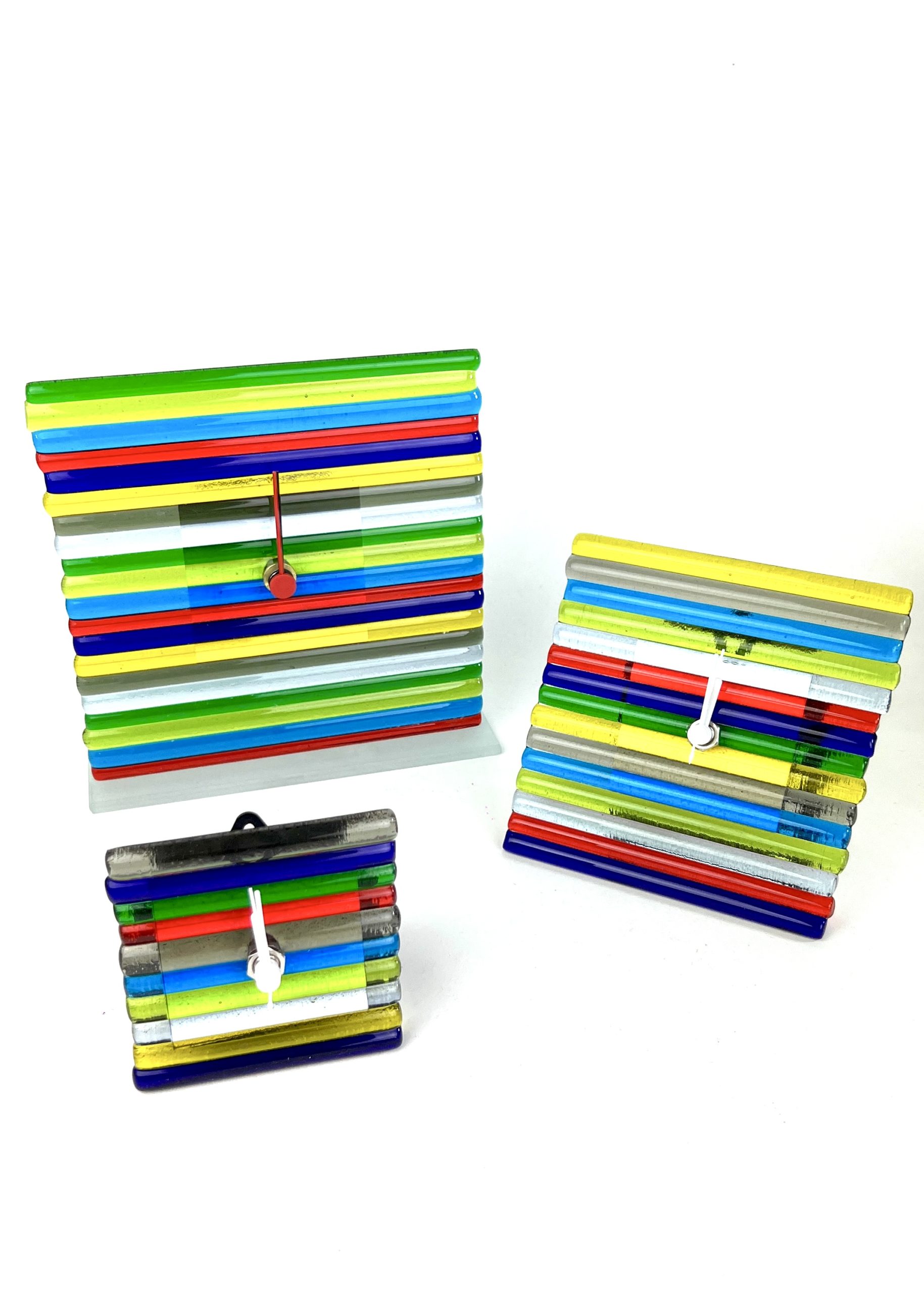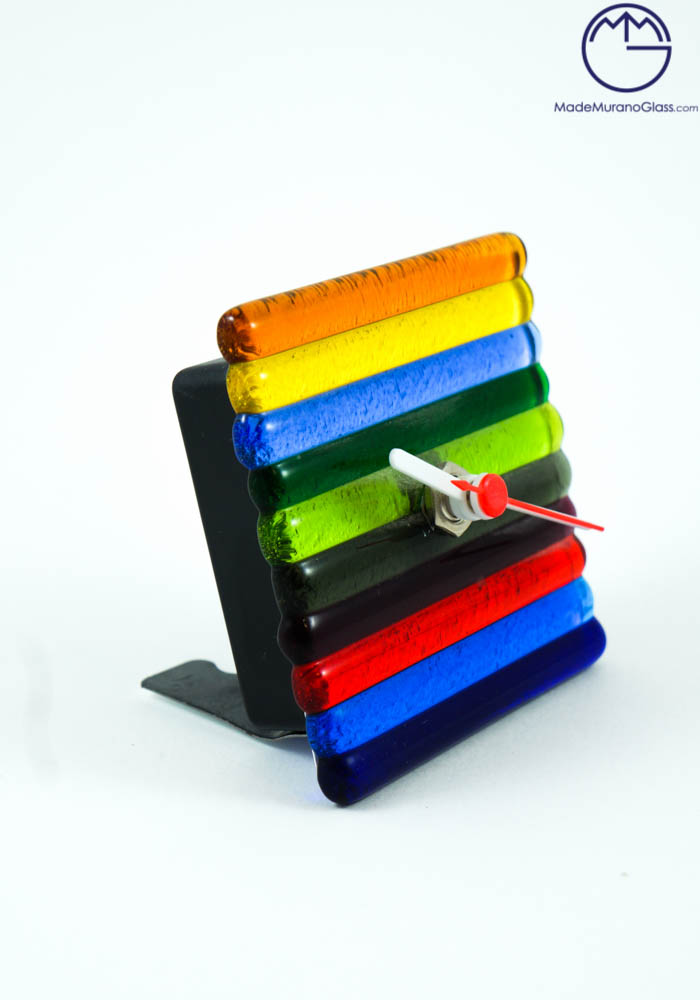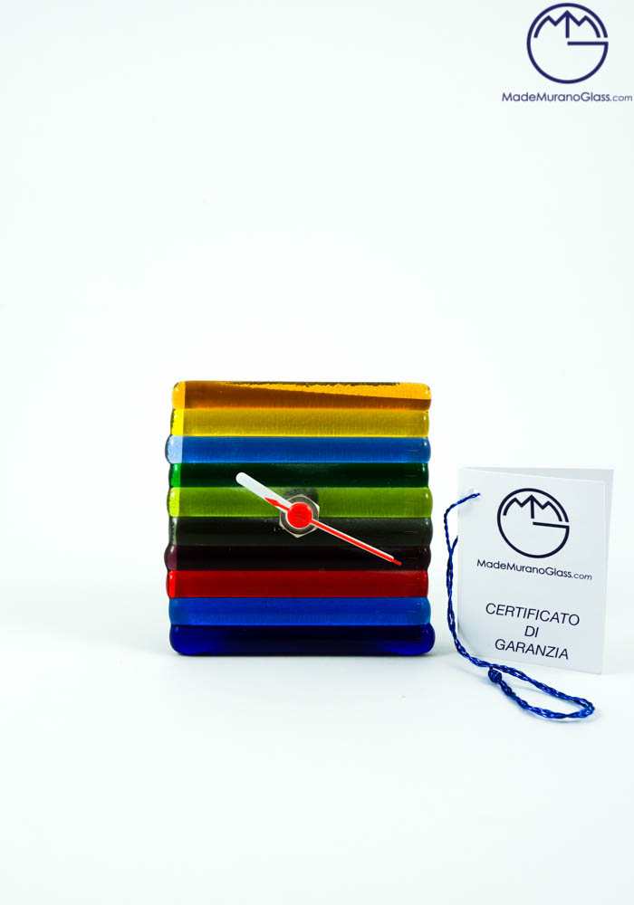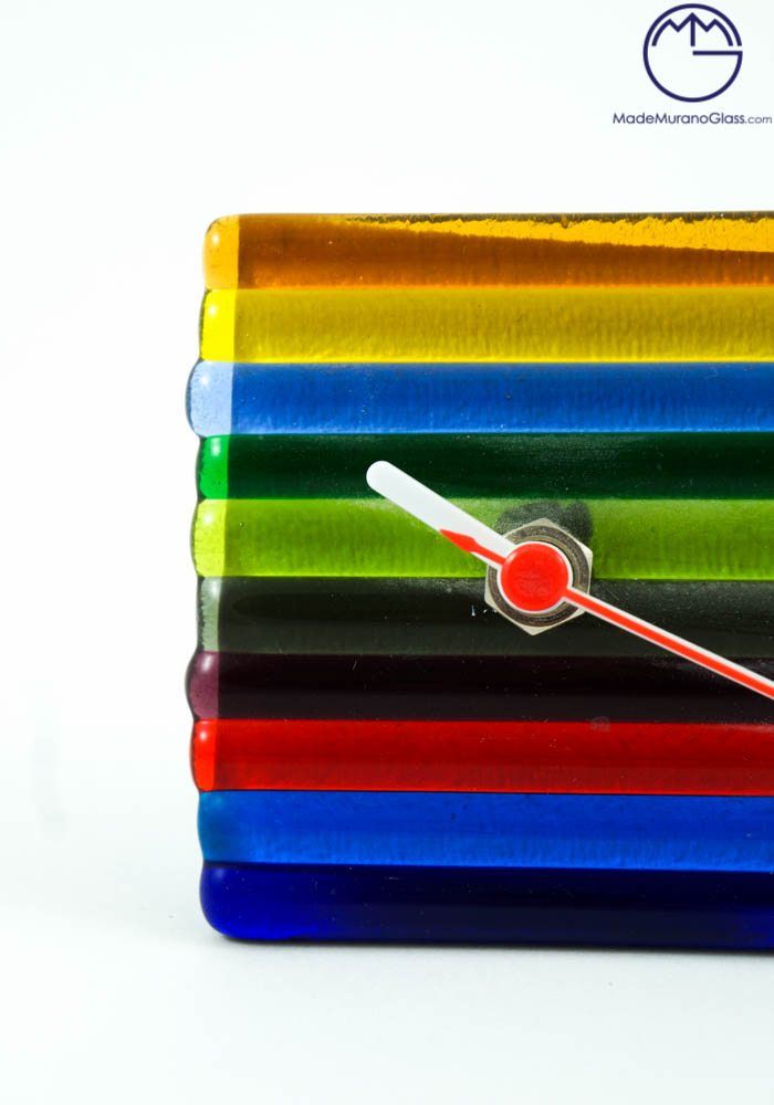 Orologio da tavolo in vetro di Murano con vetro Kanne multicolore su fondo bianco.