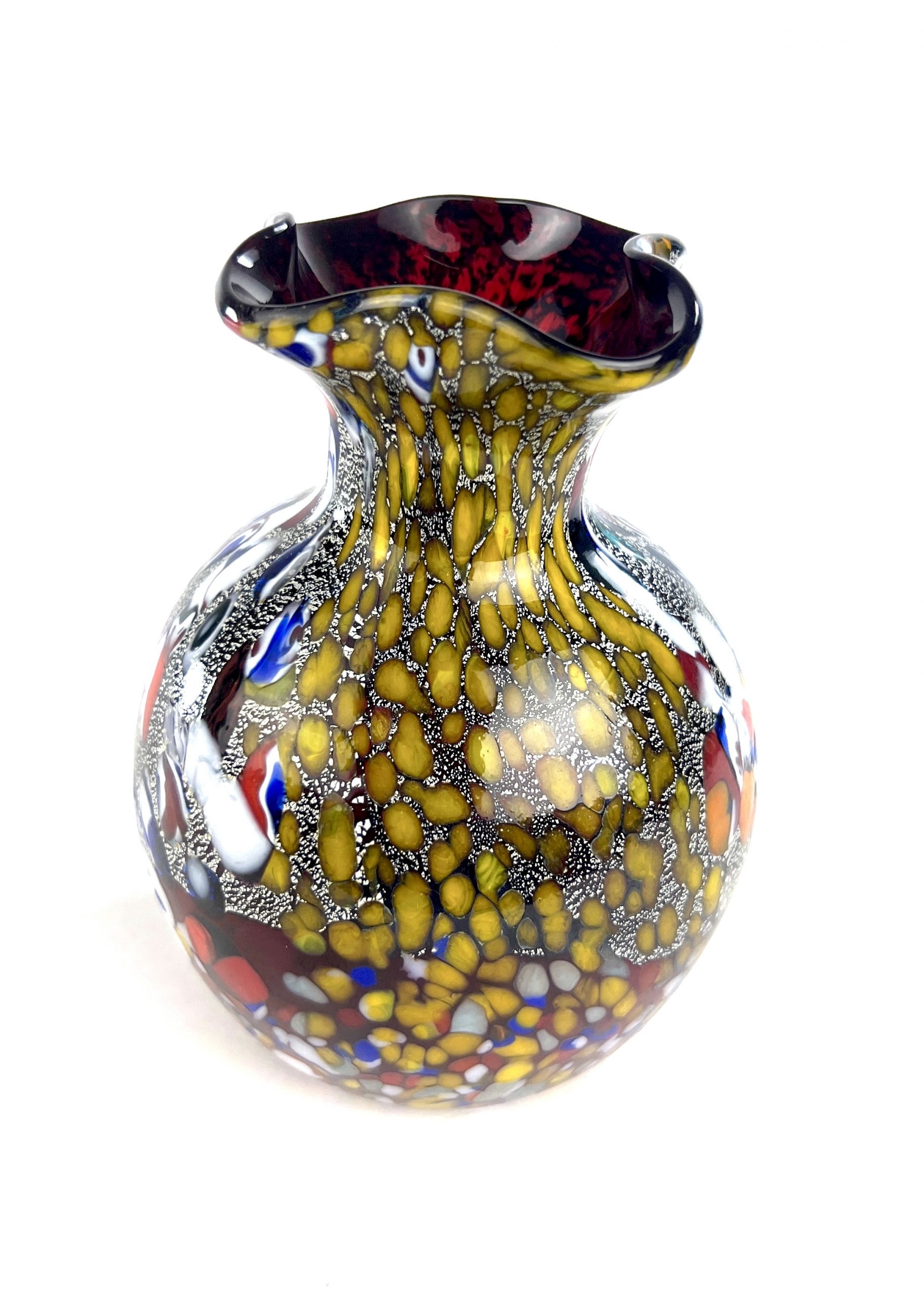 Vaso in vetro di Murano colore rosso con decorazioni assortite di filigrana, Murrine, avventurina, “Mace” di vetro multicolore e foglia argento.