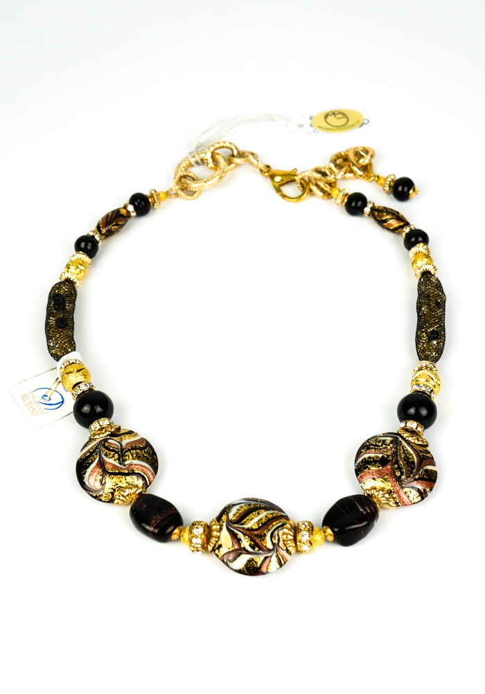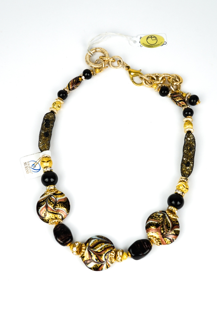 Elegante Collana in vetro Murano interamente fatta a mano con tecnica di lavorazione del vetro a “Lume”. Il colore sgargiante, la raffinatezza e la leggerezza con cui sono lavorati questi gioielli, rendono il Made Murano Glass unico e inimitabile. Le perle di questo fantastico Gioiello in vetro soffiato di Murano hanno forme diverse, colori assortiti e lavorazione in foglia oro 24k e avventurina. I gioielli in vetro di Murano sono manufatti di arte e bellezza che ogni donna vorrebbe indossare. Così come gli oggetti in vetro di Murano arricchiscono una casa, allo stesso modo i gioielli possono impreziosire una donna. Ecco perché non possono non lasciare un segno!