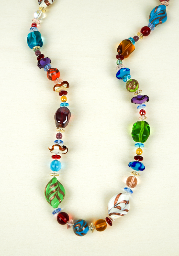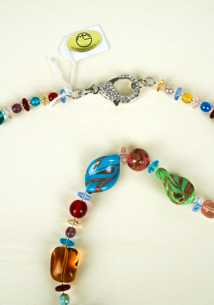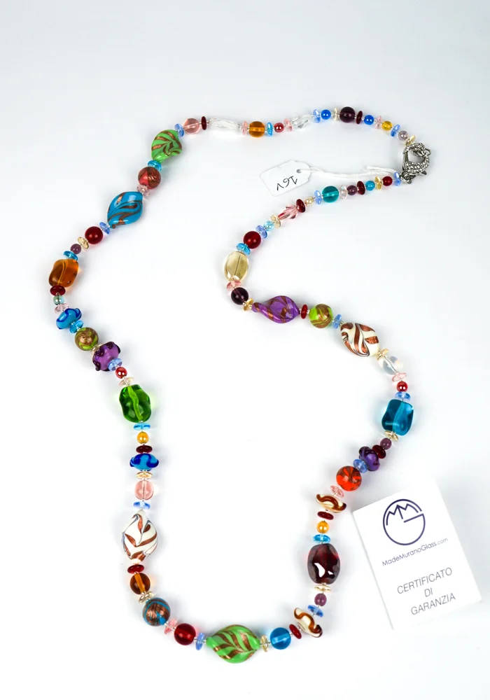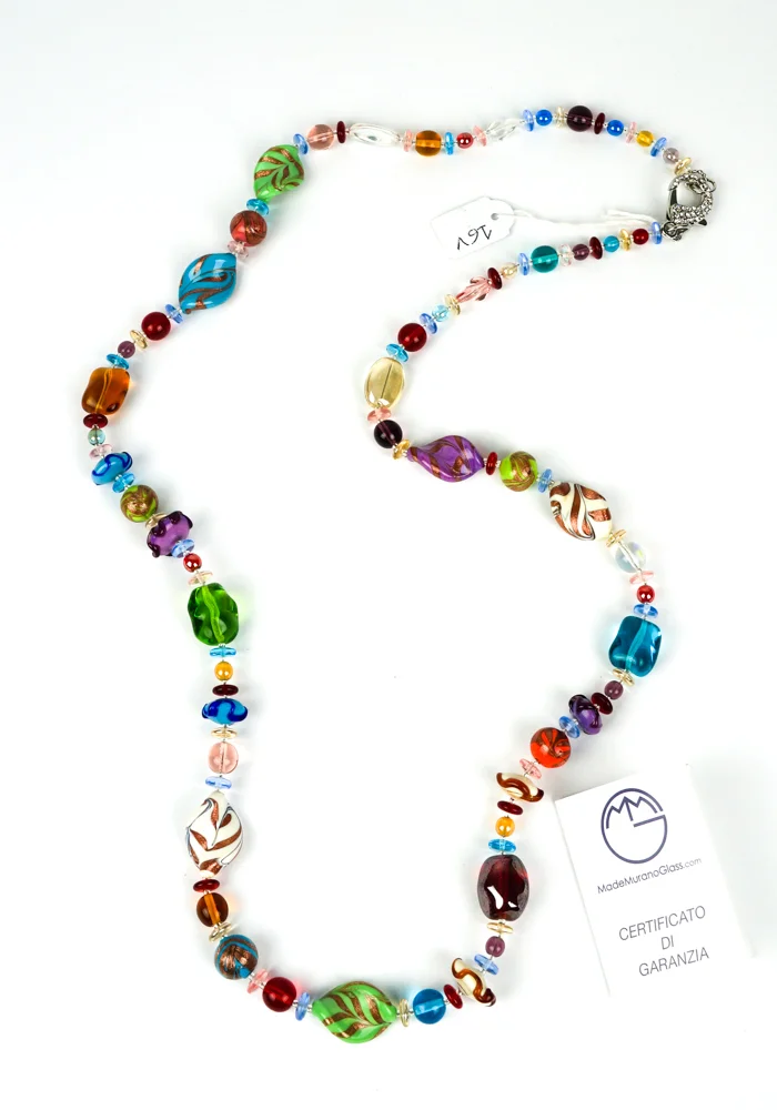 Le perle di questo fantastico gioiello in vetro veneziano hanno diverse forme e colori assortiti.