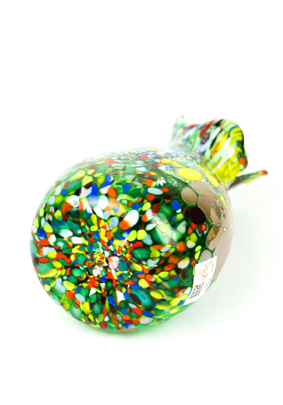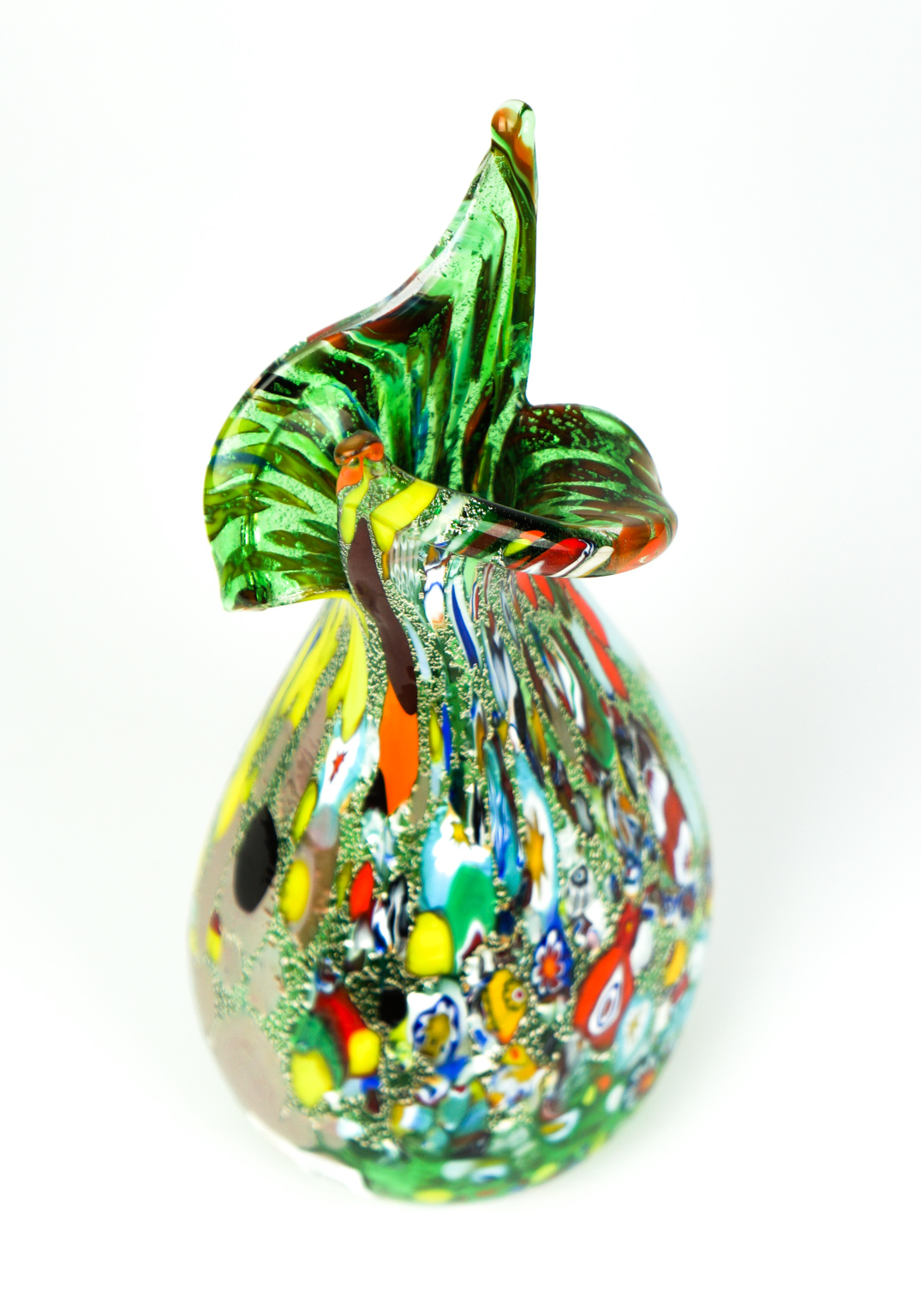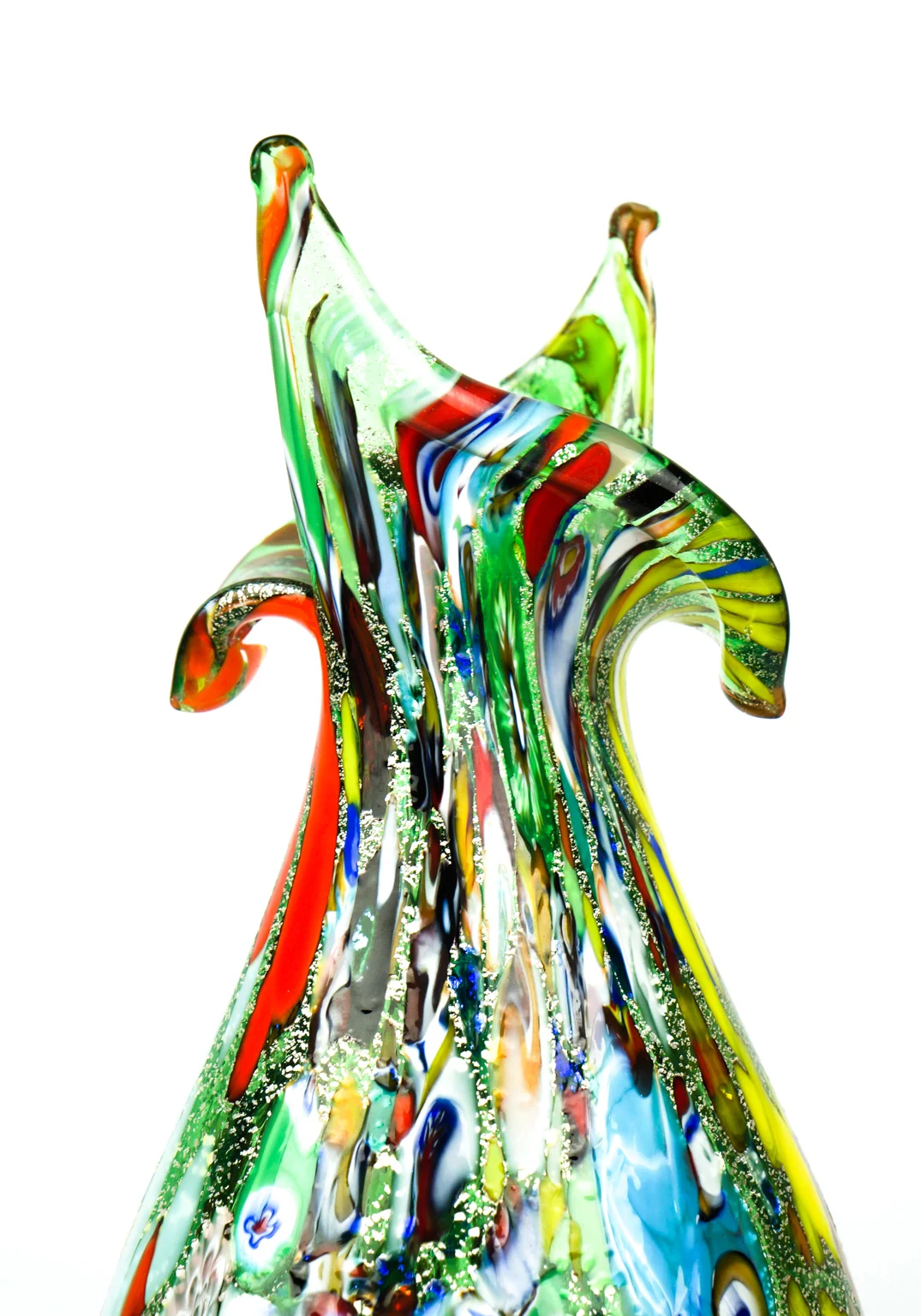 Minay è un vaso in vetro soffiato di Murano colore verde con decorazioni assortite di filigrana, Murrine, avventurina, “Mace” e argento. Il Maestro vetraio di Murano Rossi mescola questi colori di volta in volta in maniera sempre differente, rendendo così le sue opere uniche e inimitabili. Opera firmata con incisione a freddo dall’artista (I. Rossi). Etichetta Vetro Artistico® Murano.