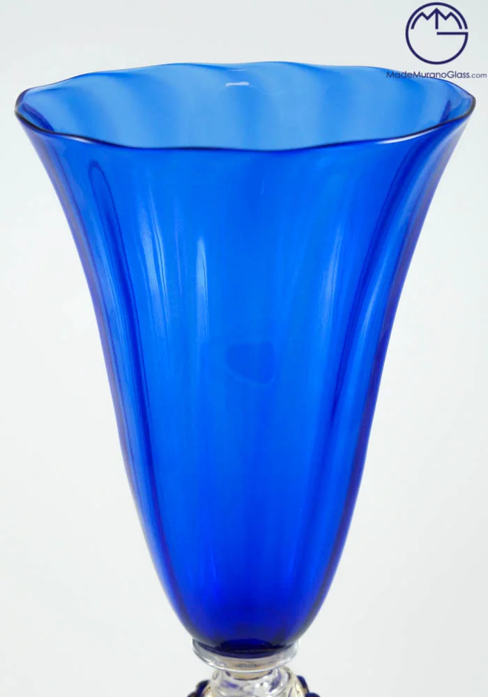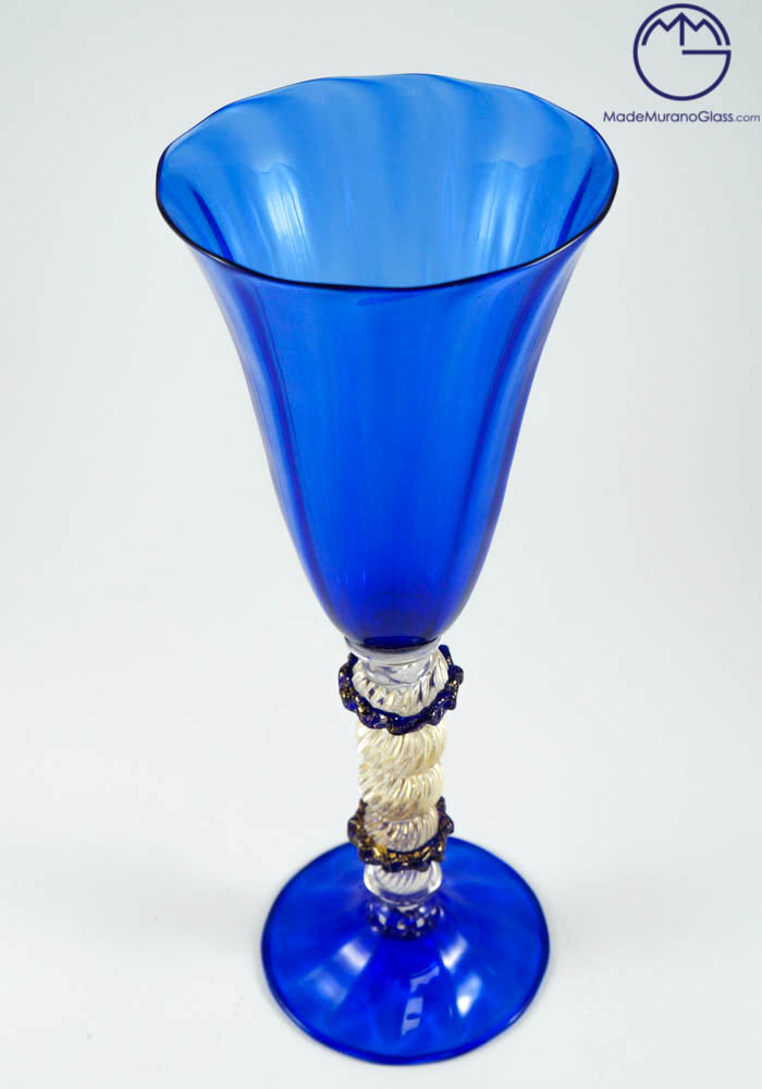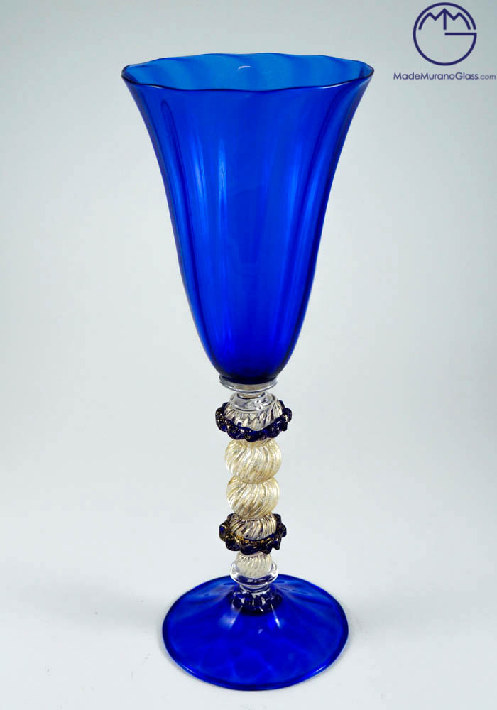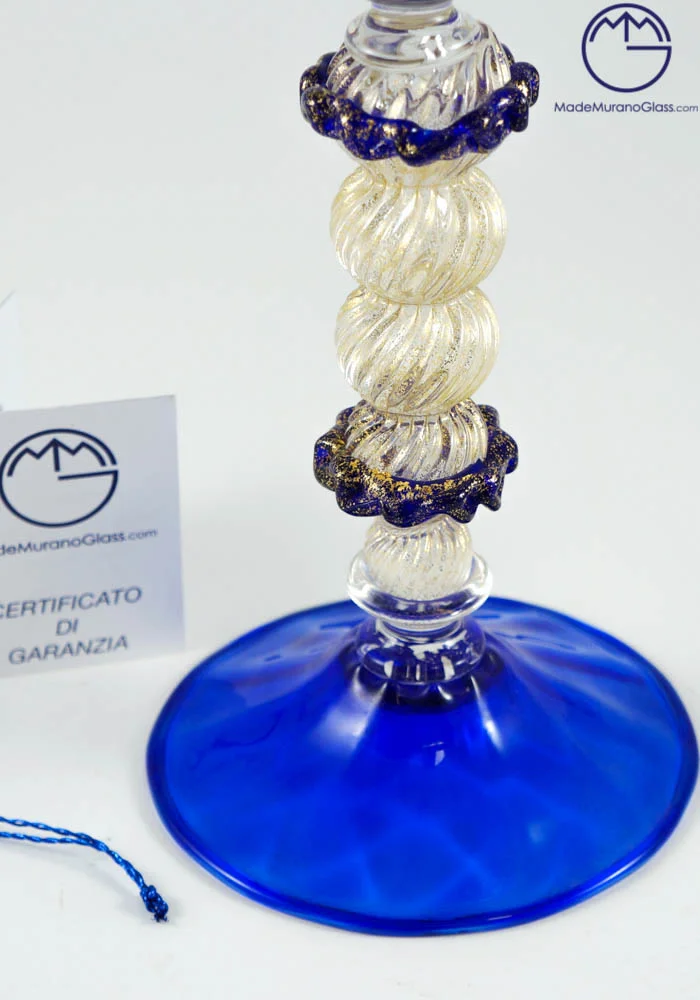 Fantastico calice in vetro Murano color blue, con decorazioni nel gambo in foglia d’oro 24kt.