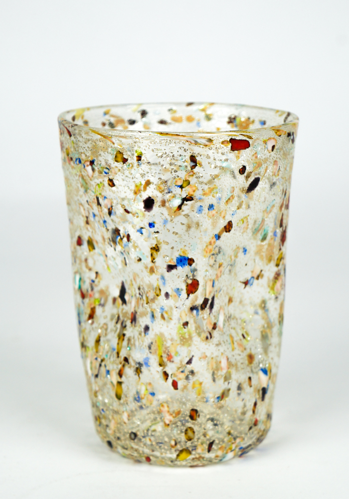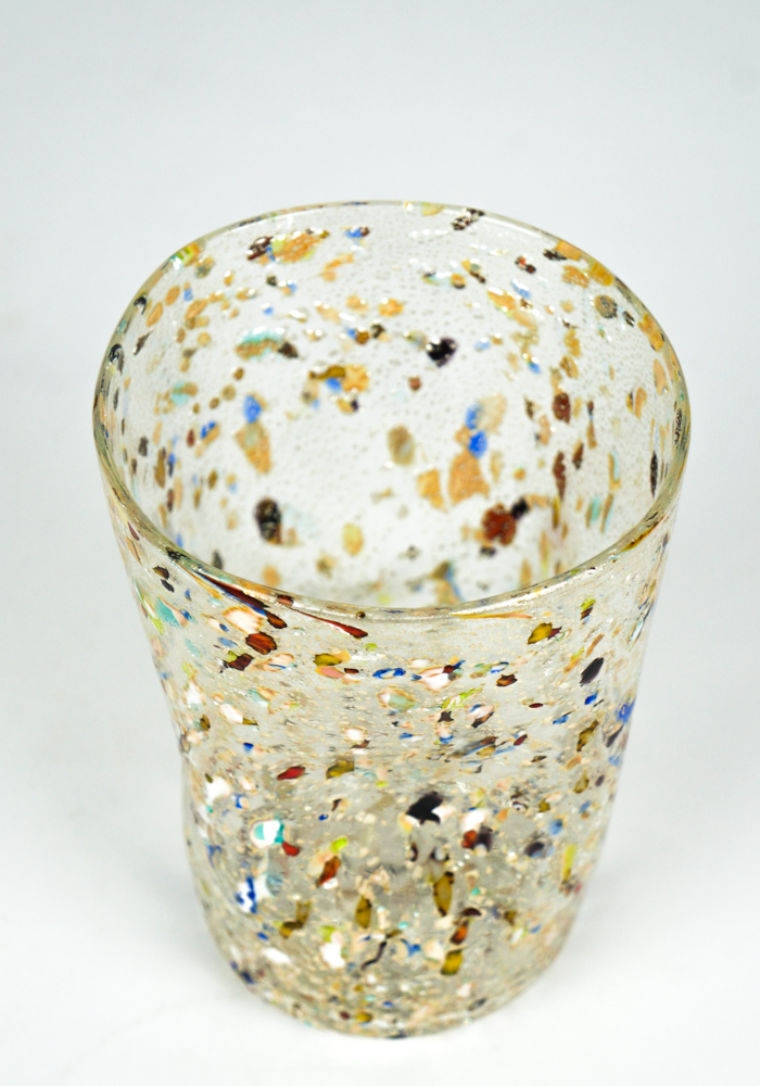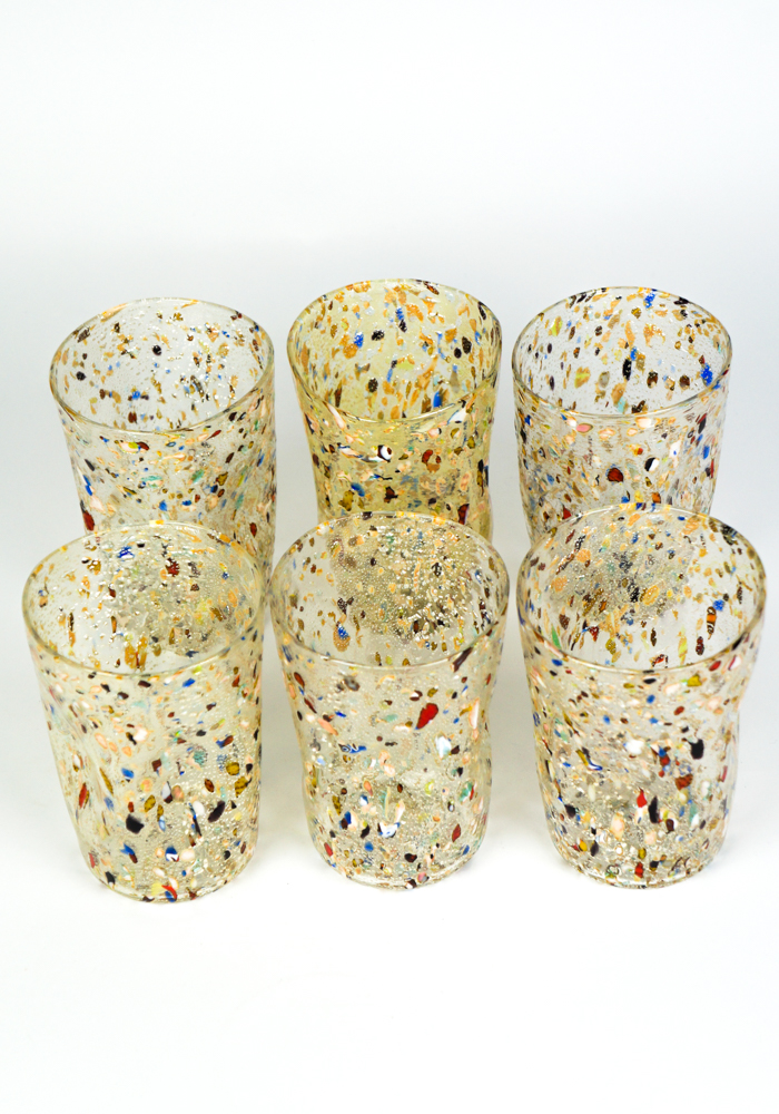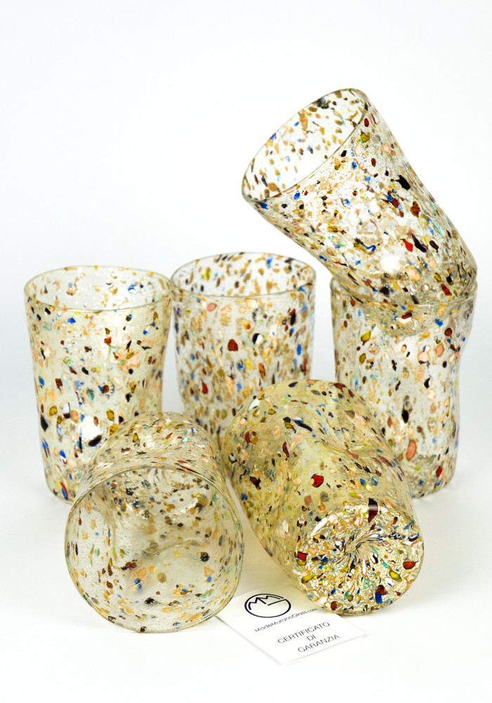 New Foundland è un Set composto da 6 bicchieri per acqua o vino in vetro di soffiato di Murano con lavorazione a scaglie di vetro multicolore e ricoperto in foglia argento.