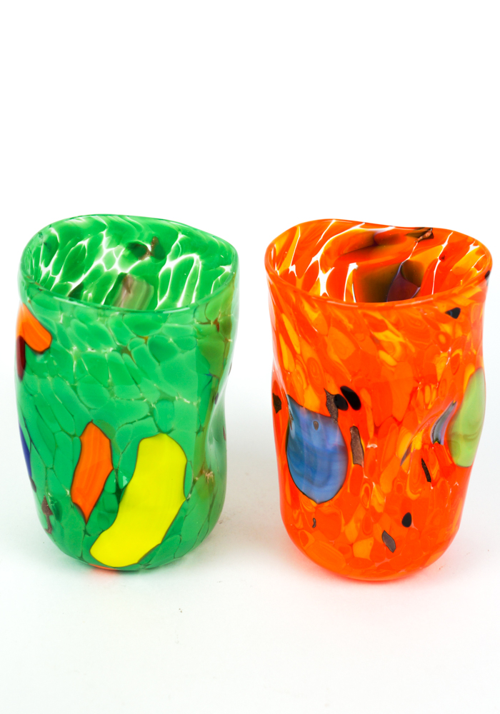 Il set comprende bicchieri di colore blu, acquamarina, verde, arancione, giallo e bianco con decorazioni multicolore.