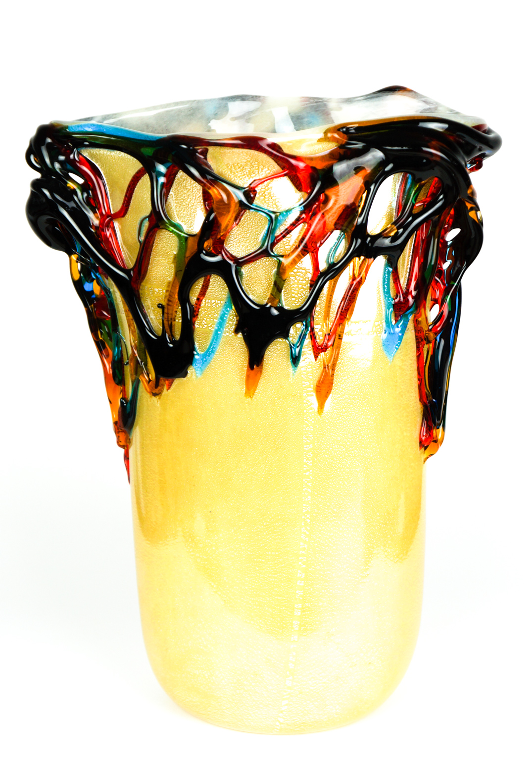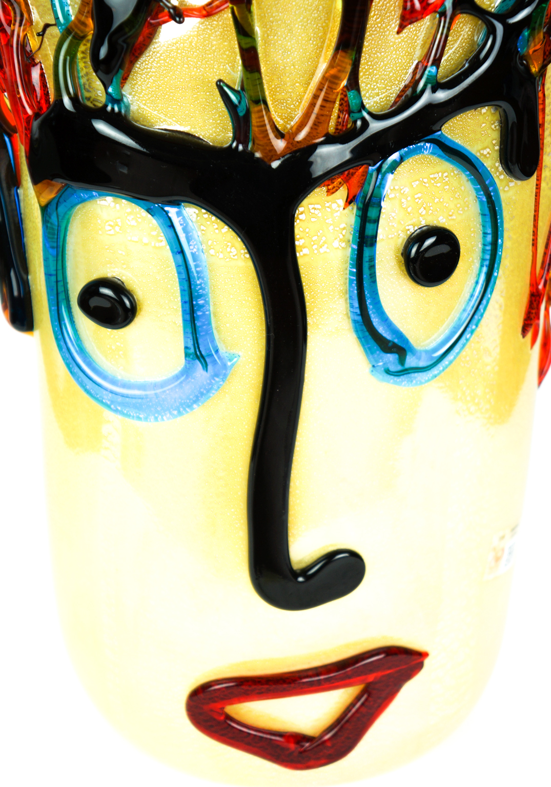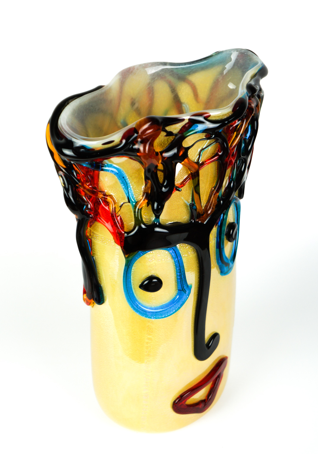 Tributo a Pablo Picasso, esclusivo vaso in vetro soffiato di Murano lavorato interamente a mano di colore avorio con foglia argento e colature esterne in rilievo di vetro ambra, rosso e acquamarina.