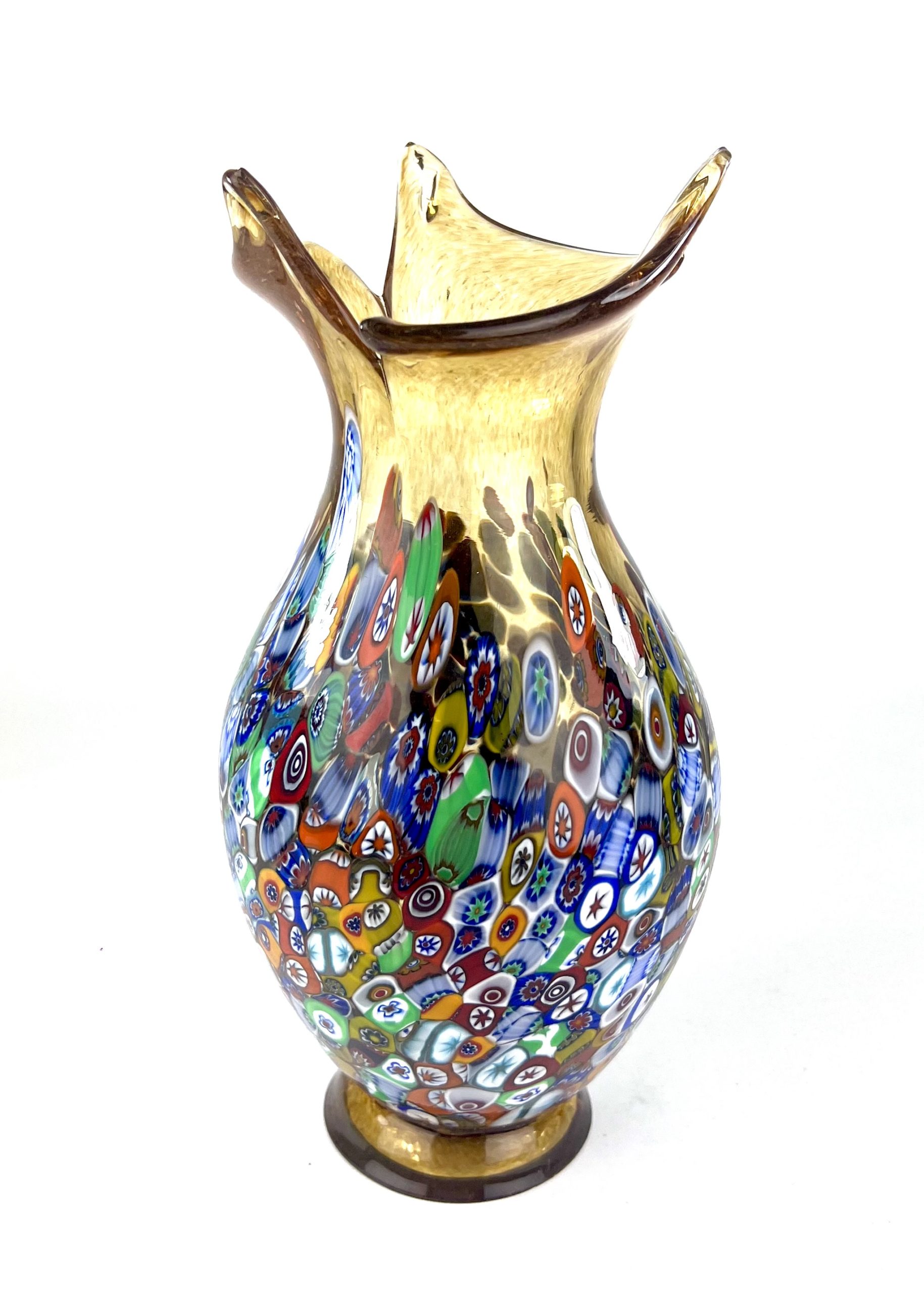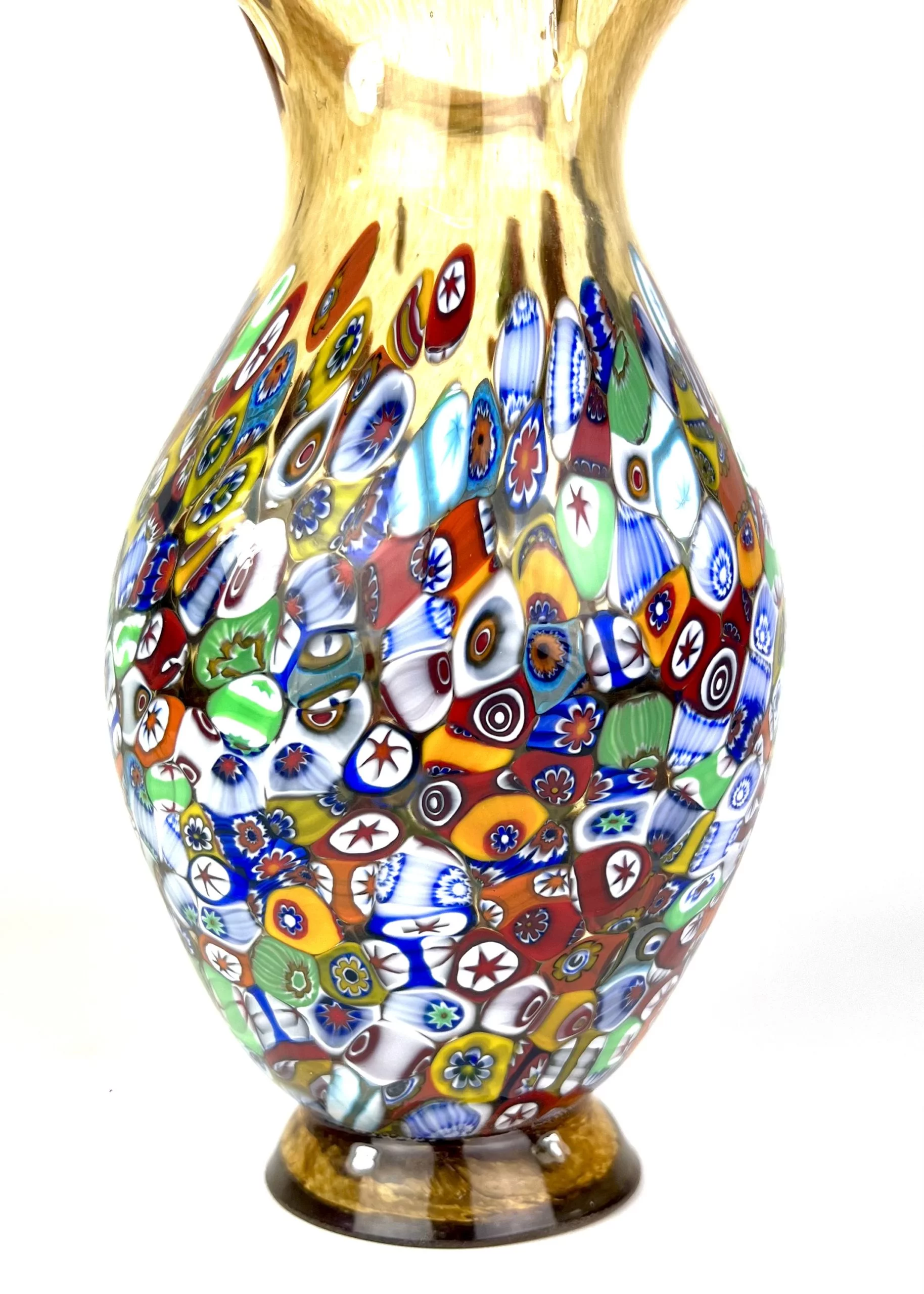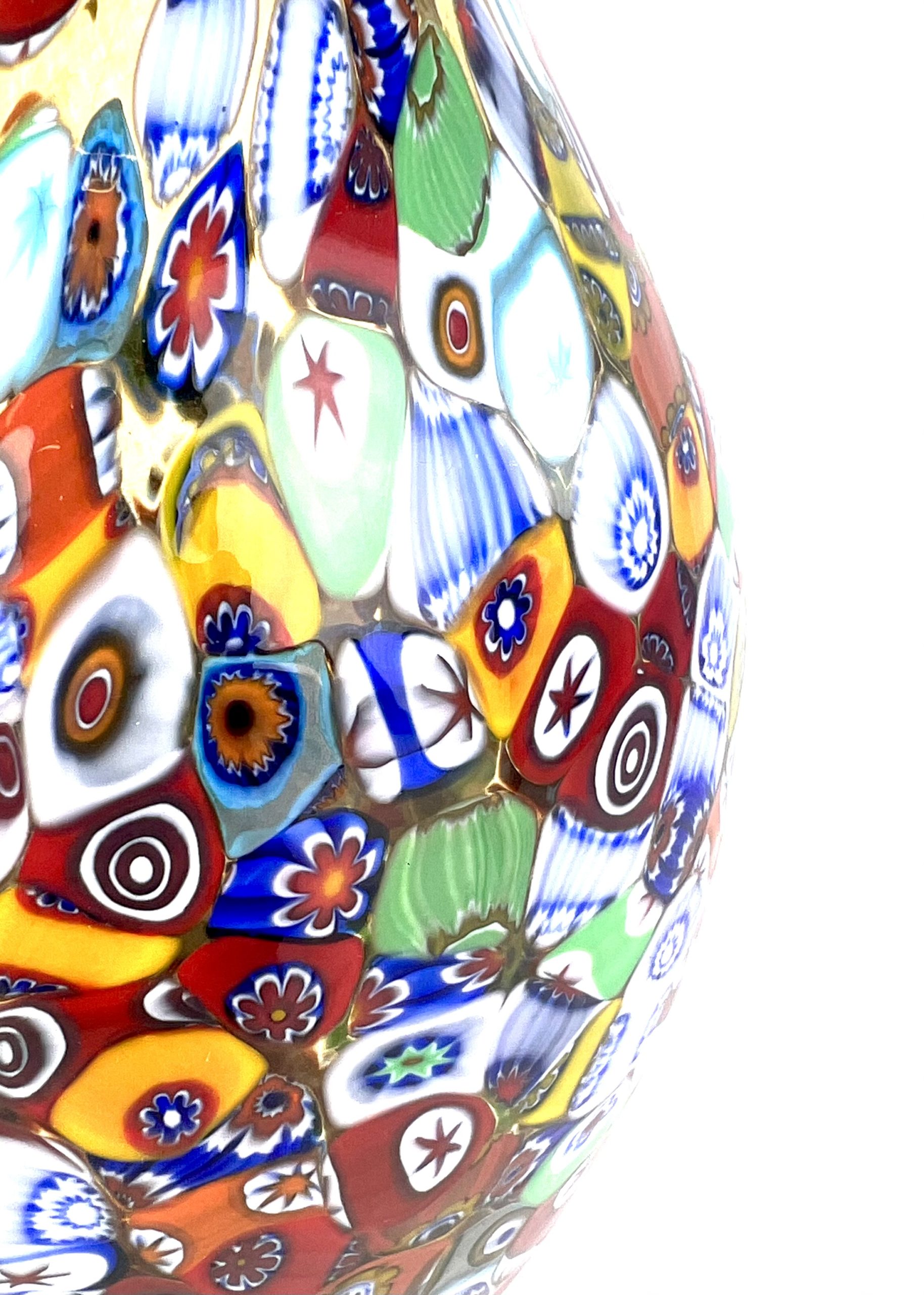 Vaso in vetro soffiato di Murano ricoperto di murrina millefiori con fascia di colore sulla parte superiore.