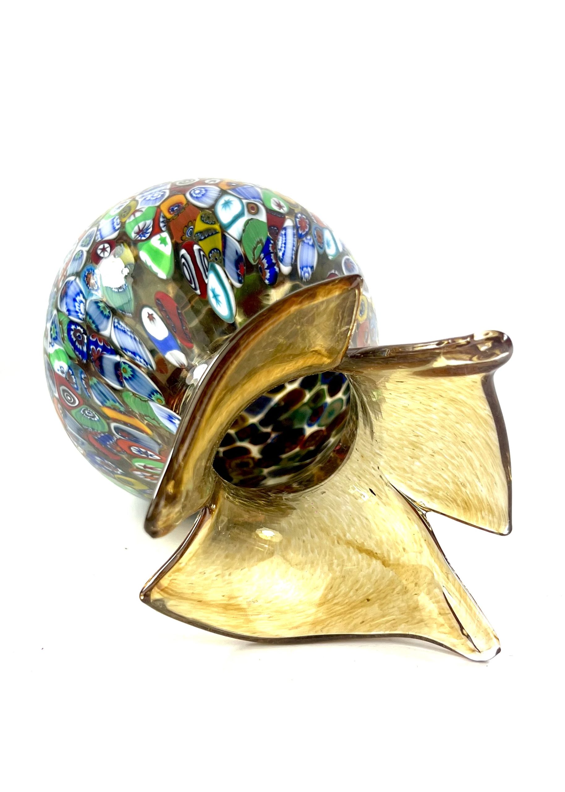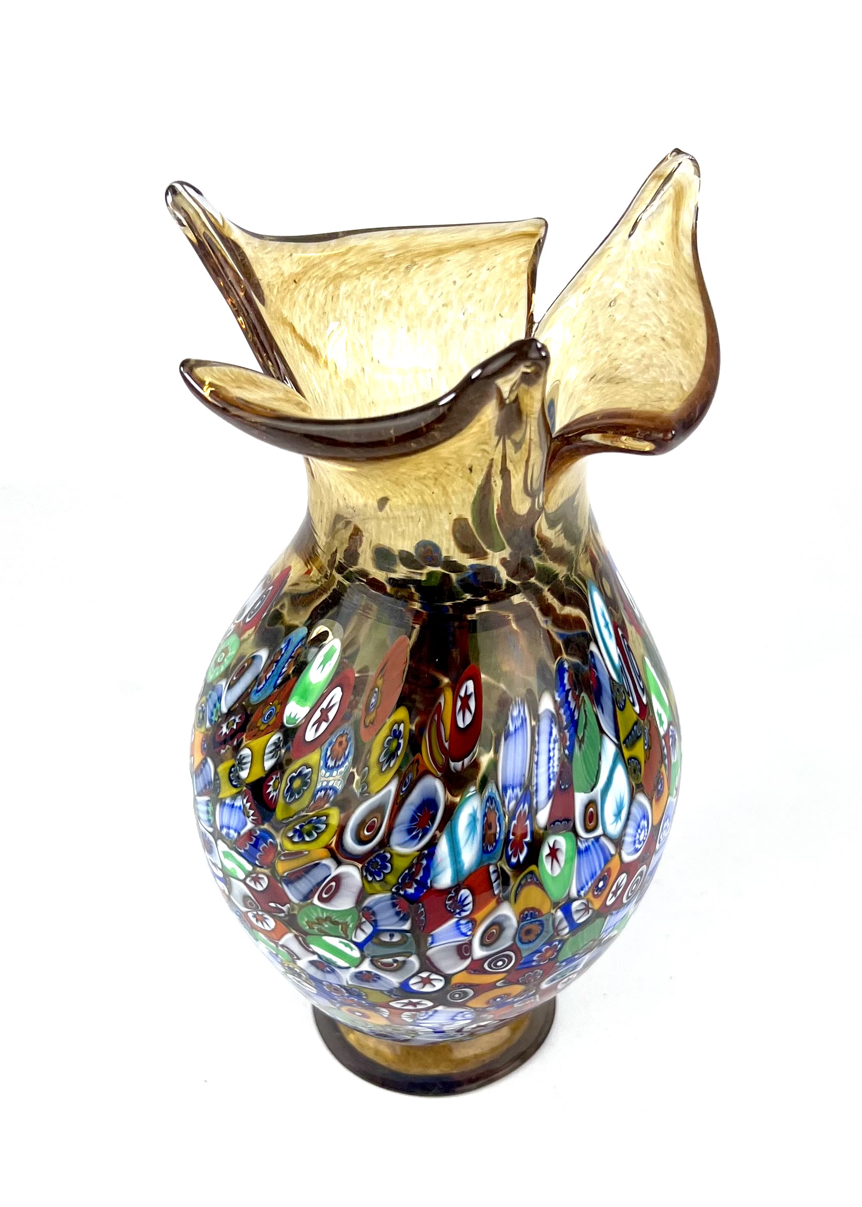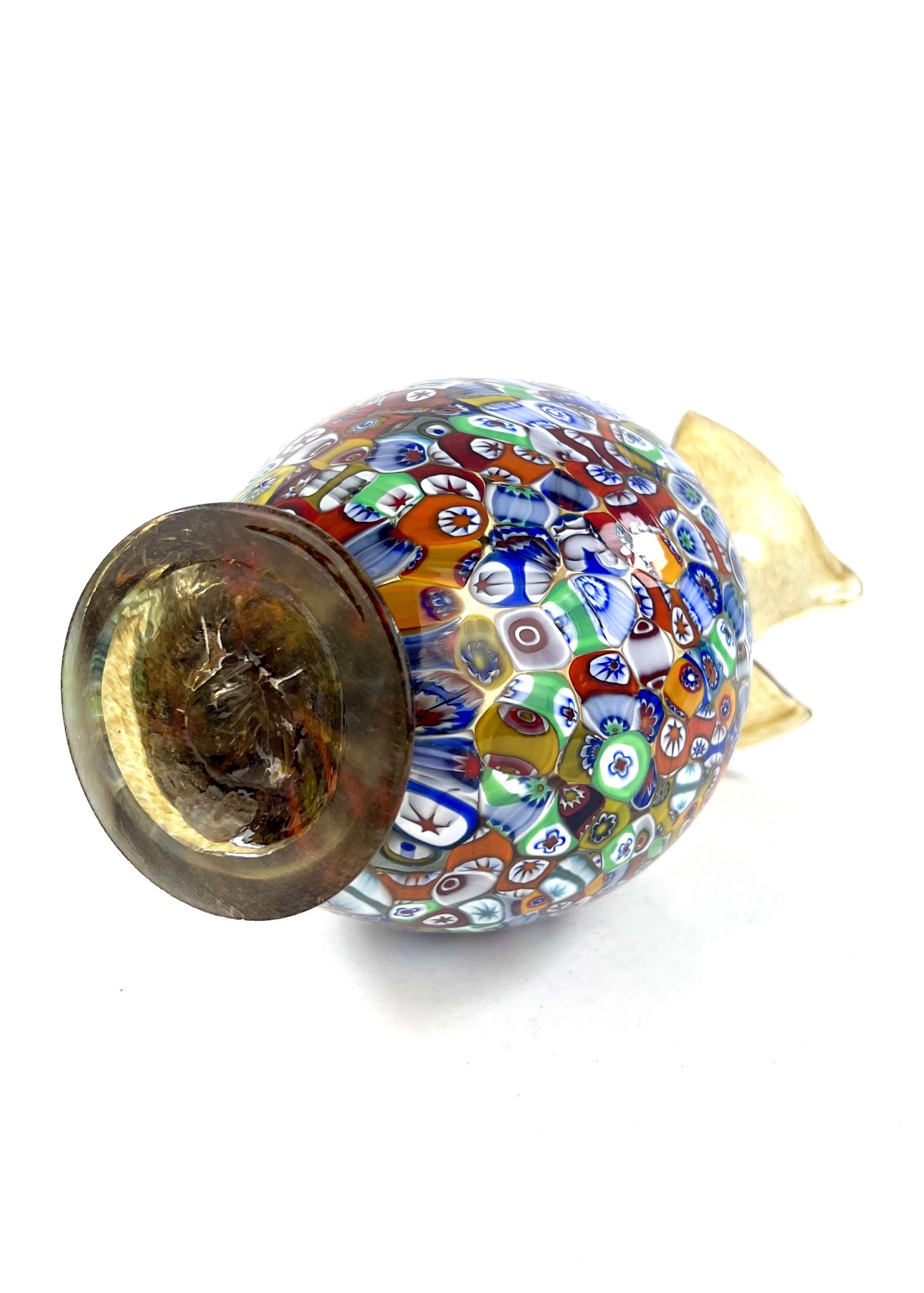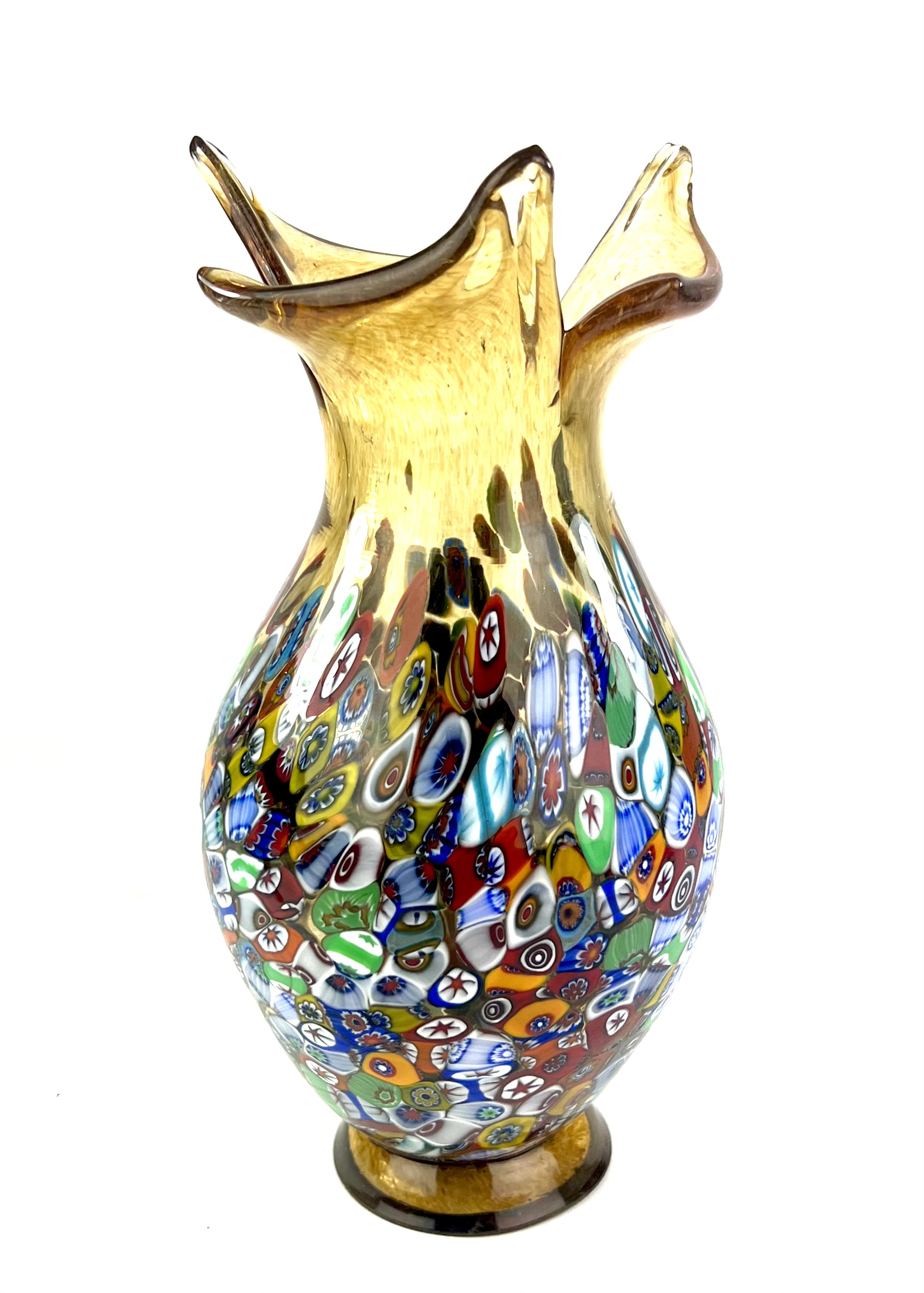 Vaso in vetro soffiato di Murano ricoperto di murrina millefiori con fascia di colore sulla parte superiore.