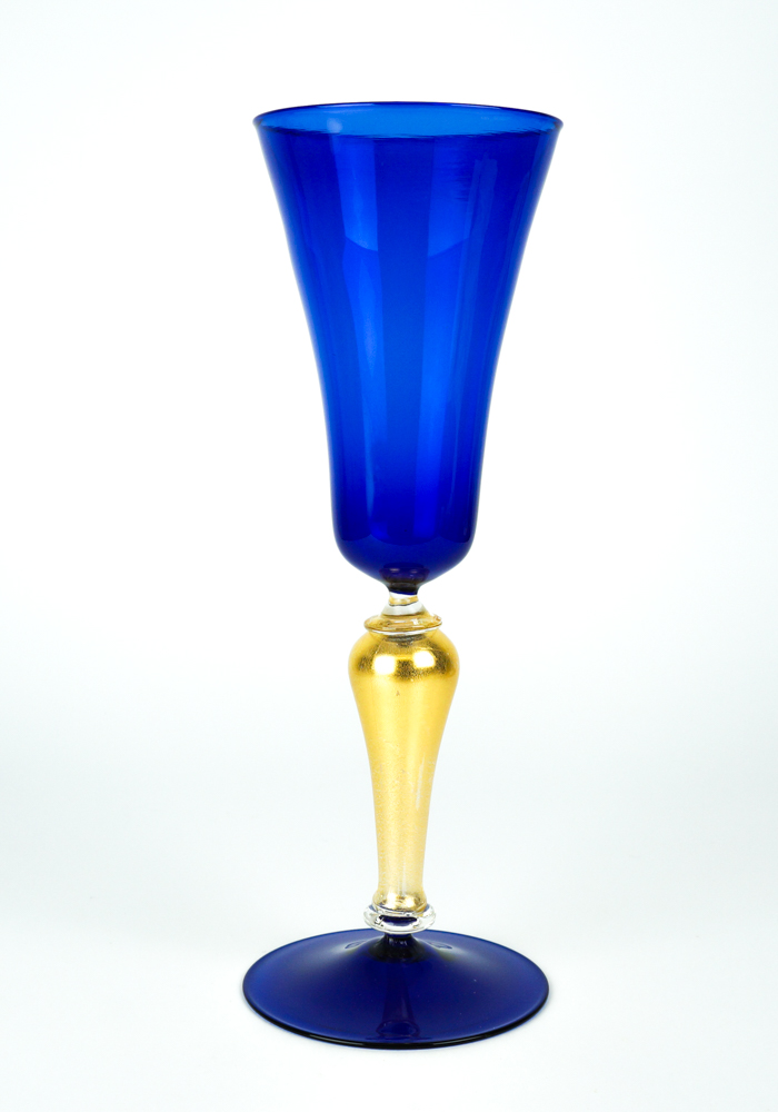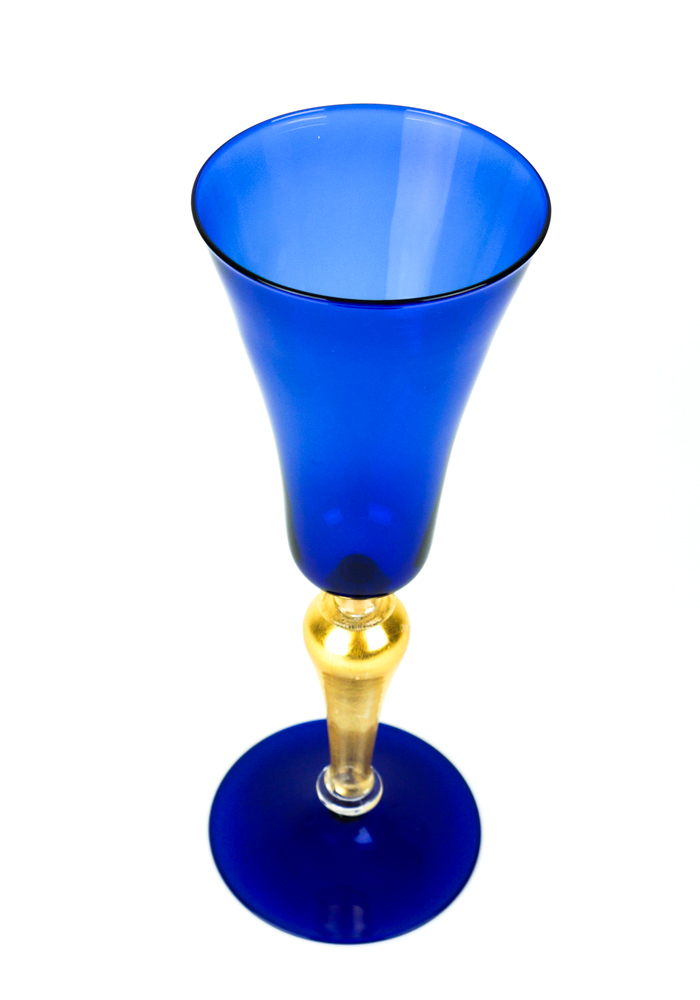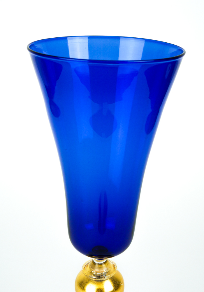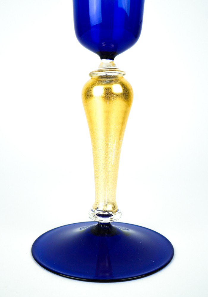Re Artù è un calice di colore blu cobalto con gambo in foglia oro 24 kt, eseguito interamente a mano con la tecnica della lavorazione del vetro soffiato di Murano.