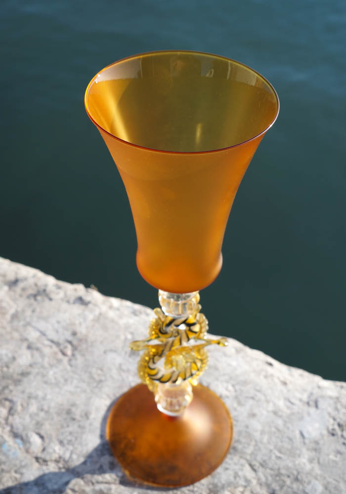 Sahara è un calice esclusivo di colore ambra satinato con gambo in oro 24 kt e decorazioni in zanfirico, eseguito interamente a mano in vetro soffiato di Murano.