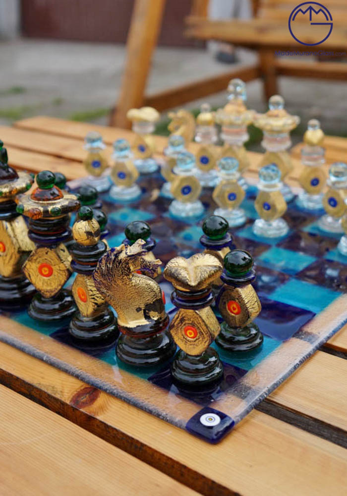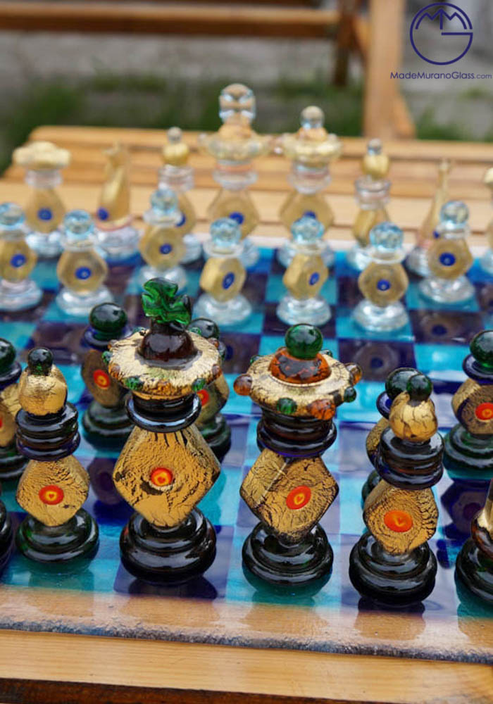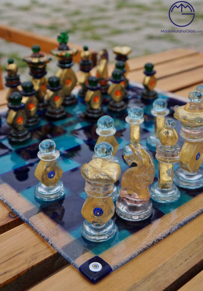 Esclusiva scacchiera Murano vetro artistico eseguita interamente a mano con colori blue, acqua mare, verde con murrina millefiori e foglia d’oro 32kt. Per dare luce a questa fantastica opera si necessitano due tecniche di lavorazione del vetro: uno eseguire la scacchiera con una piastra dando una forma quadrata con superficie liscia, la seconda è eseguire uno a uno i pedoni con la tecnica della lavorazione vetro a lume, processo molto lungo e meticoloso, con un risultato finale unico e inimitabile.