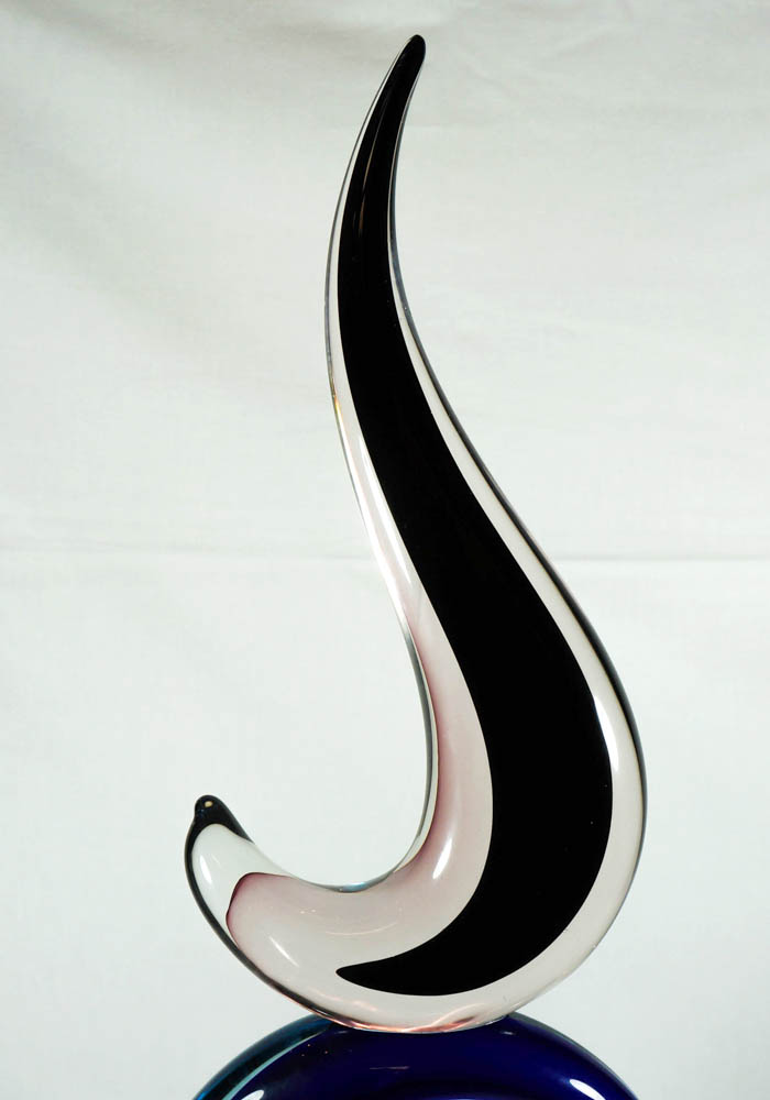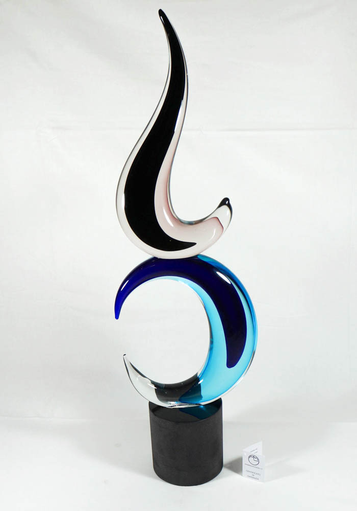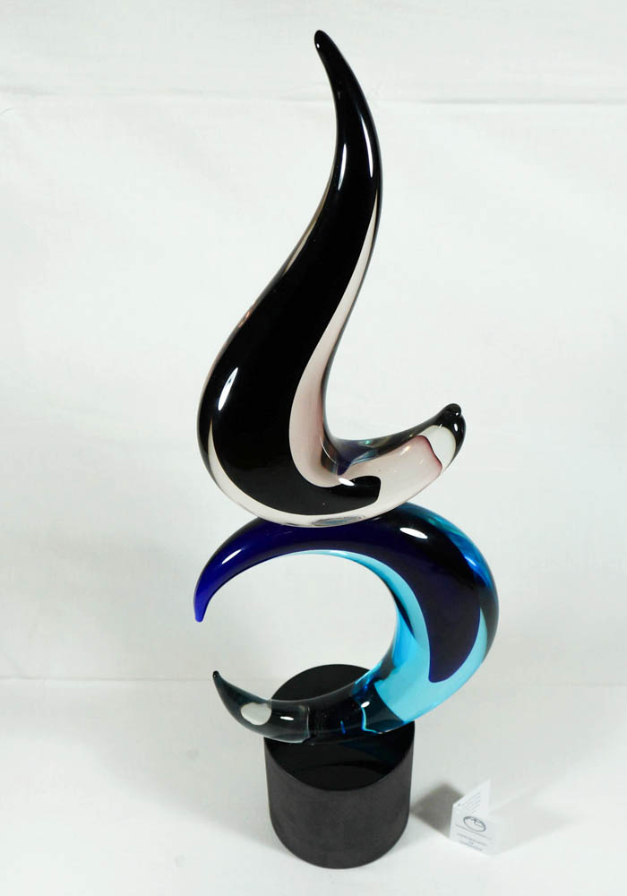 Fantastica scultura astratta in vetro Murano con decorazioni di colore blue, acqua mare, viola, nero e cristallo. Per eseguire quest’opera è necessario usare due tecniche di lavorazione del vetro: uno modellare il vetro massiccio a caldo dando forma e colori unici, la seconda è la molatura, per rendere la base lucida. Per completare l’unicità, il Maestro vetraio (D’onà) incide a freddo la propria firma nell’opera, rendendola inimitabile.