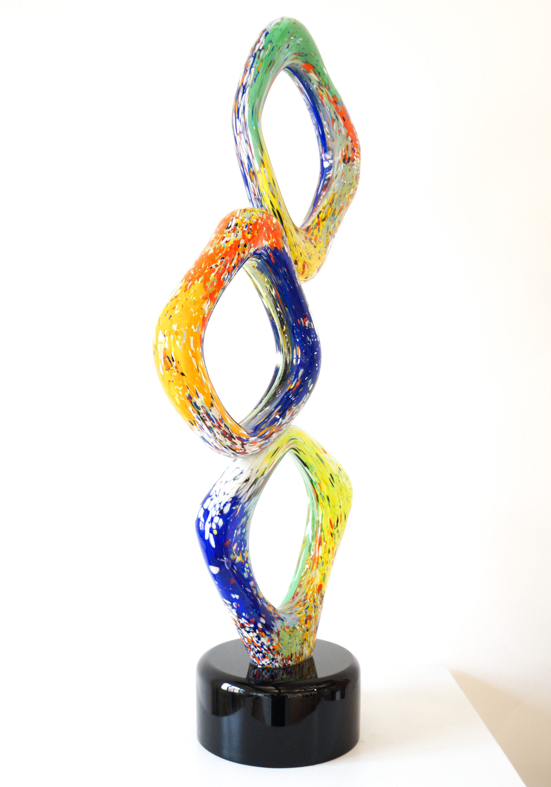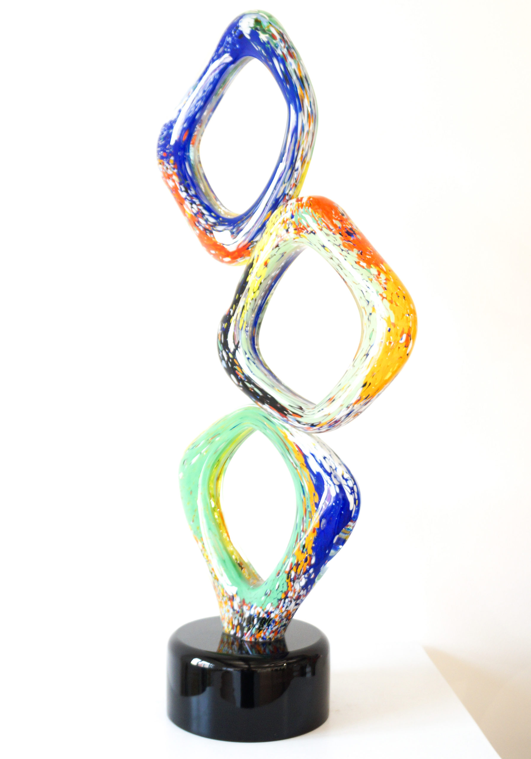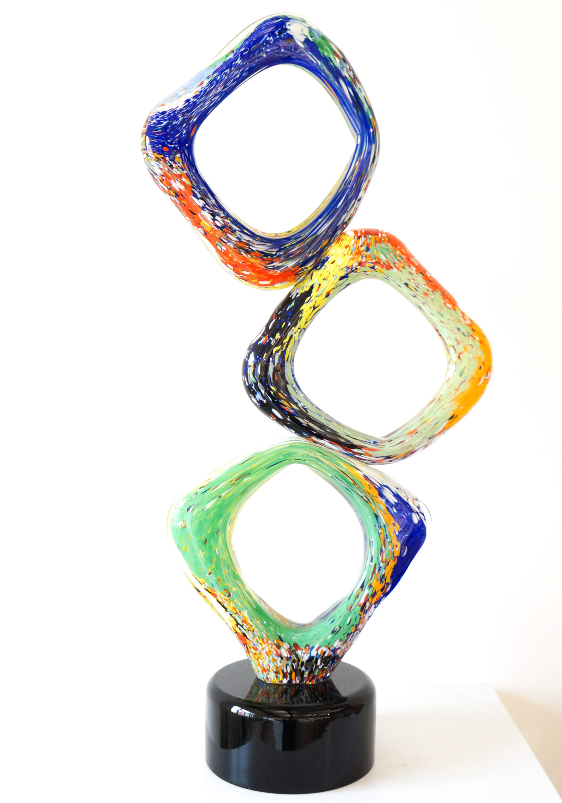 Rhombus – Scultura astratta in Vetro di Murano multicolore a tre piani con base colore nero.