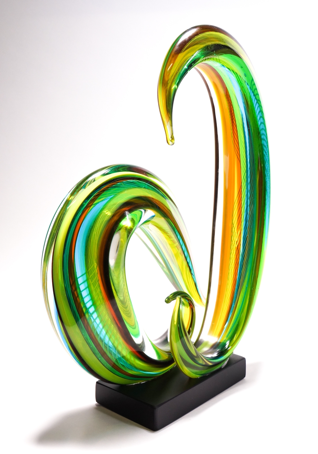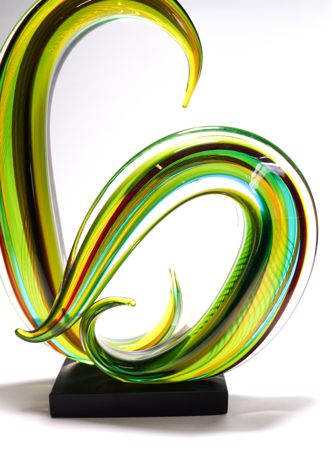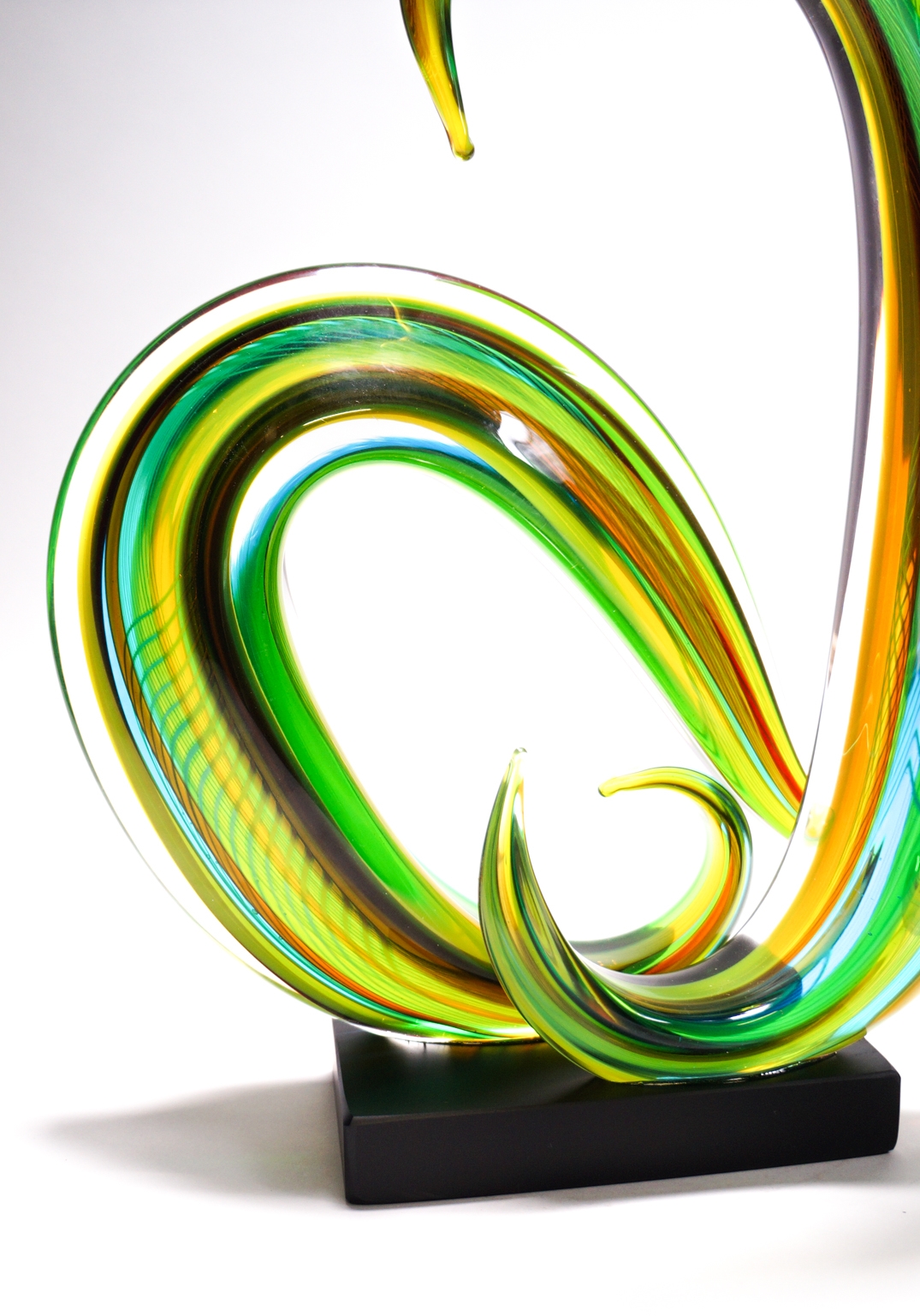 Scultura Onda astratta in Vetro di Murano colore Sommerso verde, ambra, acquamarina e Filigrana con base colore nero.