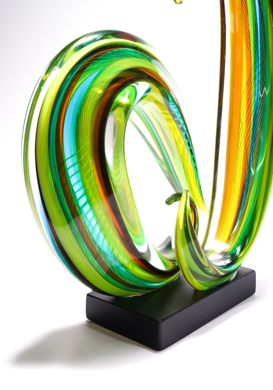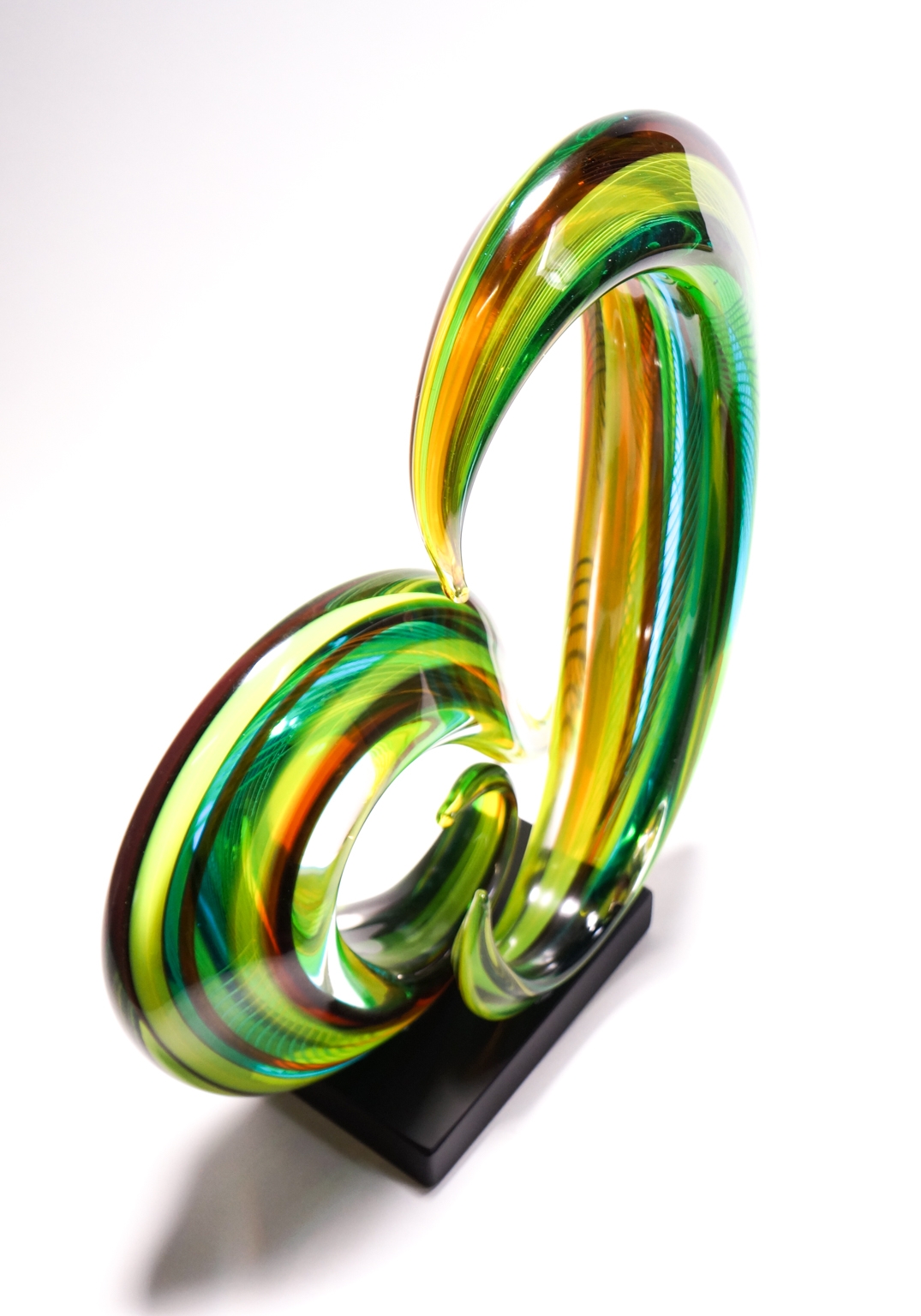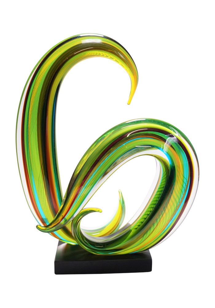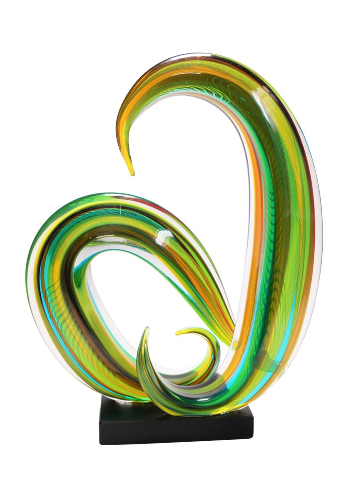 Scultura Onda astratta in Vetro di Murano colore Sommerso verde, ambra, acquamarina e Filigrana con base colore nero.