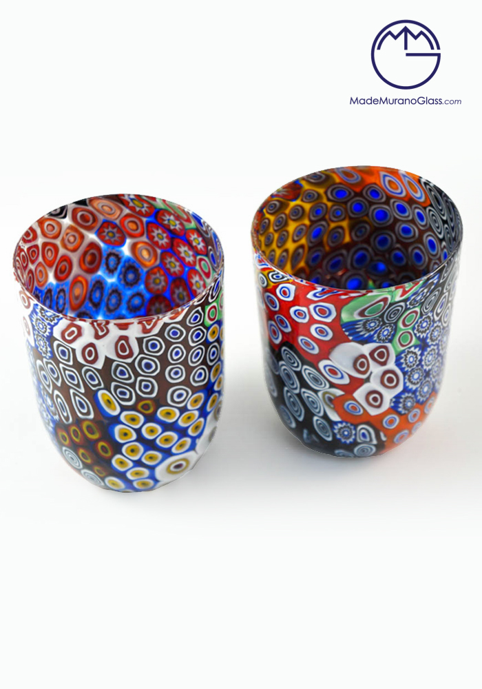 Esclusivi vetri di Murano in un set di 2 bicchieri “patchwork” per acqua o vino con murrina millefiori assortita.