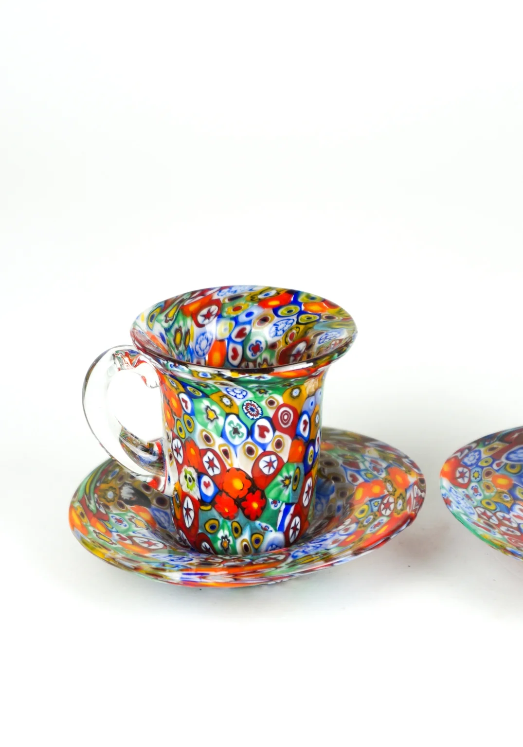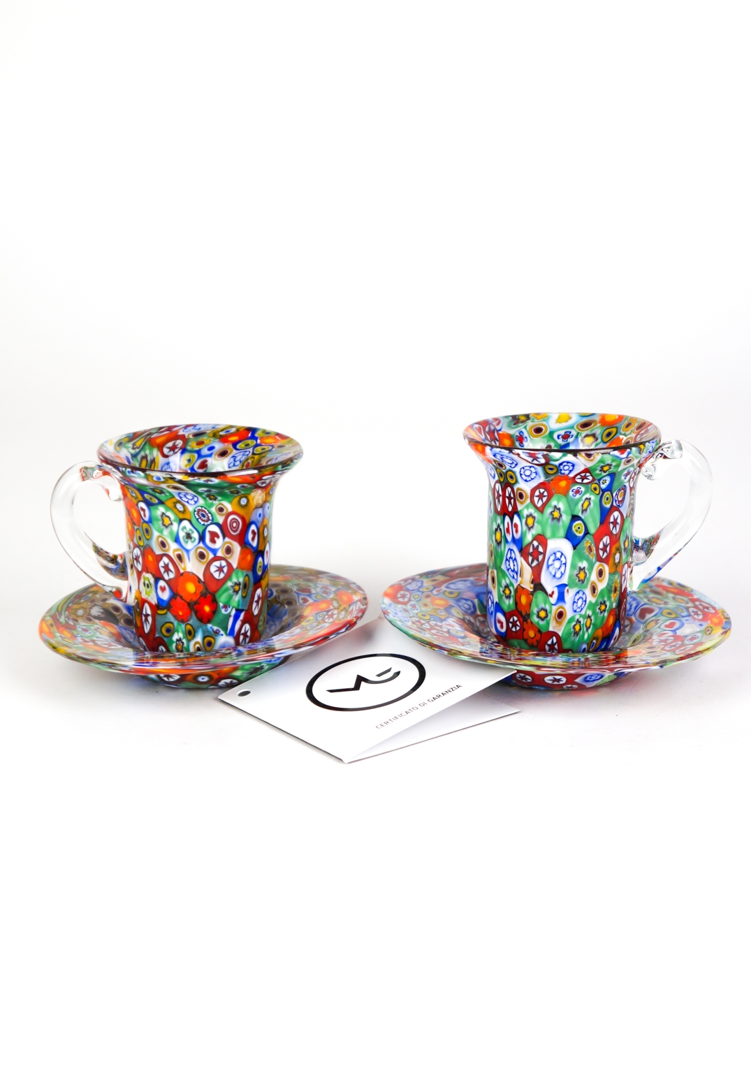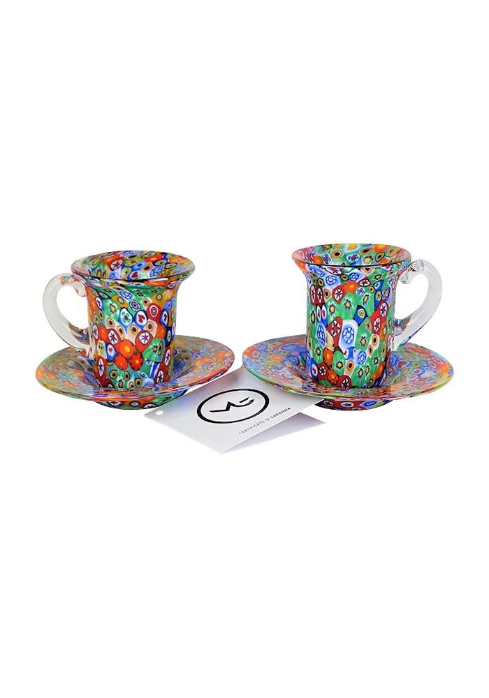 Elegantissimo set di 2 tazzine + 2 piattini in vetro soffiato di Murano interamente lavorato a mano con murrine millefiori e manici in foglia oro 24kt.