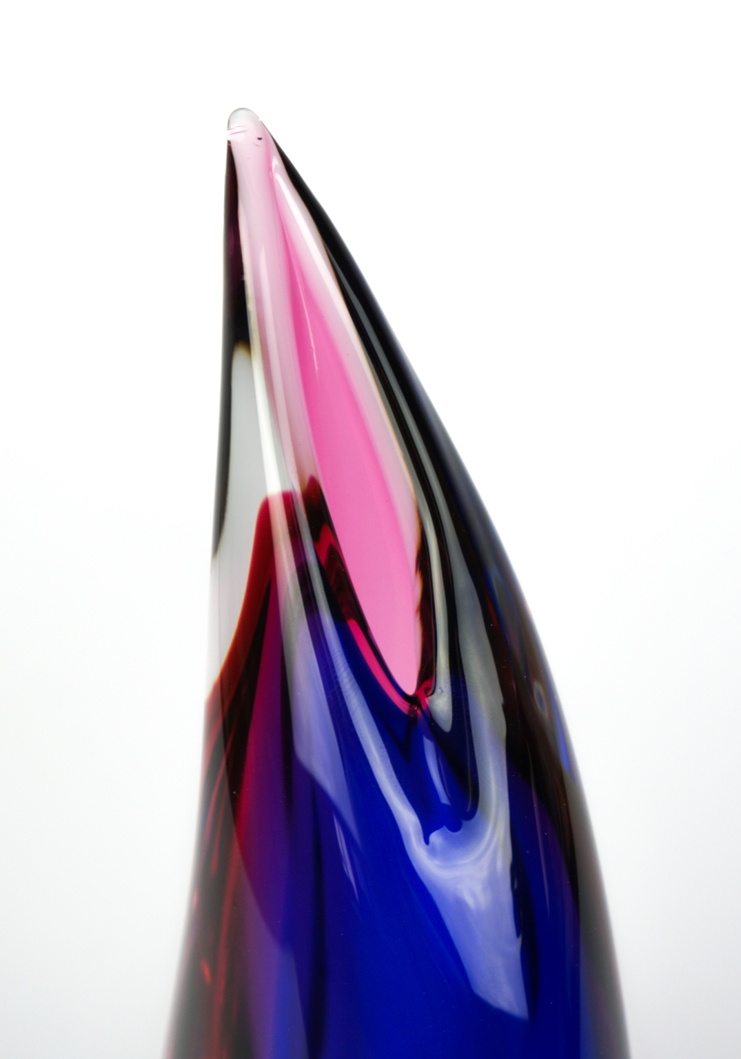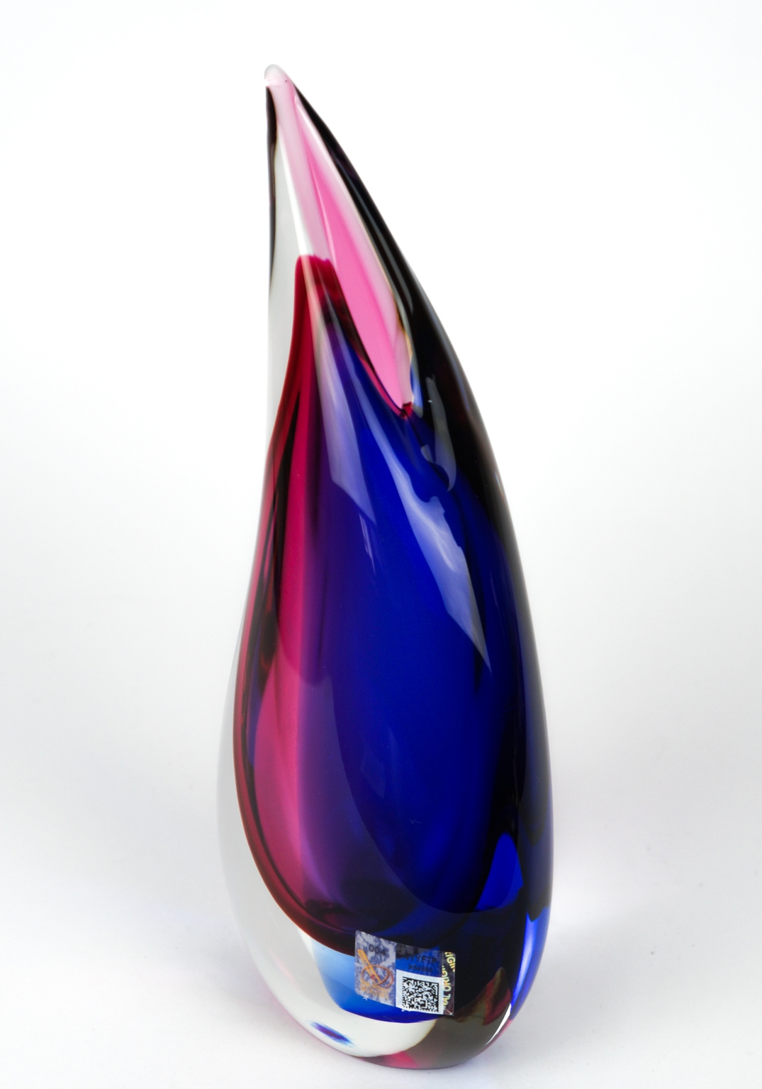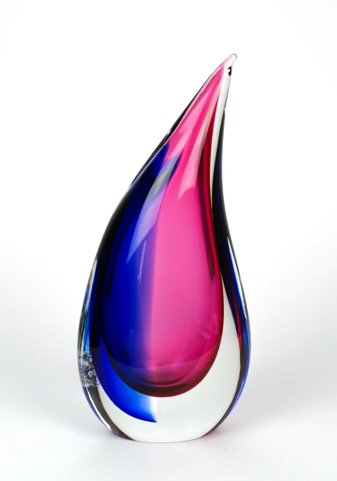Vaso in vetro soffiato di Murano interamente fatto a mano a forma di goccia, colore blu, rubino e cristallo trasparente.