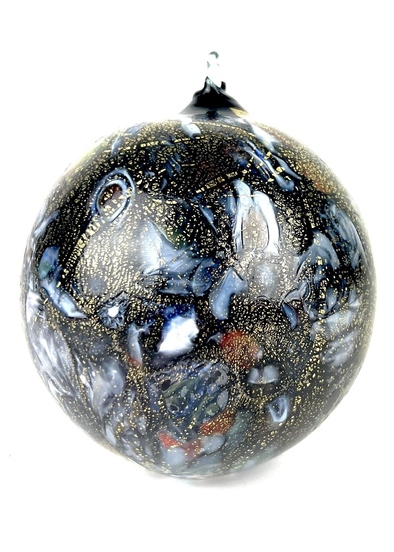 Fantastica Pallina di Natale in vetro di Murano nero con decori in Murrina Millefiori e vera foglia Oro 24kt.