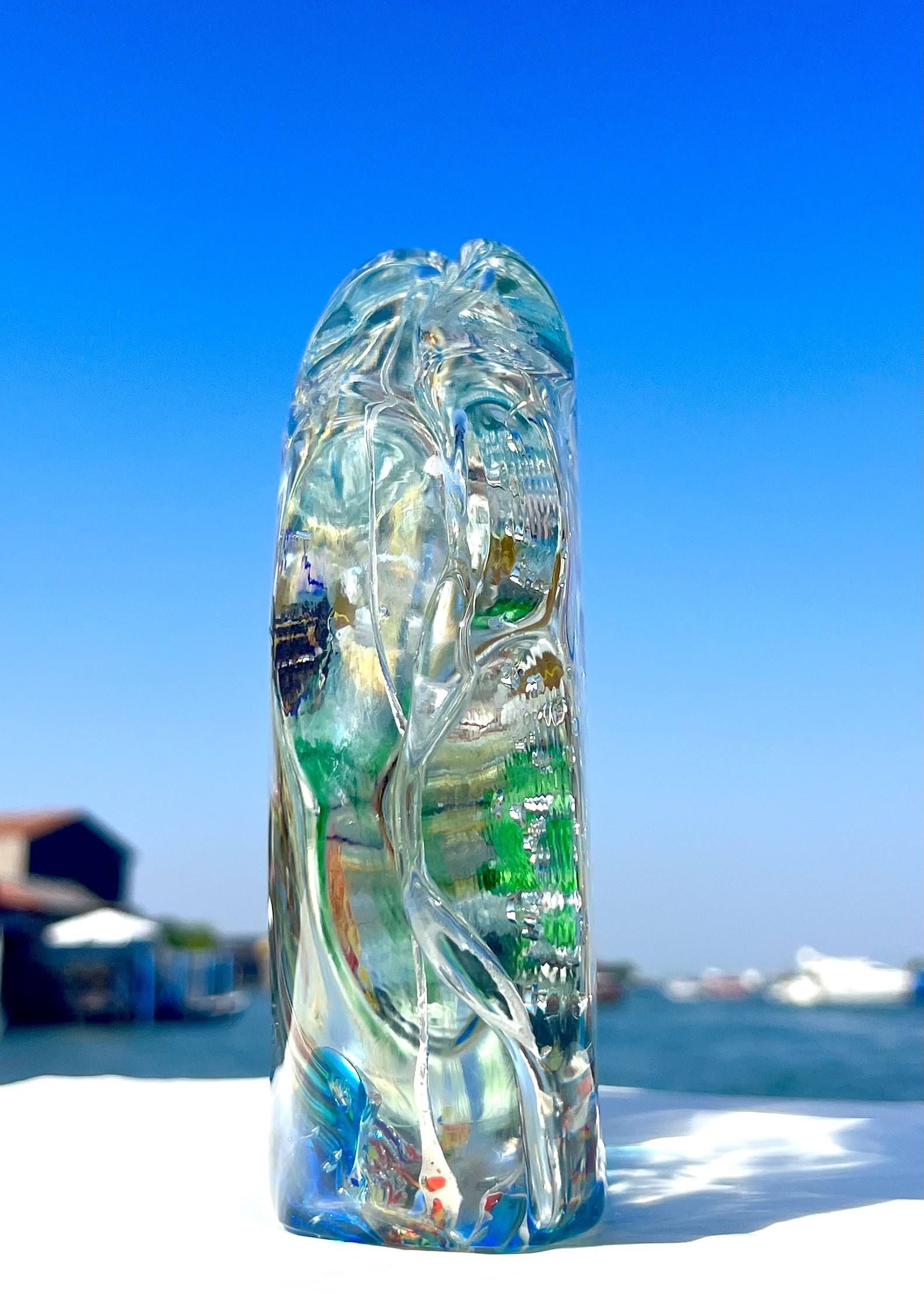 Scultura acquario a forma di mezzaluna in vetro di Murano.