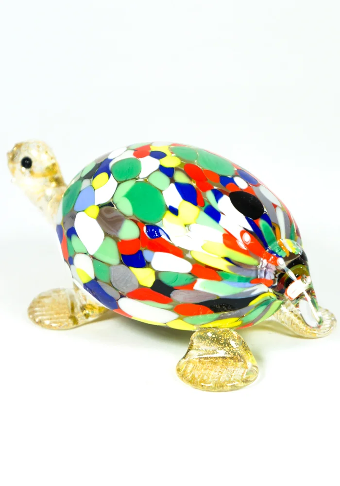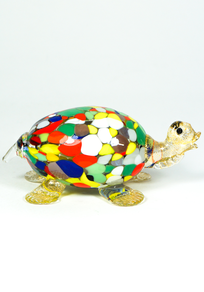Simpaticissima Tartaruga in vetro soffiato di Murano con lavorazione a “Mace” di vetro multicolore e particolari in foglia d’oro 24kt.