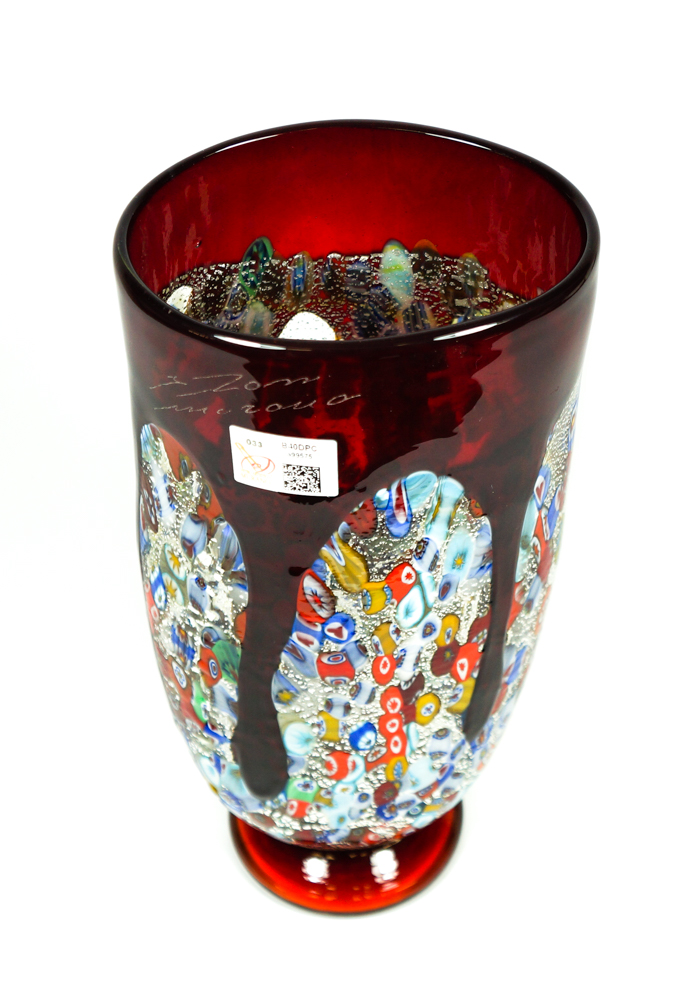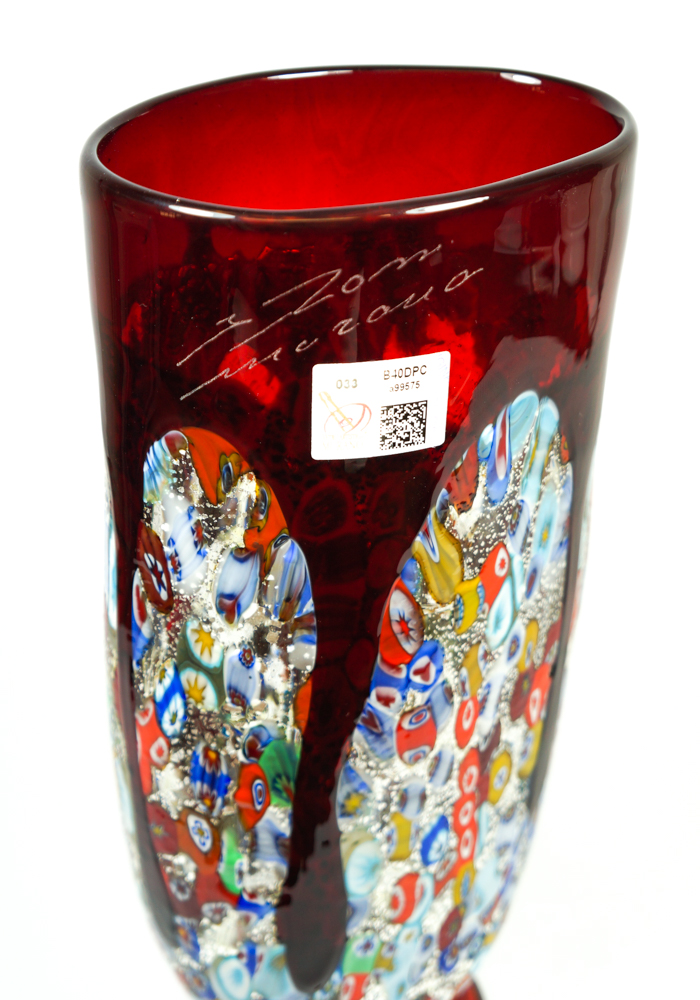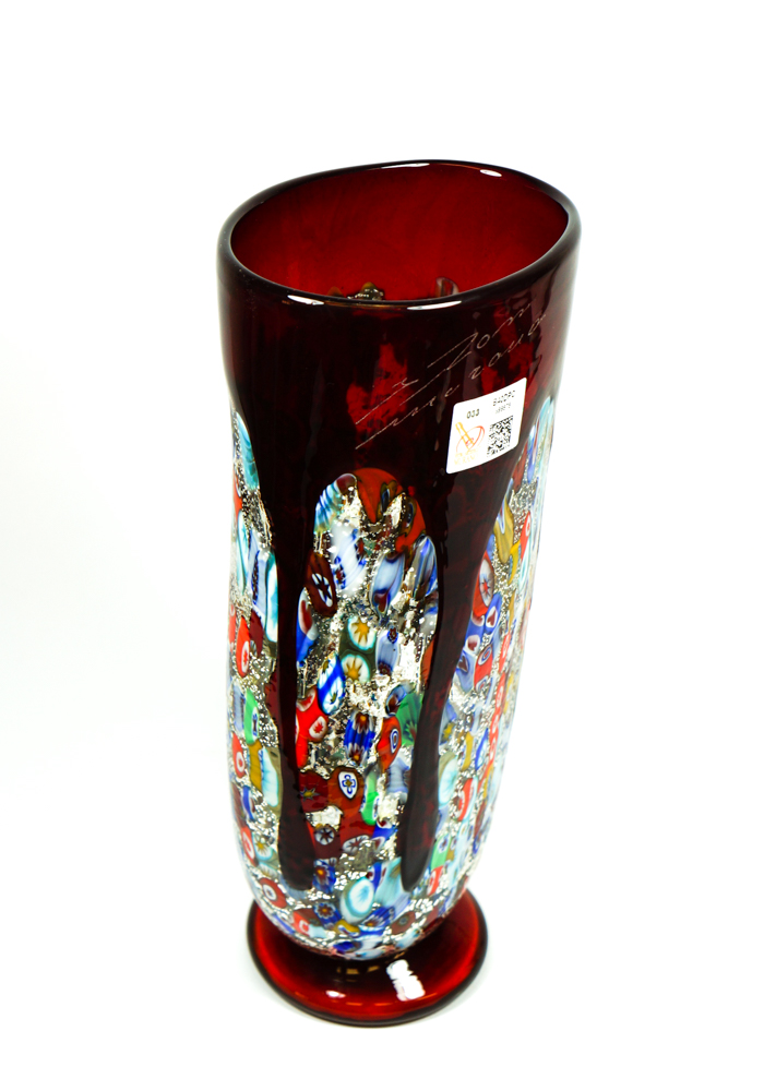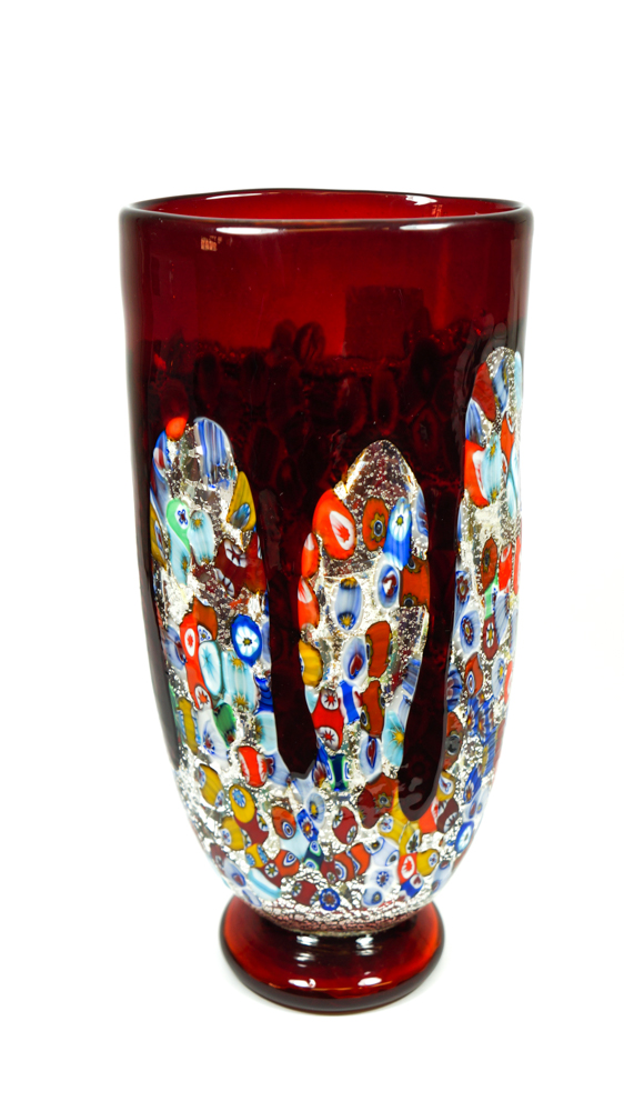 Tempera è un vaso in vetro soffiato di Murano colore rosso con decorazioni in rilievo di Murrina Millefiori e foglia argento.