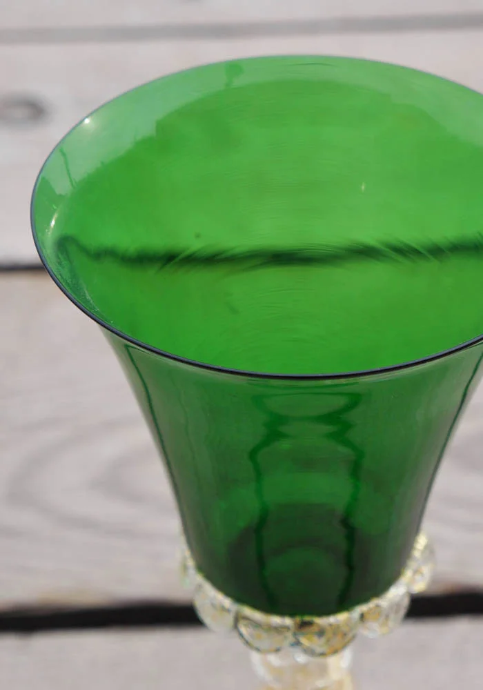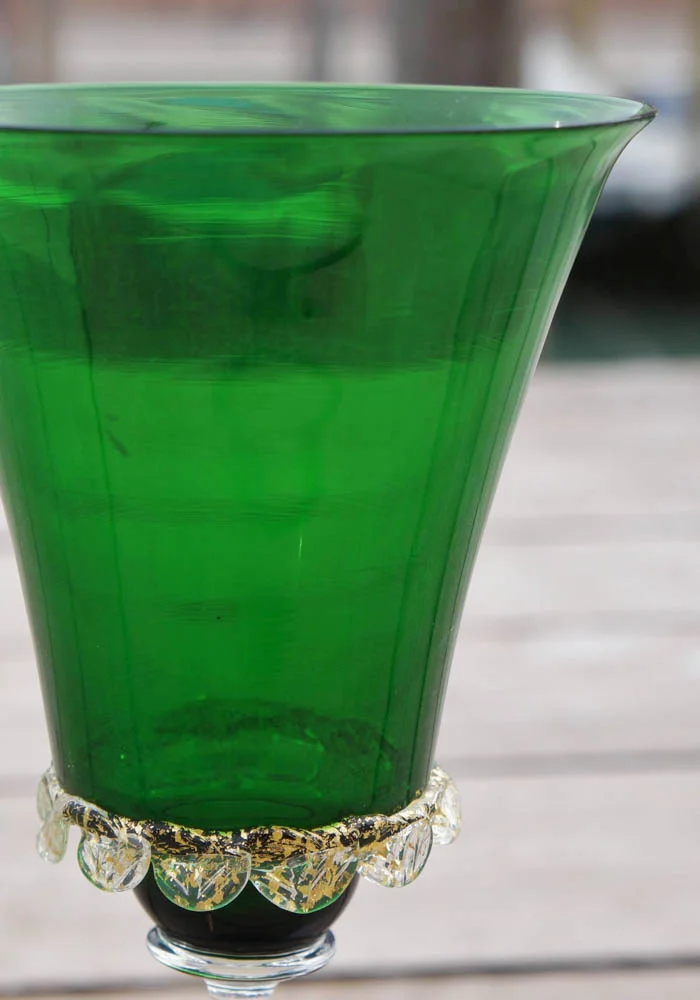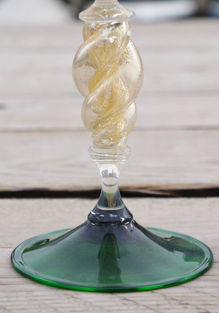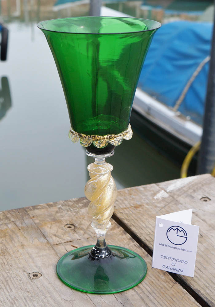 Magnifico calice in vetro Murano color verde con decorazioni a spirale nel gambo in foglia d’oro 24kt.