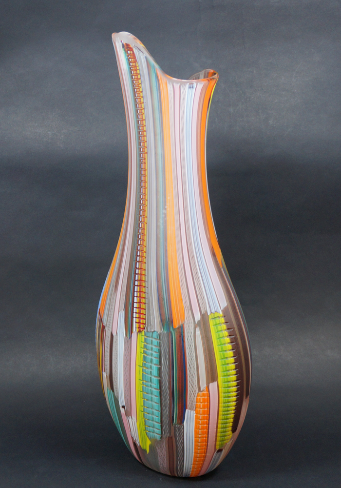 Tessuto è un vaso in vetro di Murano interamente fatto a mano con colori assortiti in pasta di vetro e inciso a freddo nelle molerie dell’Isola veneziana.