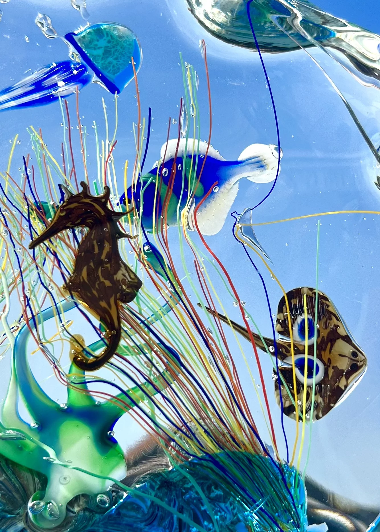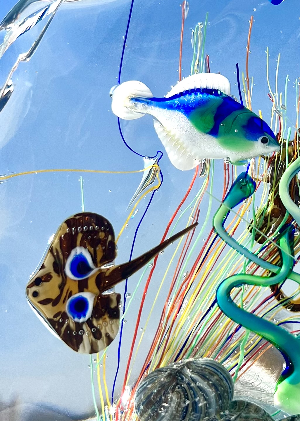 la lavorazione del vetro a lume e la lavorazione vetro sommerso, la prima per eseguire i pesci e la seconda per sommergerli in una cascata di vetro fuso, rendendo il tutto unico e inimitabile.
