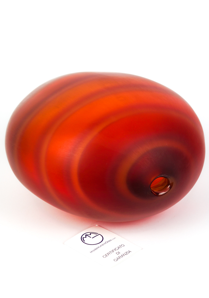 Tramonto è un fantastico vaso di grosso spessore in vetro di Murano lavorato a mano colore rosso con decorazione a fasce rosse e riflessi ambra. Opera unica ed esclusiva creata dal nostro maestro vetraio Roberto e firmata con incisione a freddo dall’artista. È un vaso moderno ideale per decorare elegantemente l’arredamento di ogni stanza della tua casa.