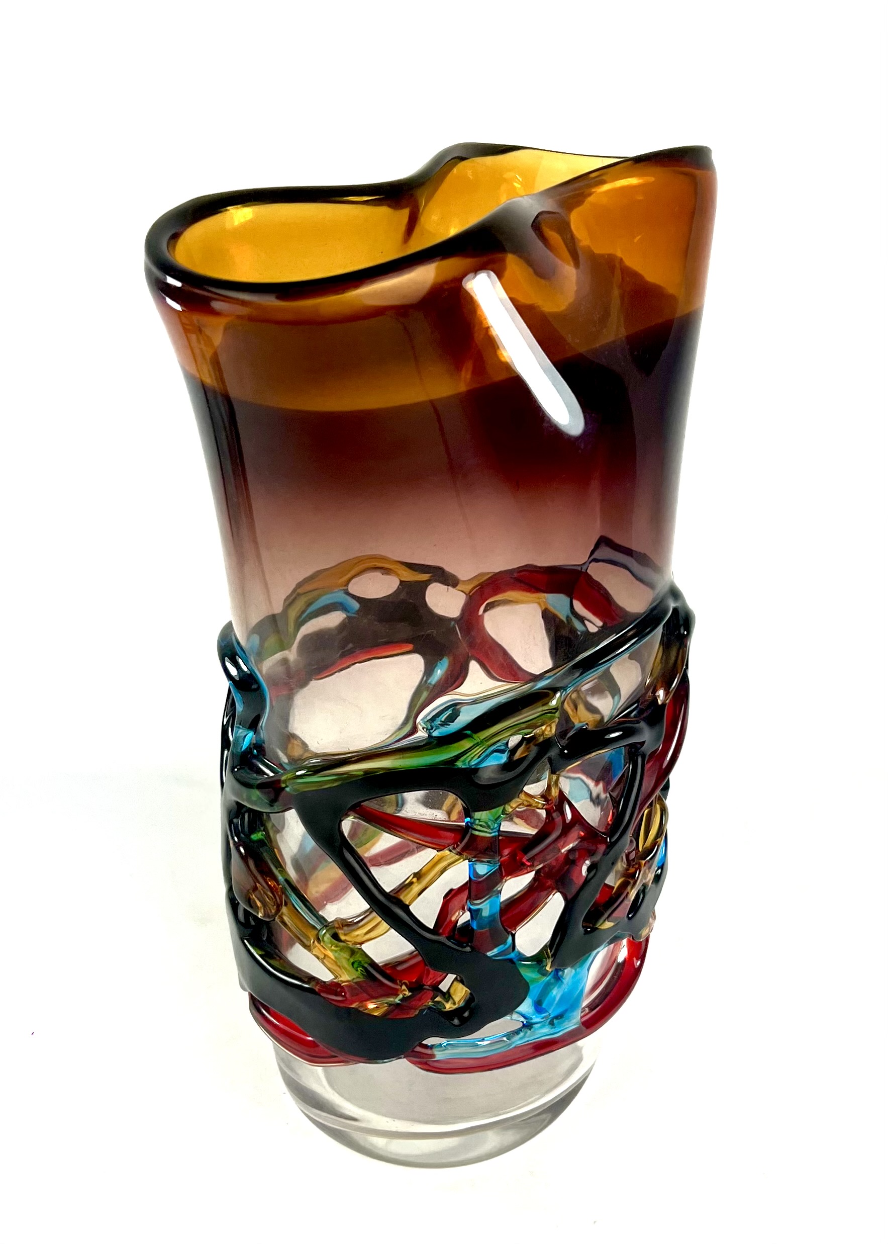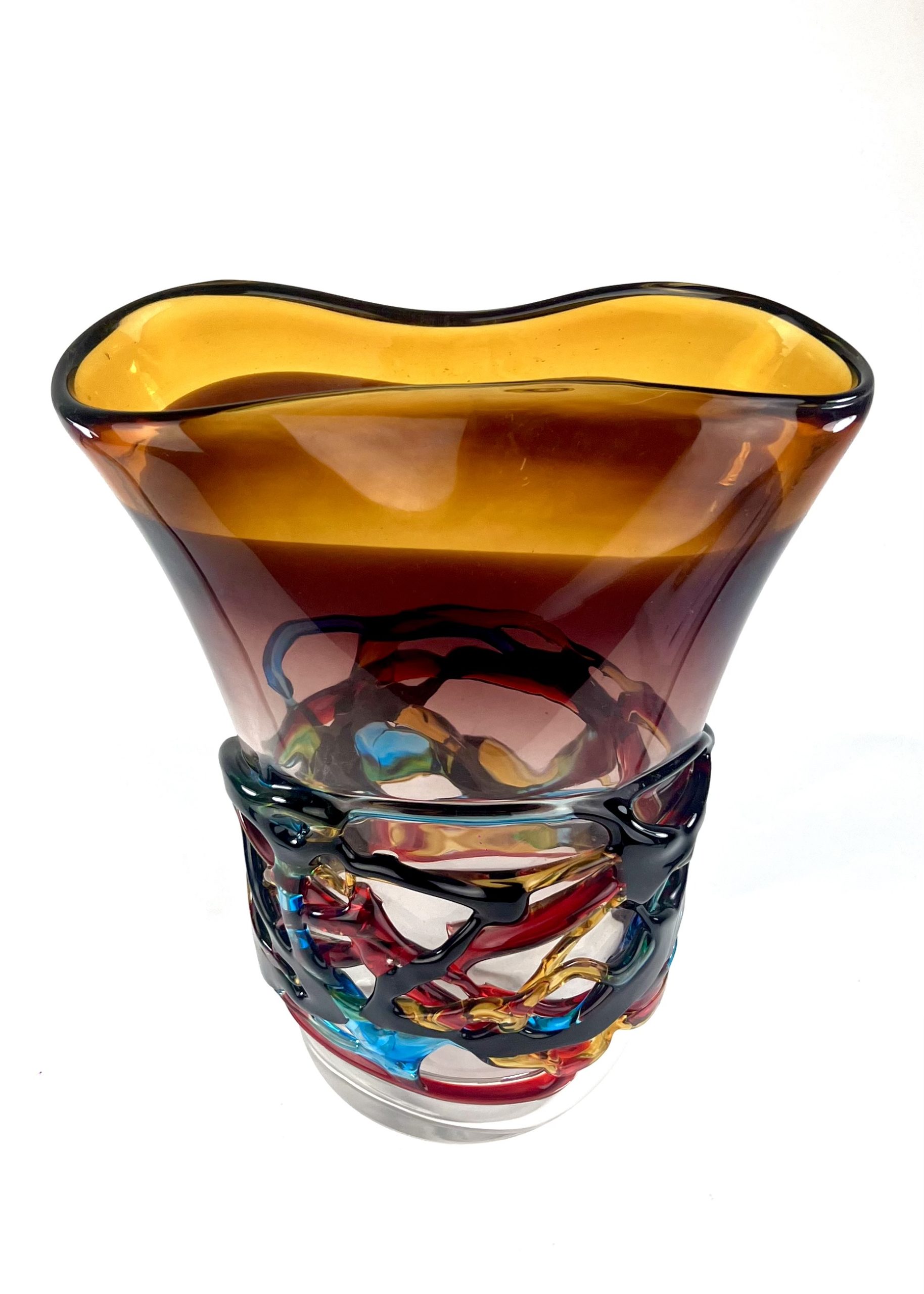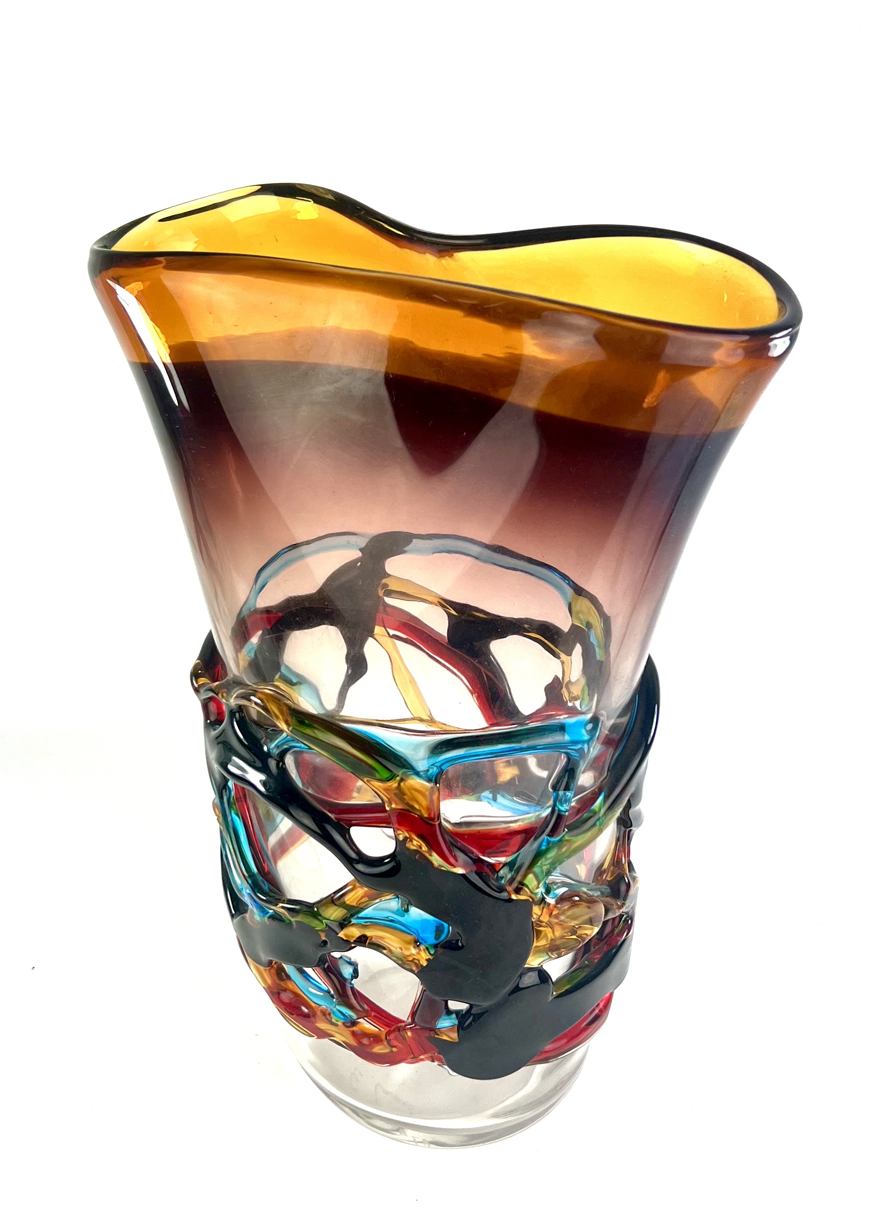 Una volta realizzato il vaso, gli artigiani di Murano lo ricoprono con colature di vetro in rilievo nei colori rosso, blu, azzurro e ambra.