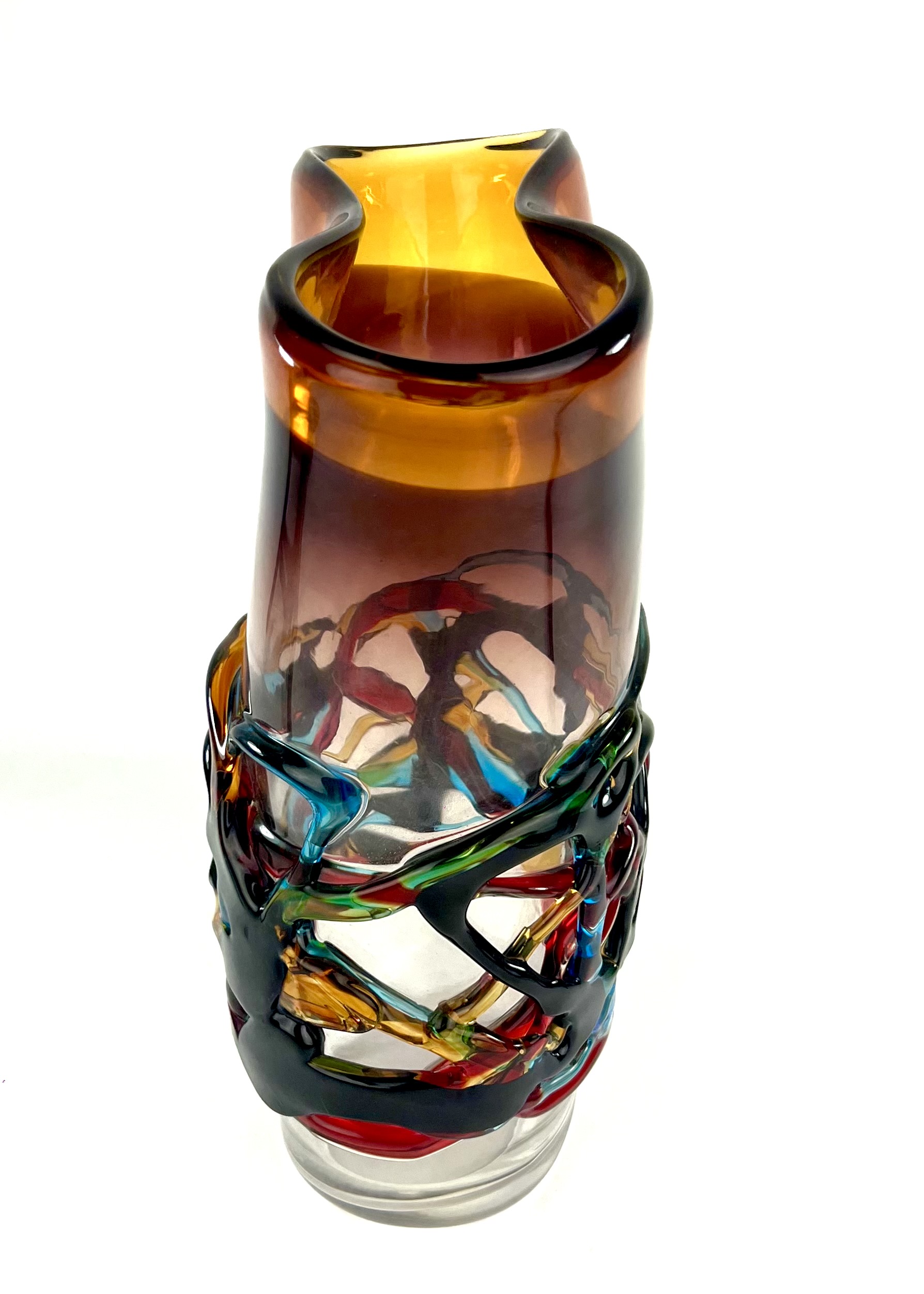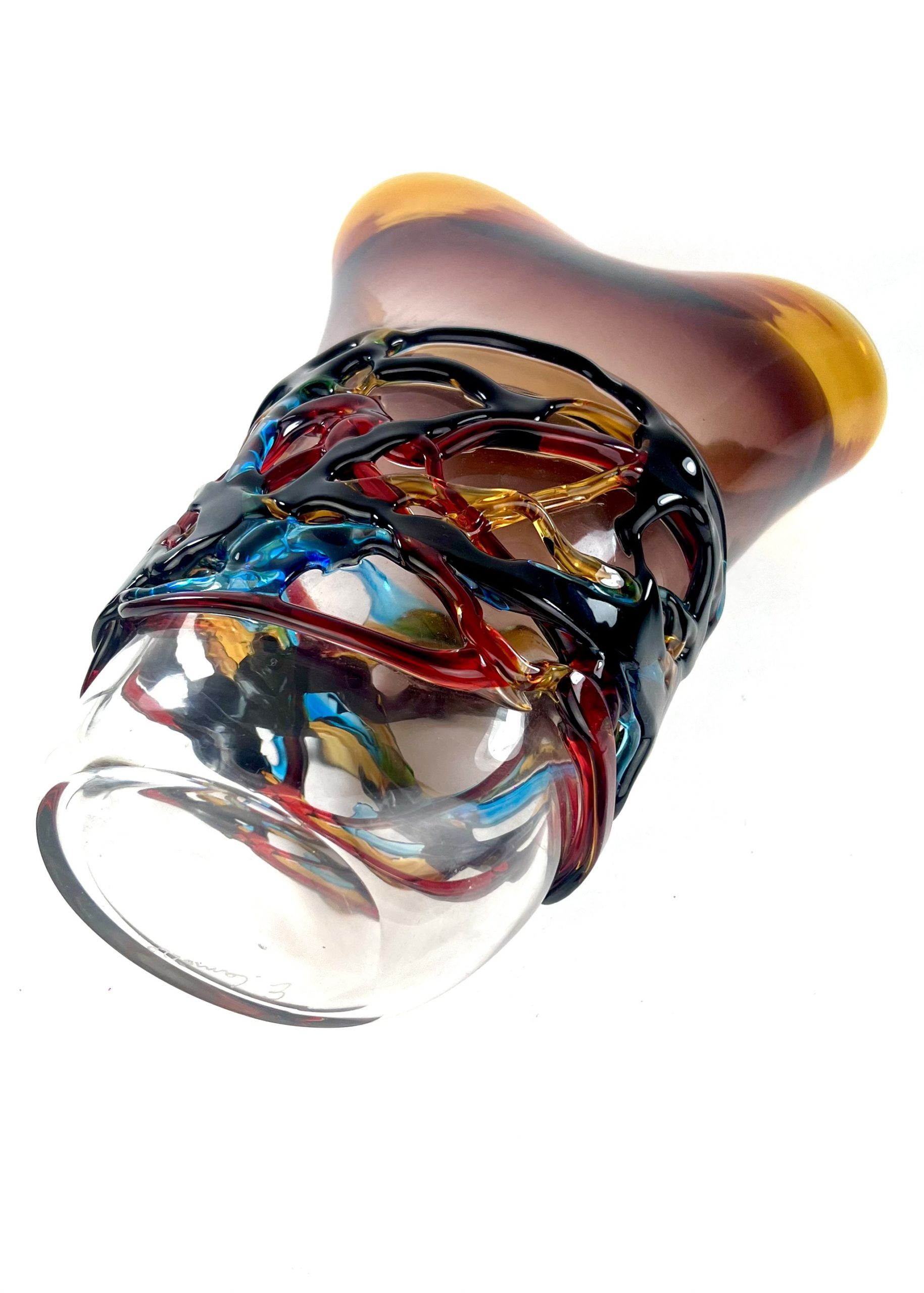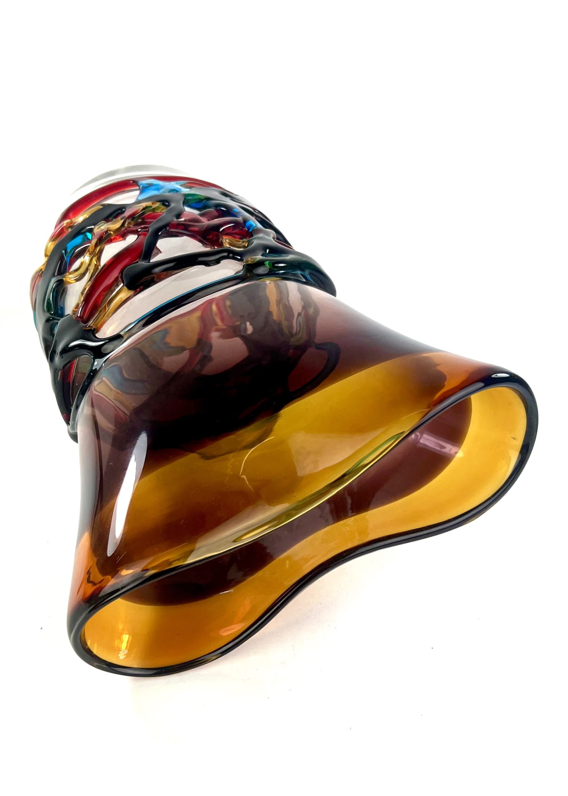 Una volta realizzato il vaso, gli artigiani di Murano lo ricoprono con colature di vetro in rilievo nei colori rosso, blu, azzurro e ambra.