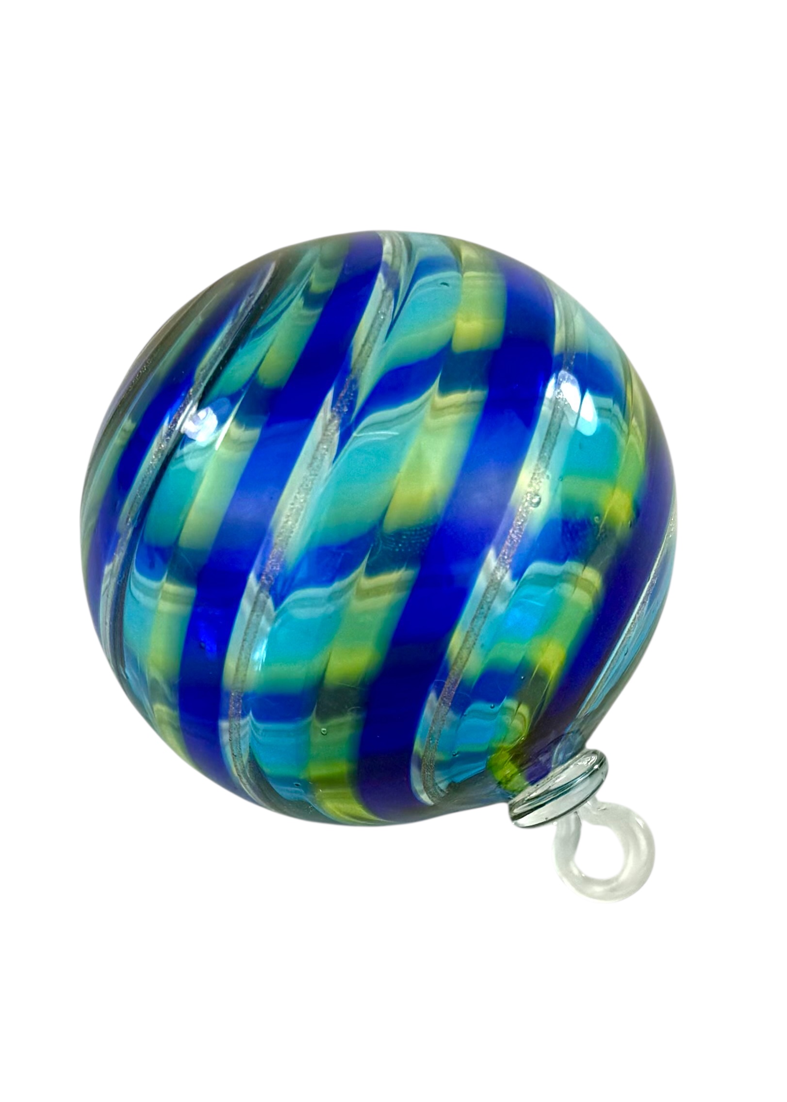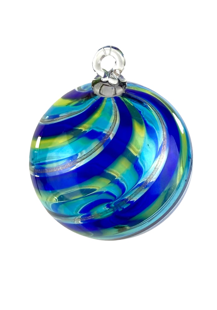 Pallina di natale in vetro soffiato di Murano con kanne di colore blu, verde chiaro, acquamarina e avventurina.