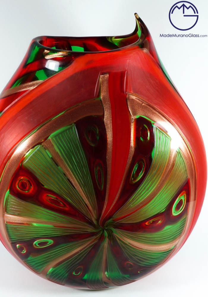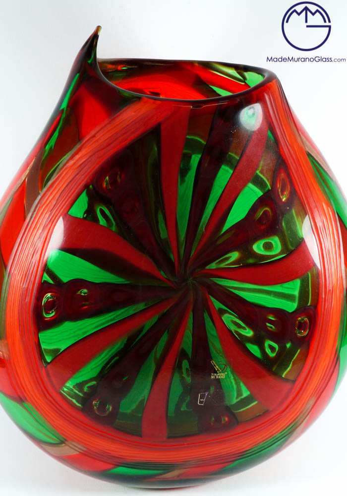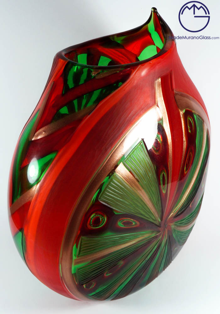 Esclusiva collezione vasi di Murano color rosso e verde con una lavorazione del vetro chiamata dai Maestri vetrai di Murano battuto (inciso). La lavorazione battuta viene eseguita a freddo in una moleria da grandi artisti dell’incisione del vetro. Pezzi di alta qualità unici al mondo per la sua lavorazione. Questa magnifica opera viene firmata dal Maestro. Ogni articolo è minimamente differente dalla foto essendo pezzi unici e fatti a mano.