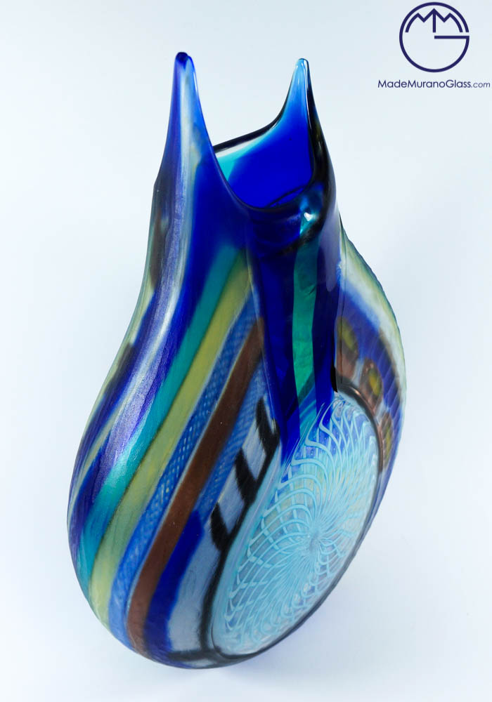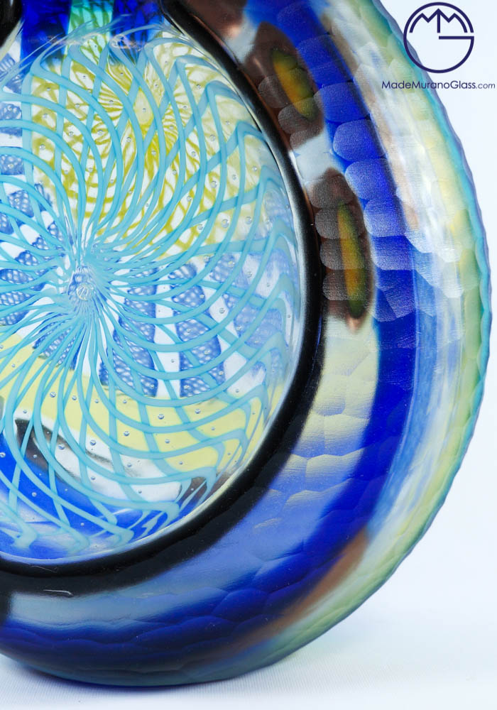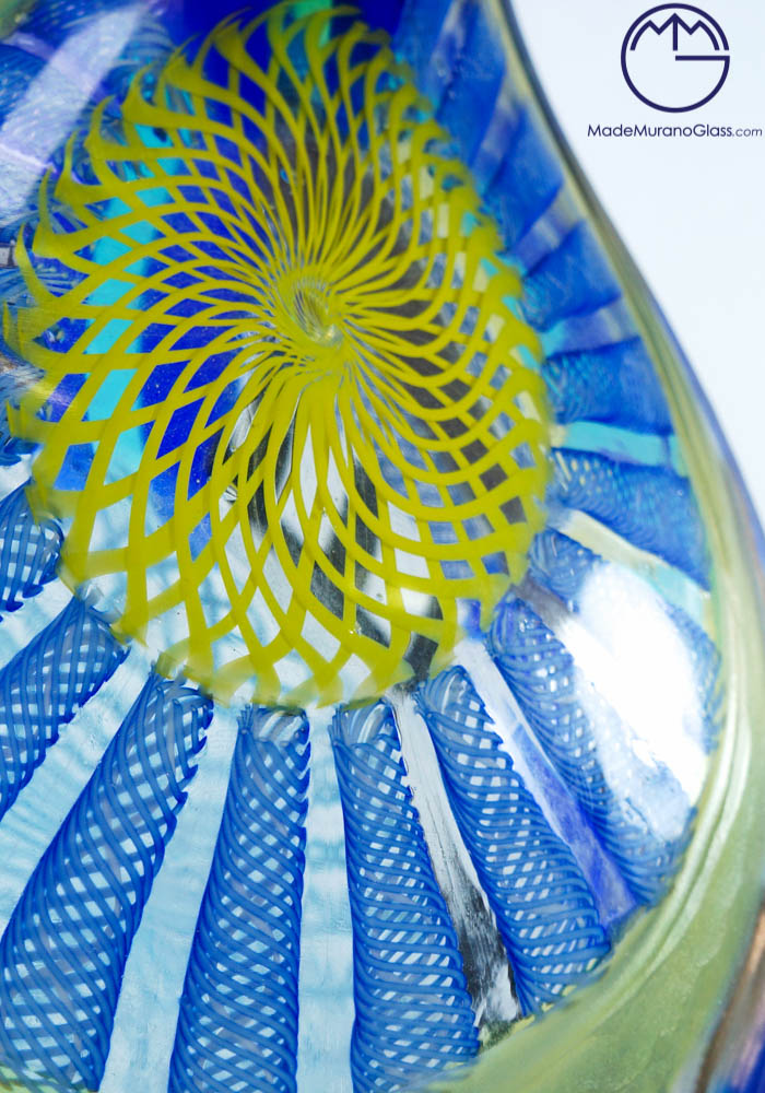 Esclusiva collezione vasi di Murano color blue, verde, giallo, acqua mare, avventurina e ragnatela centrale bianca, con una lavorazione del vetro chiamata dai Maestri vetrai di Murano battuto (inciso). La lavorazione battuta viene eseguita a freddo in una moleria da grandi artisti dell’incisione del vetro. Pezzi di alta qualità unici al mondo per la sua lavorazione. Questa magnifica opera viene firmata dal Maestro. Ogni articolo è minimamente differente dalla foto essendo pezzi unici e fatti a mano.
