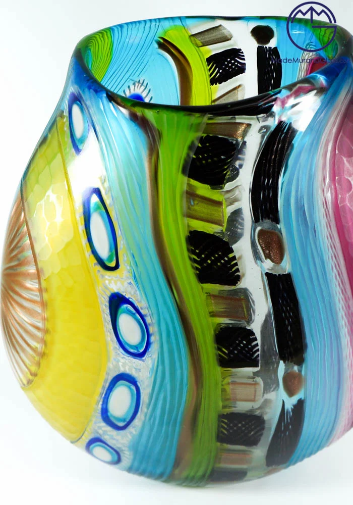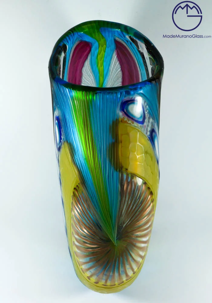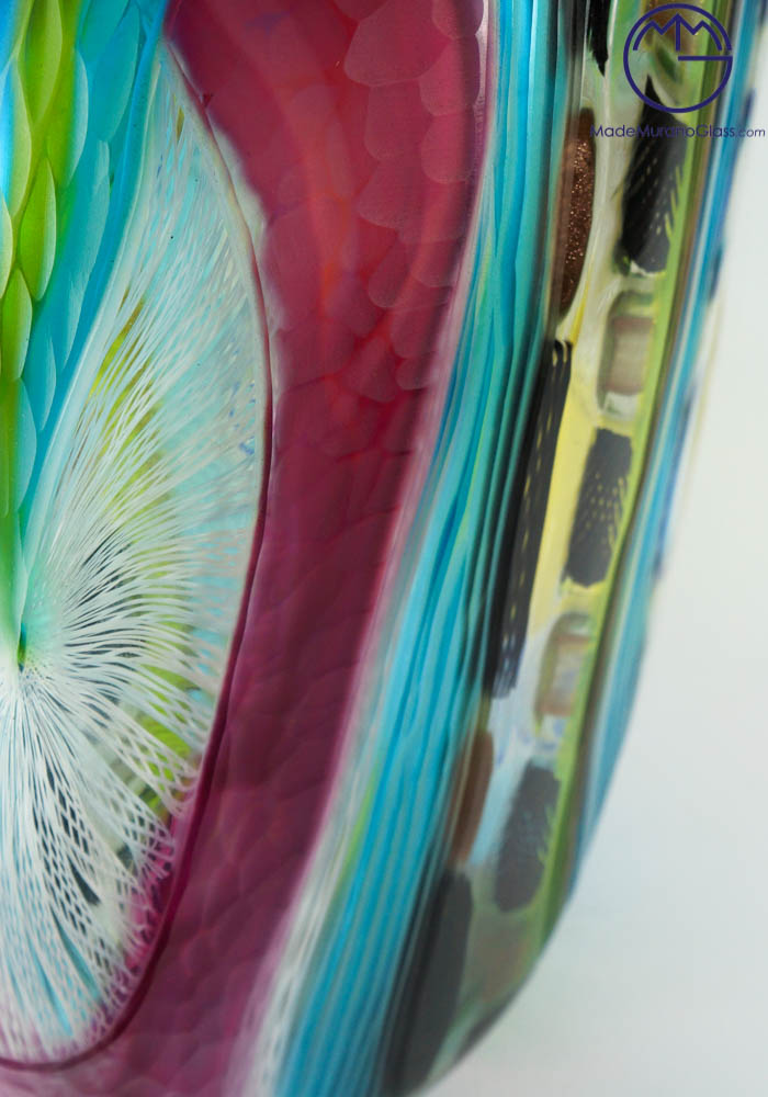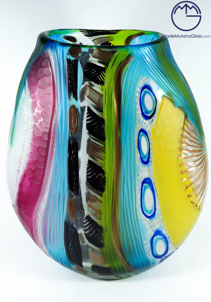 Esclusiva collezione vasi di Murano color celeste, verde, viola, nero e avventurina, con una lavorazione del vetro chiamata dai Maestri vetrai di Murano battuto (inciso). La lavorazione battuta viene eseguita a freddo in una moleria da grandi artisti dell’incisione del vetro. Pezzi di alta qualità, unici al mondo per la sua lavorazione. Questa magnifica opera viene firmata dal Maestro. Ogni articolo è minimamente differente dalla foto essendo pezzi unici e fatti a mano.