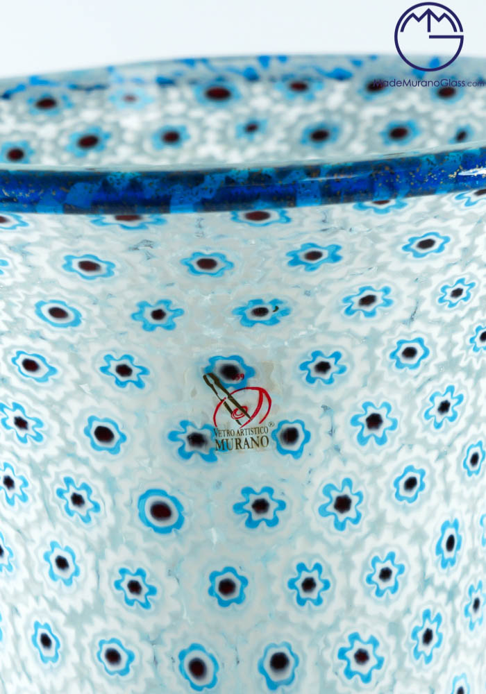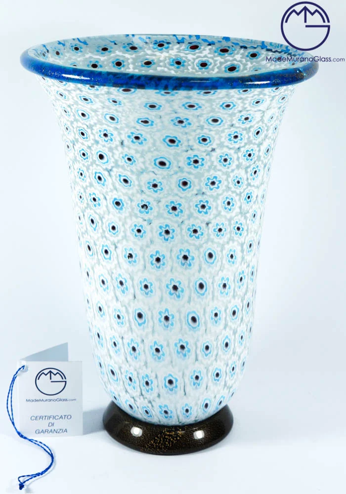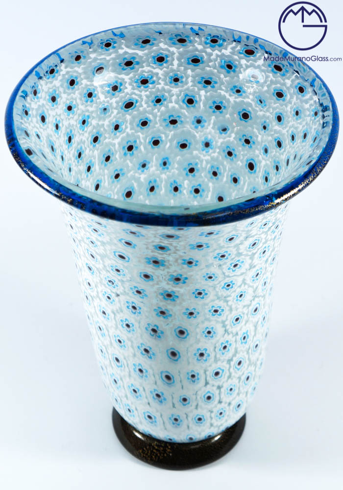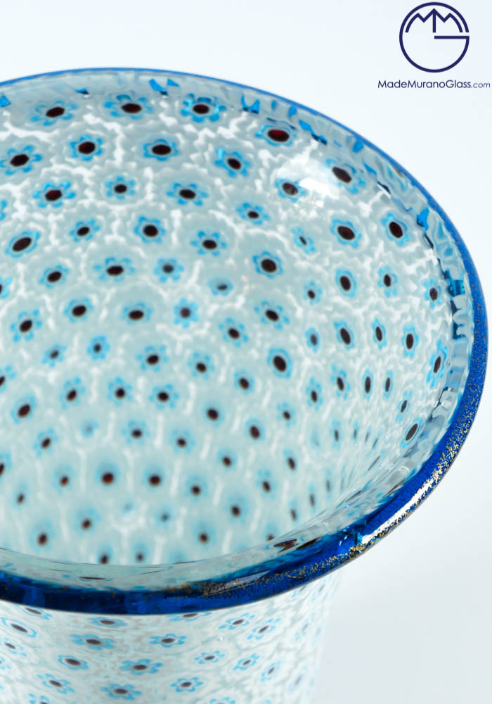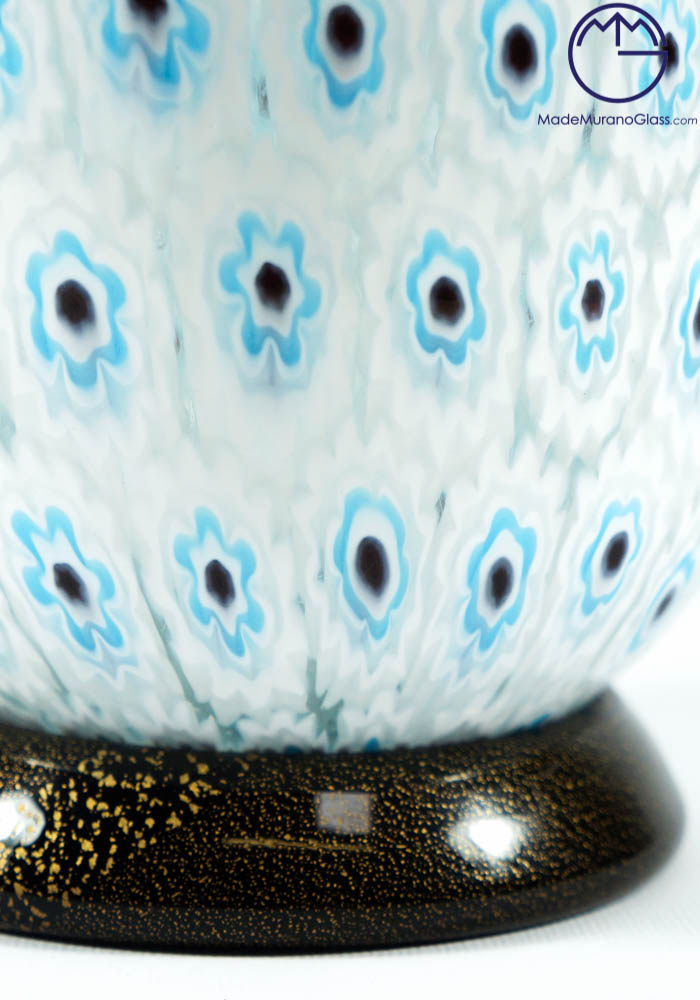 Esclusiva collezione vasi di Murano con murrina celeste, bianca, bordatura e zoccolo in oro 24kt. La lavorazione del vetro di questa opera viene effettuata da grandi Maestri vetrai Murano con molta cura e precisione, posizionando i pezzettini di vetro murrina in una piastra per poi essere fusi insieme al cristallo, formando un intrigante e unico mosaico veneziano. L’opera viene firmata con incisione a freddo dal Maestro.