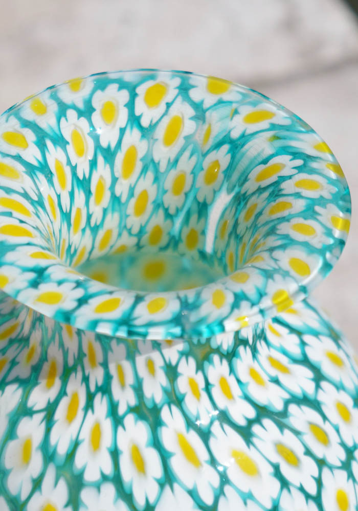 Fantastica lavorazione del vetro soffiato di Murano eseguita per realizzare questo vaso con murrine millefiori color acquamarina. Il posizionamento della murrina millefiori viene effettuato con molta cura e precisione da abili artisti, essendo posti uno a uno i pezzettini di murrina in una piastra per poi essere fusi assieme al cristallo formando un intrigante ed unico mosaico.