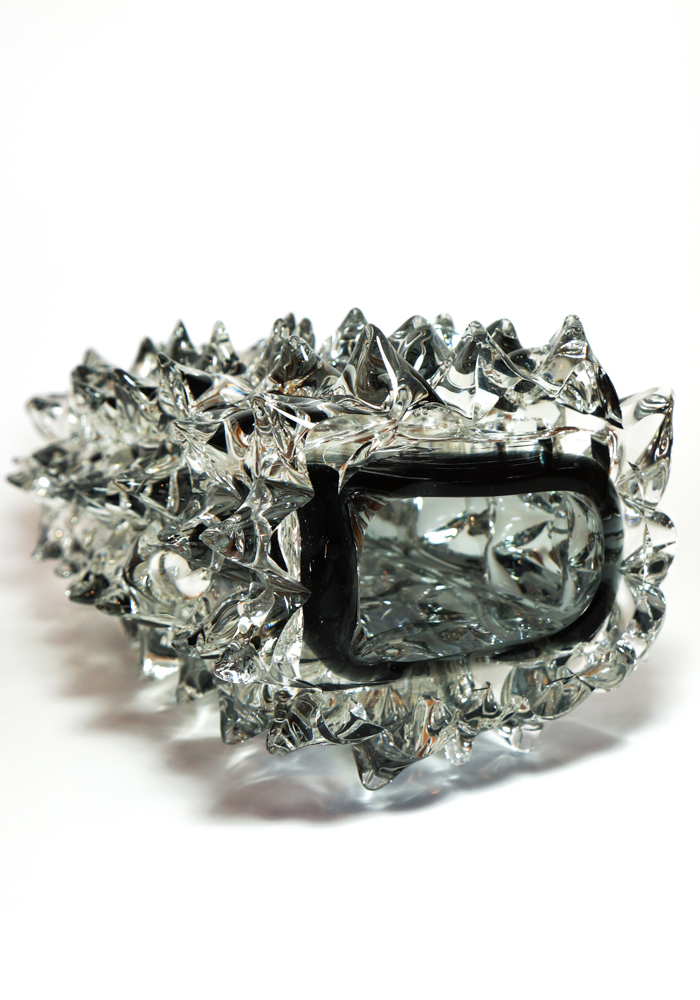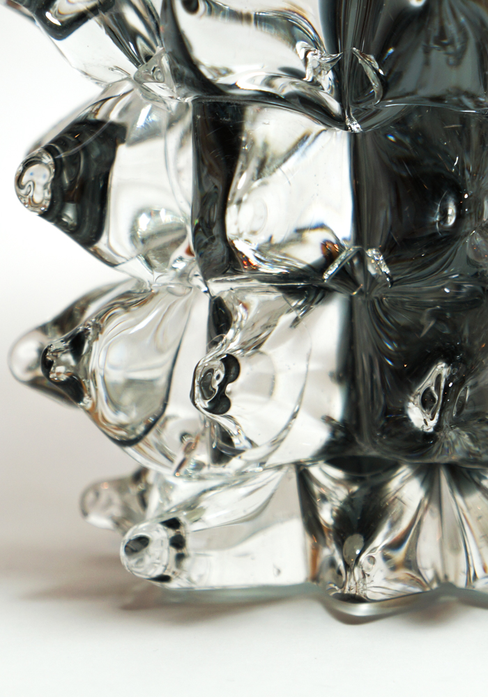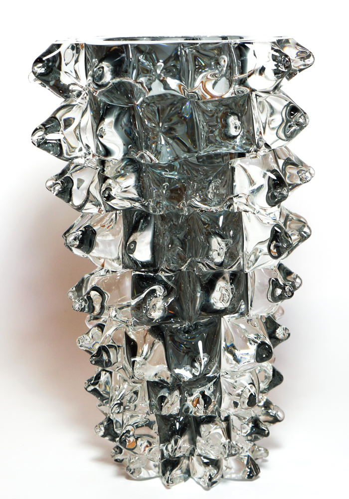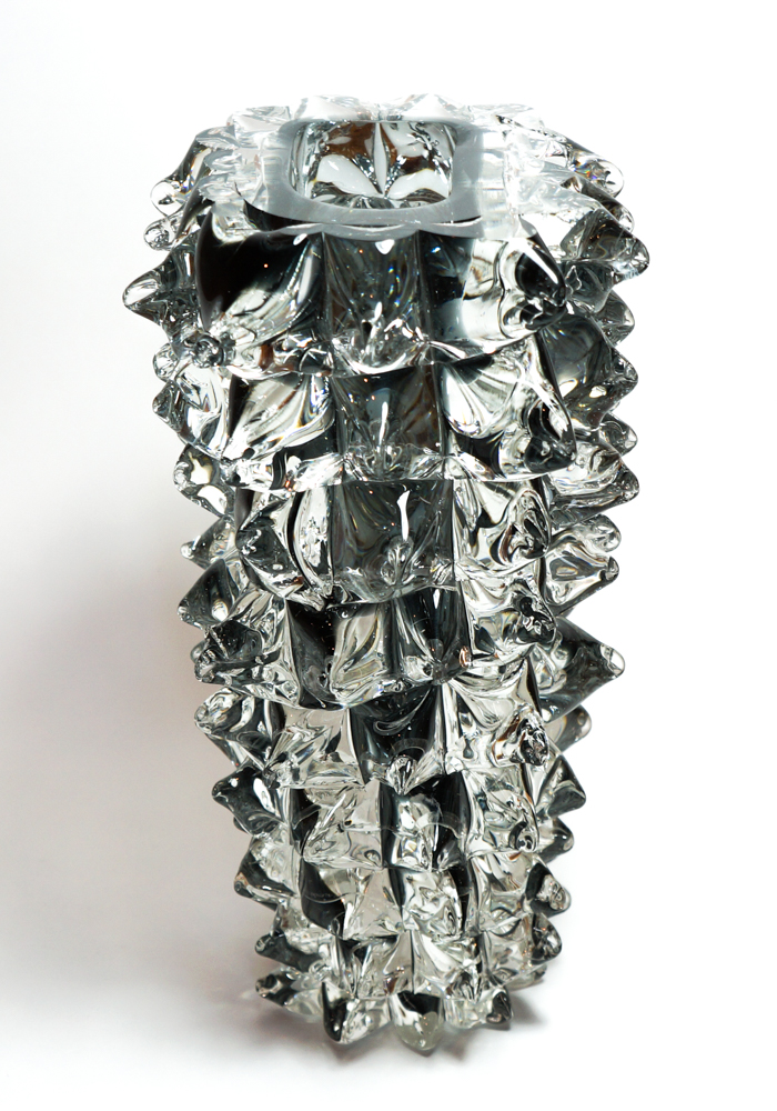 Vaso in vetro soffiato di Murano colore acciaio con decorazioni in rilievo di vetro cristallo. Elegante, esclusivo e raffinato, questa fantastica opera è stata eseguita interamente a mano, modellando a caldo ogni singolo particolare dando così vita a una scultura unica e inimitabile. Per completare la sua unicità, il Maestro vetraio Beltrami incide a freddo la propria firma nell’opera.