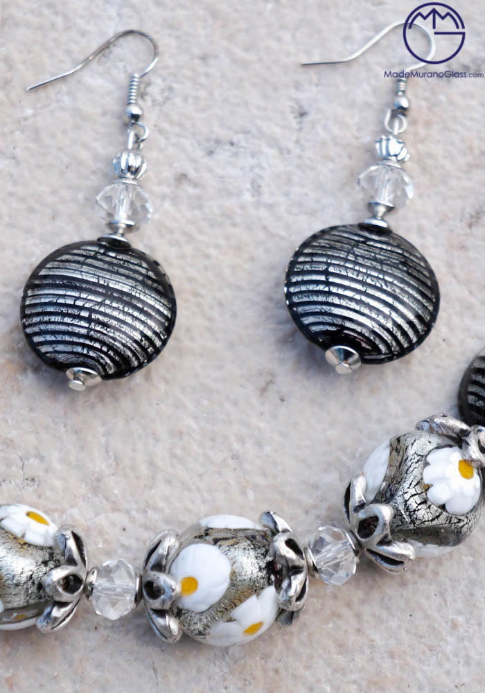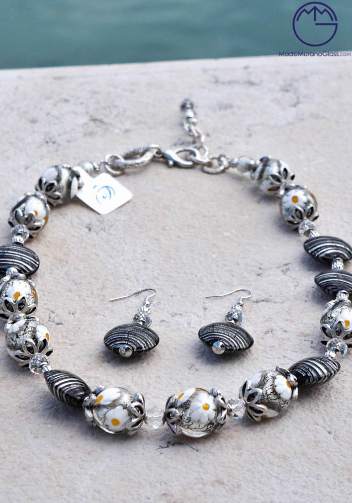 Wonderful necklace and earrings in Murano glass, completely handmade covered with silver leaf. Venetian glass jewellery are carried out with “lume” technique. Elegant, class and sophistication are suitable words for this amazing Murano collection jewellery.