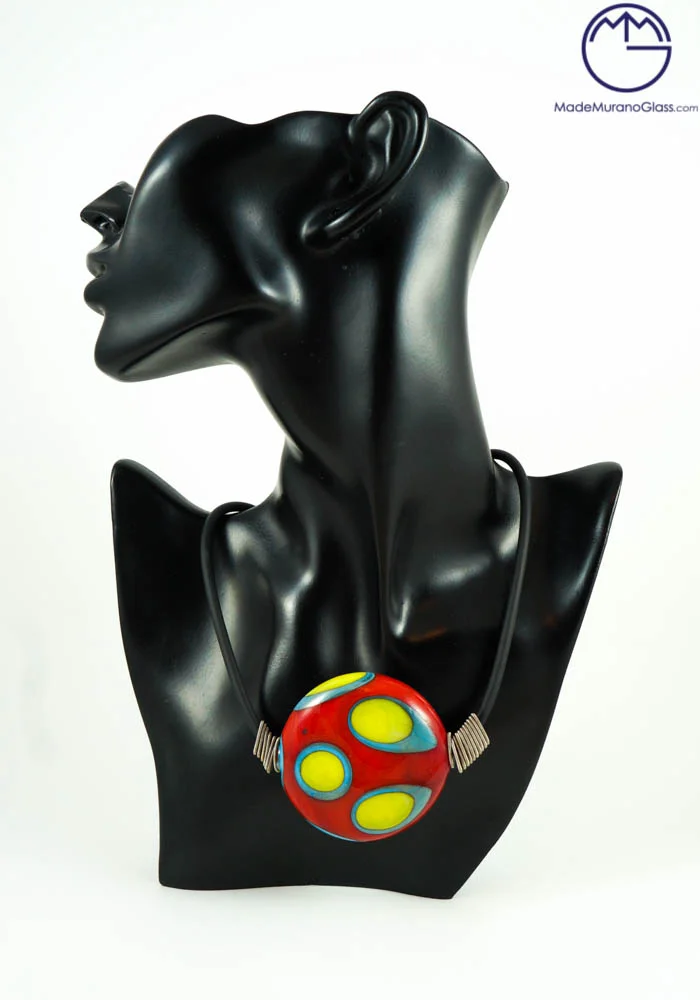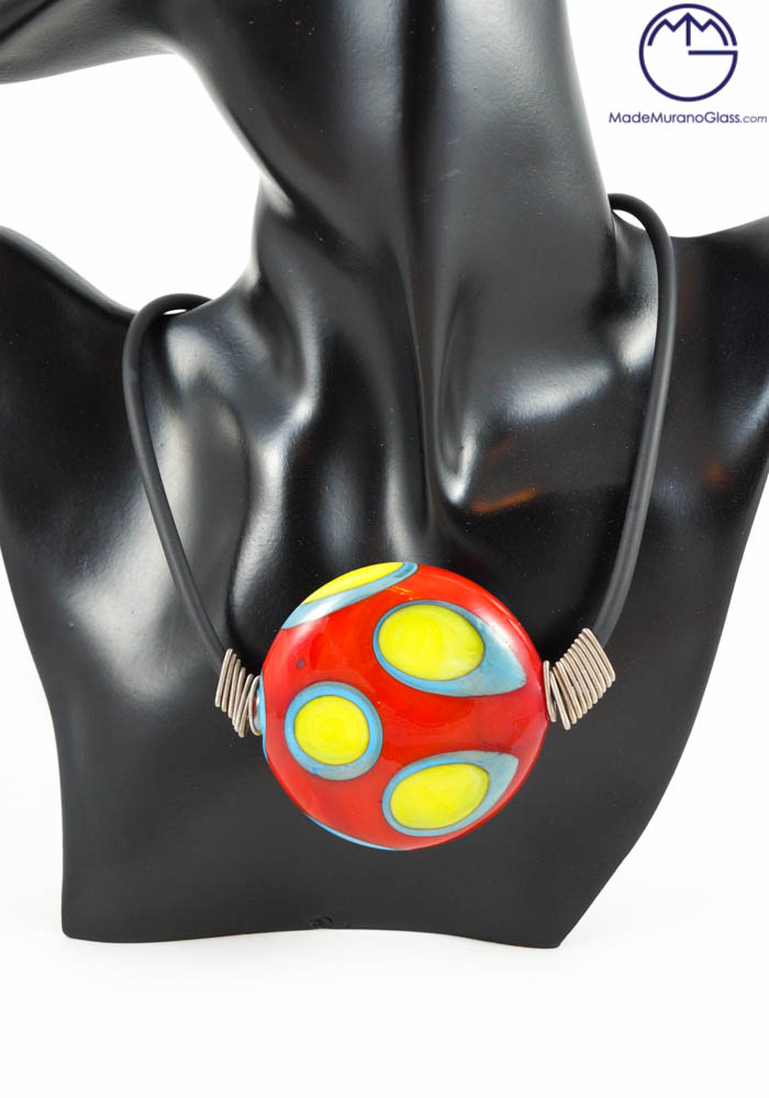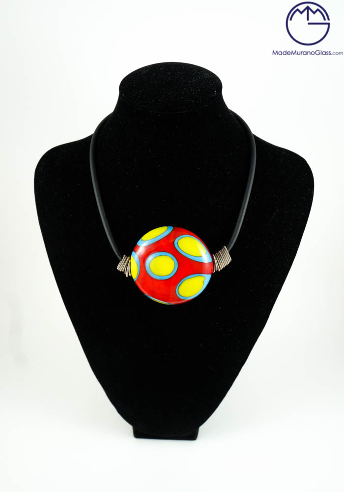 Our Made Murano glass necklaces are hand-made using the “lume” Murano glasswork, like this wonderful Murano jewelry “Adelaide” red coloured with yellow markings and light blue, made of Venetian blown glass and realized by Murano artisans “Ballarin&Cortella”. The combination of style and design is the perfect feature of this Made Murano Glass art work.