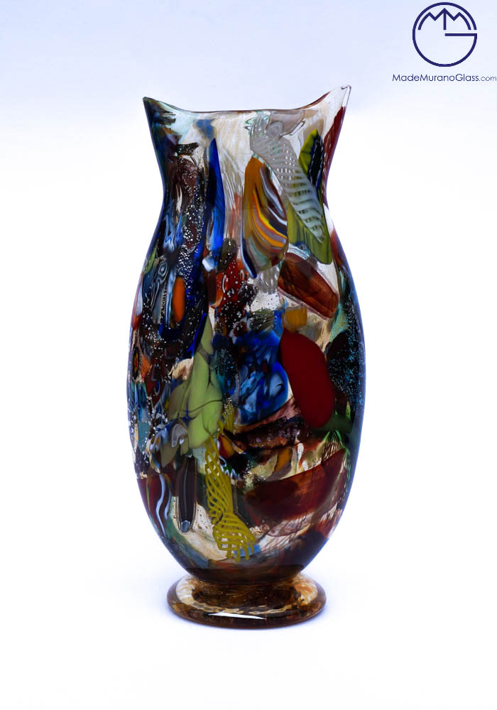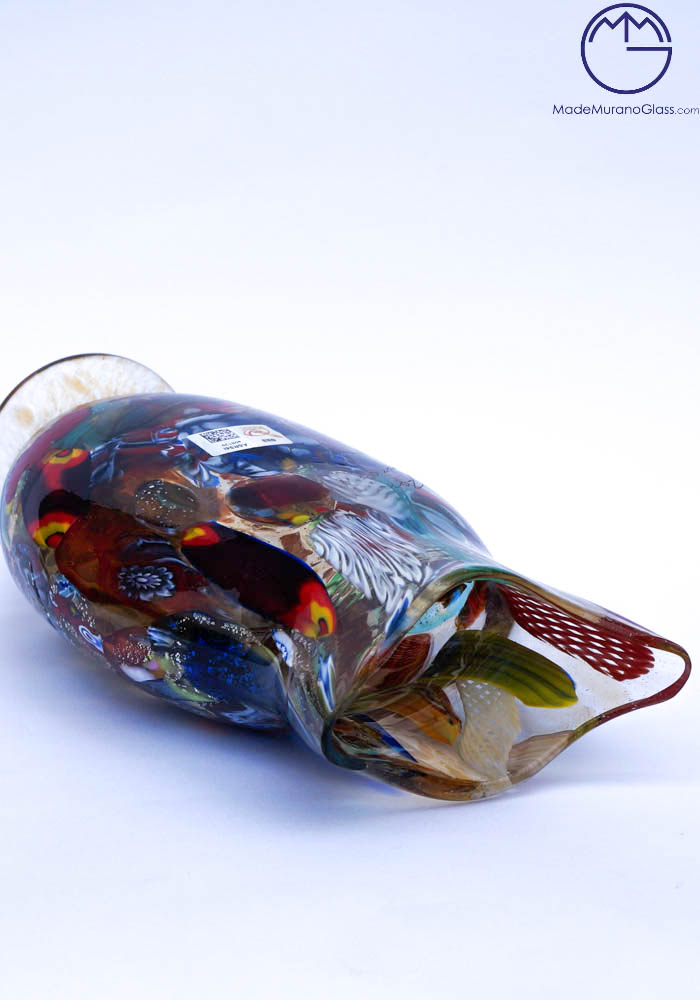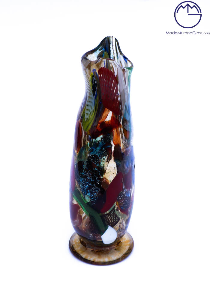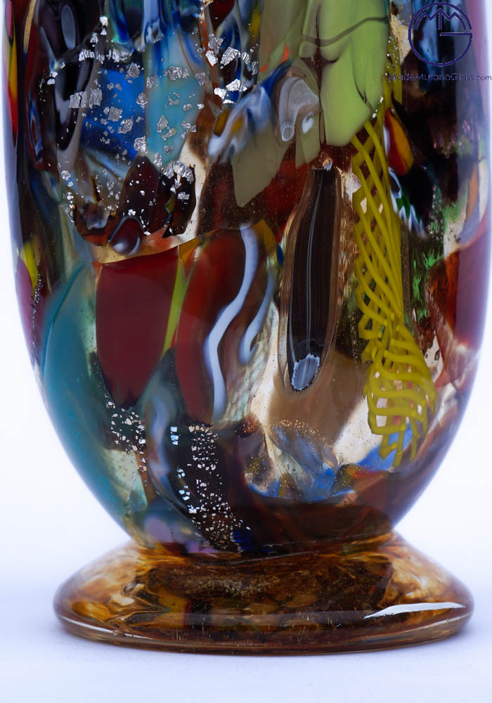 Venetian blown glass amber vase with assorted filigree decorations, Millefiori, “Mace” and silver. “Mario Costantini” glassmaker Master mixes these colors in an ever different way, making the works so unique and inimitable. Vase signed with cold engraving as photos. The venetian glass vase has the label Marchio Vetro Artistico®. View Photo.