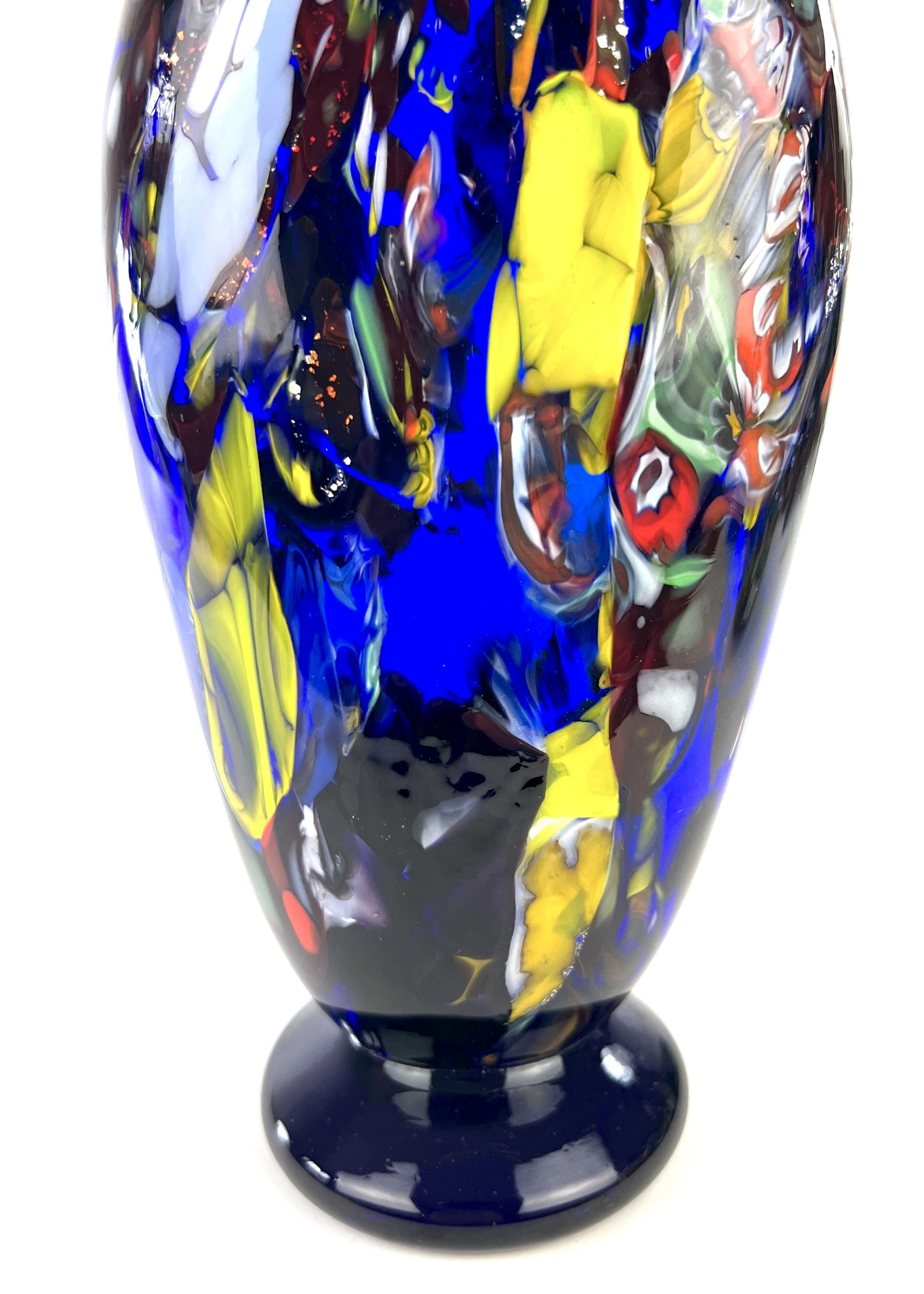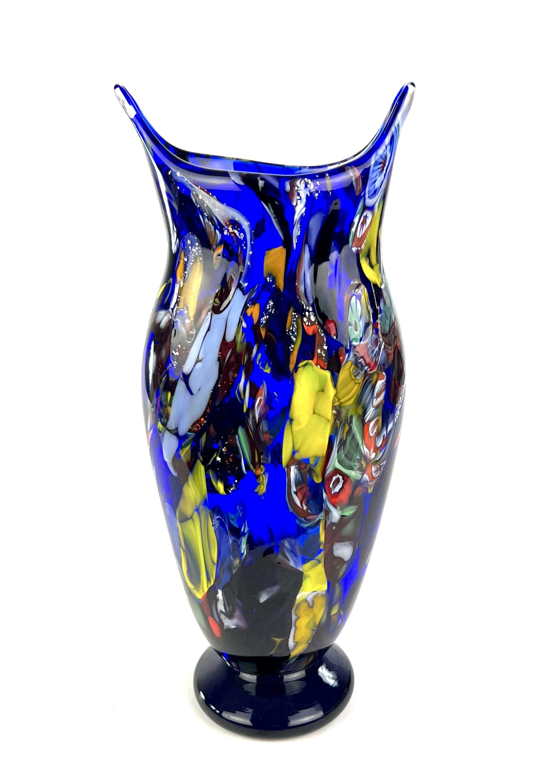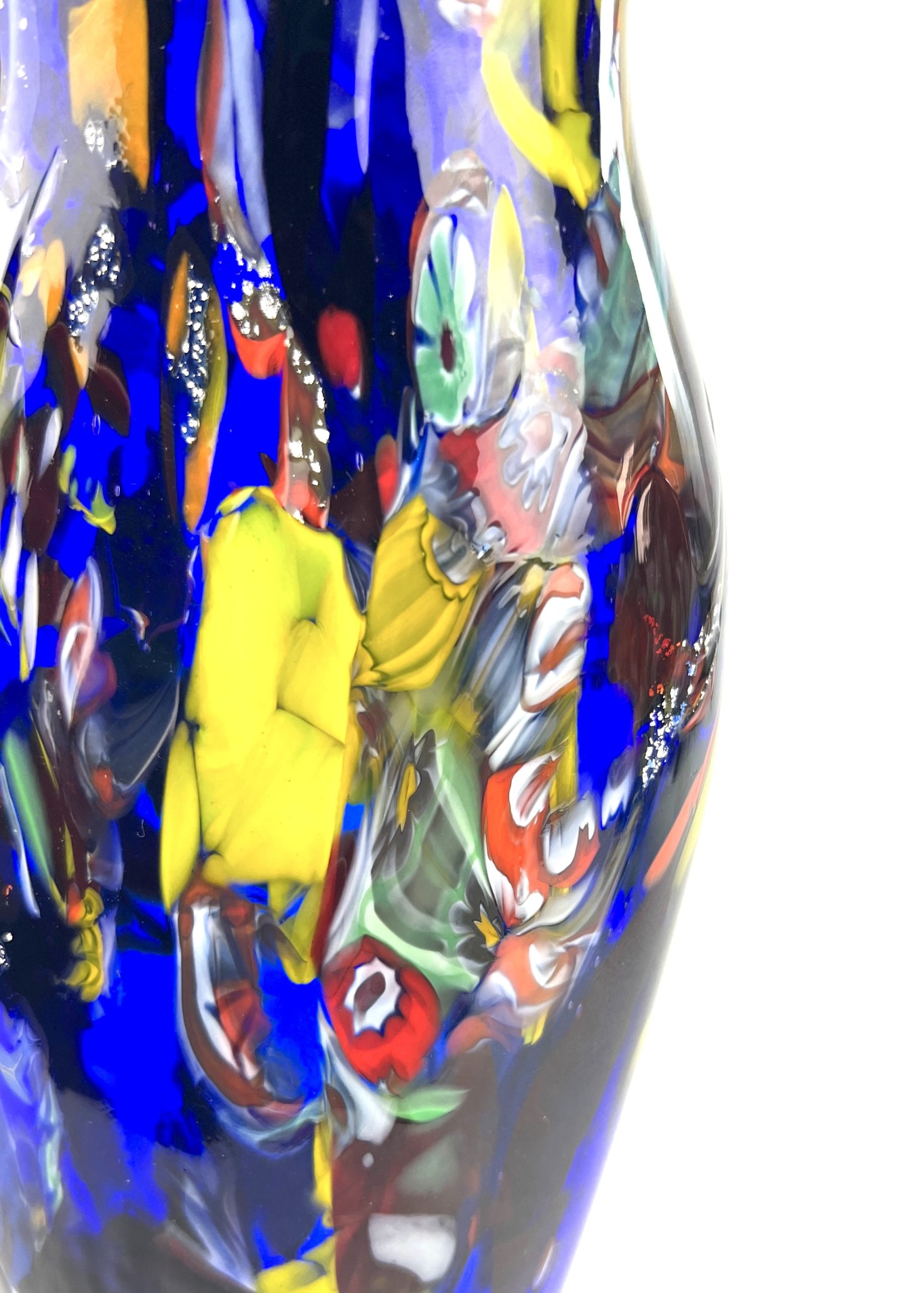 Murano blown glass vase with assorted decorations in filigree, aventurine, murrina millefiori, mace and real silver leaf.