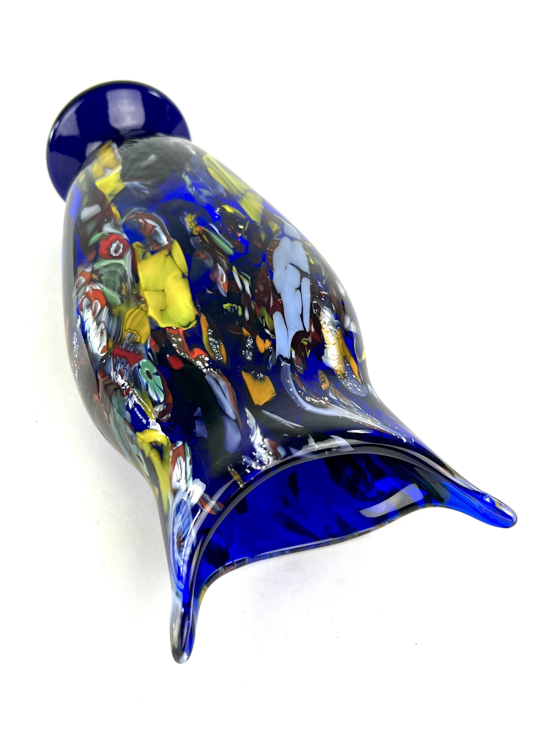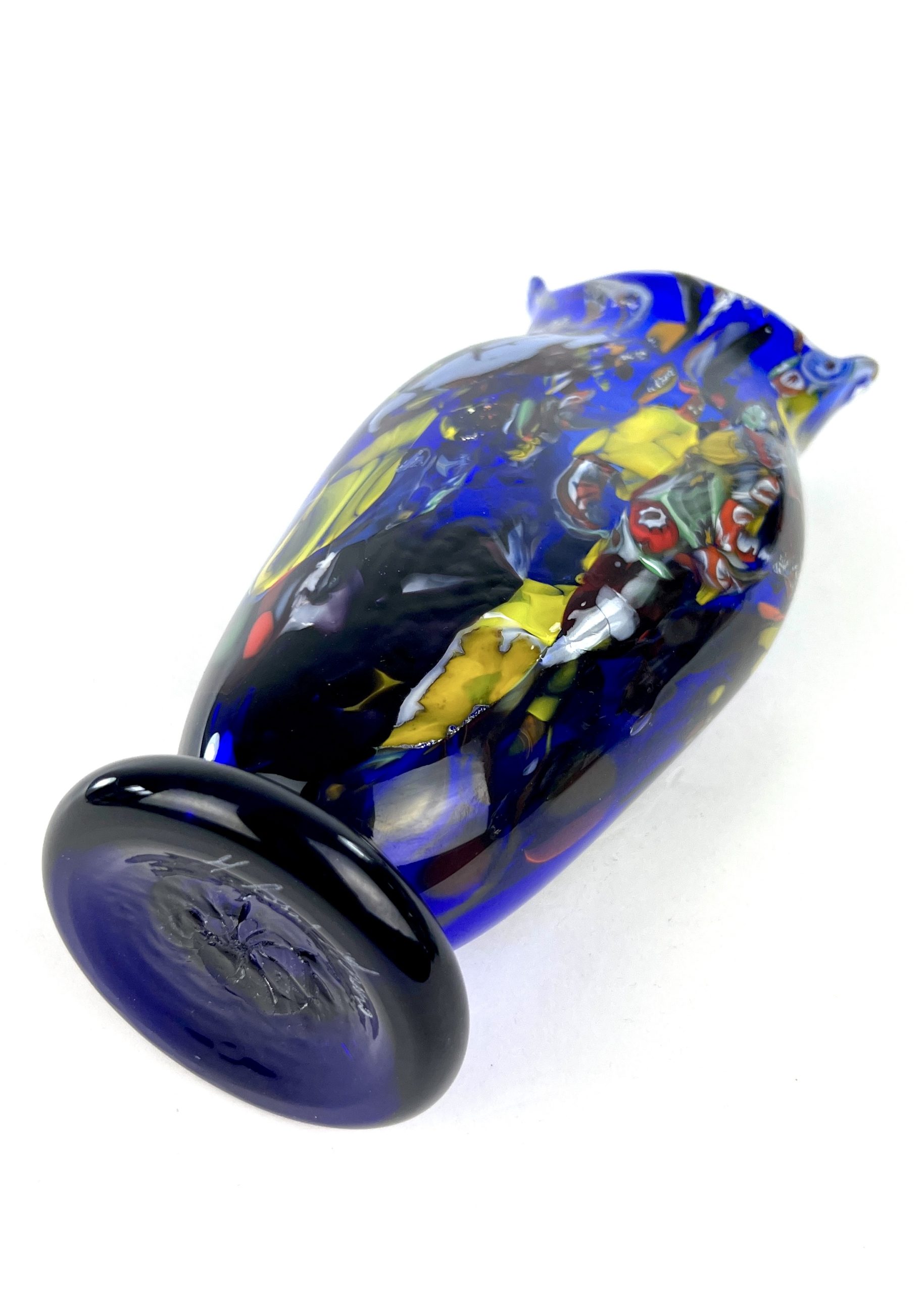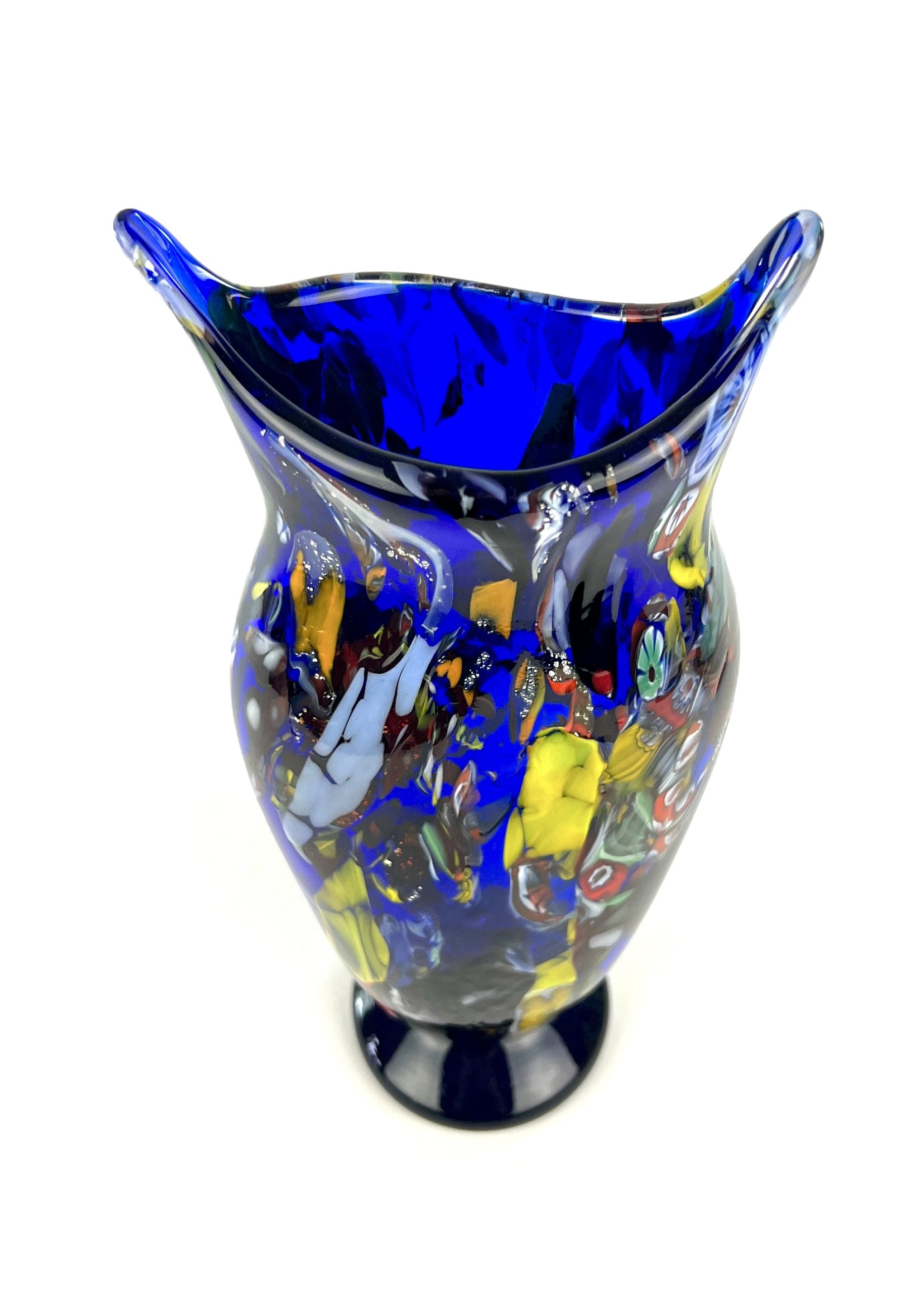 Murano blown glass vase with assorted decorations in filigree, aventurine, murrina millefiori, mace and real silver leaf.