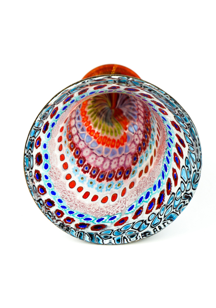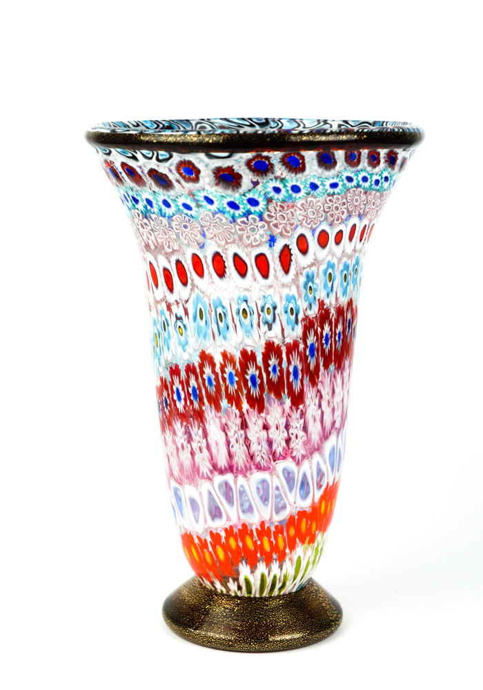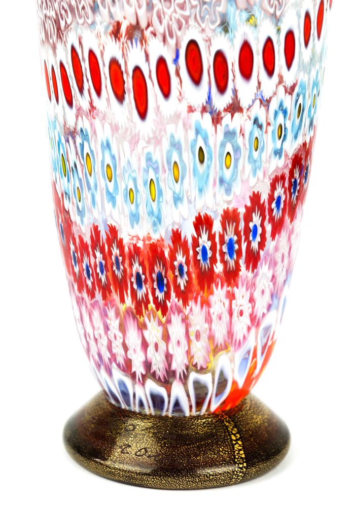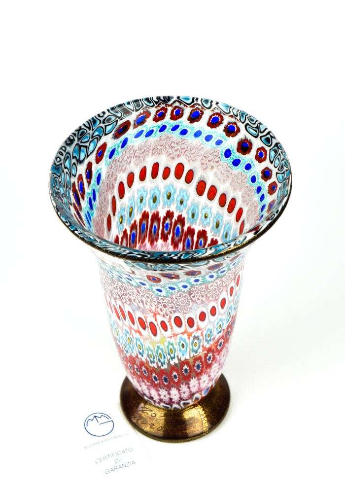 Exclusive working of Murano glass to produce this fantastic Venetian glass vase with murrine millefiori and details with gold leaf 24 carats.Â