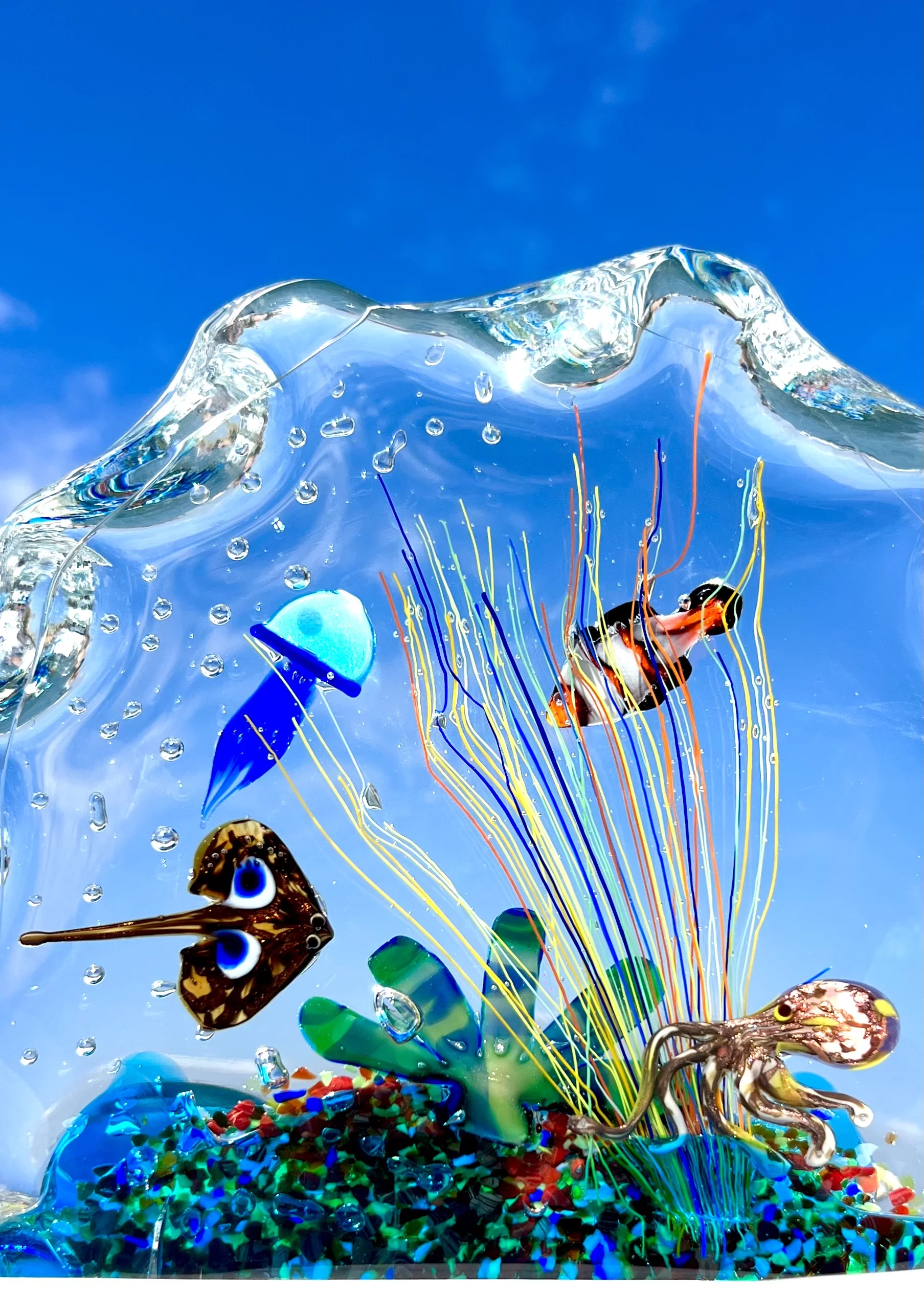 The sculpture contains 1 octopus, 1 jellyfish, 1 breed fish, 1 clownfish (Nemo), 1 sea anemone and various marine decorations.
