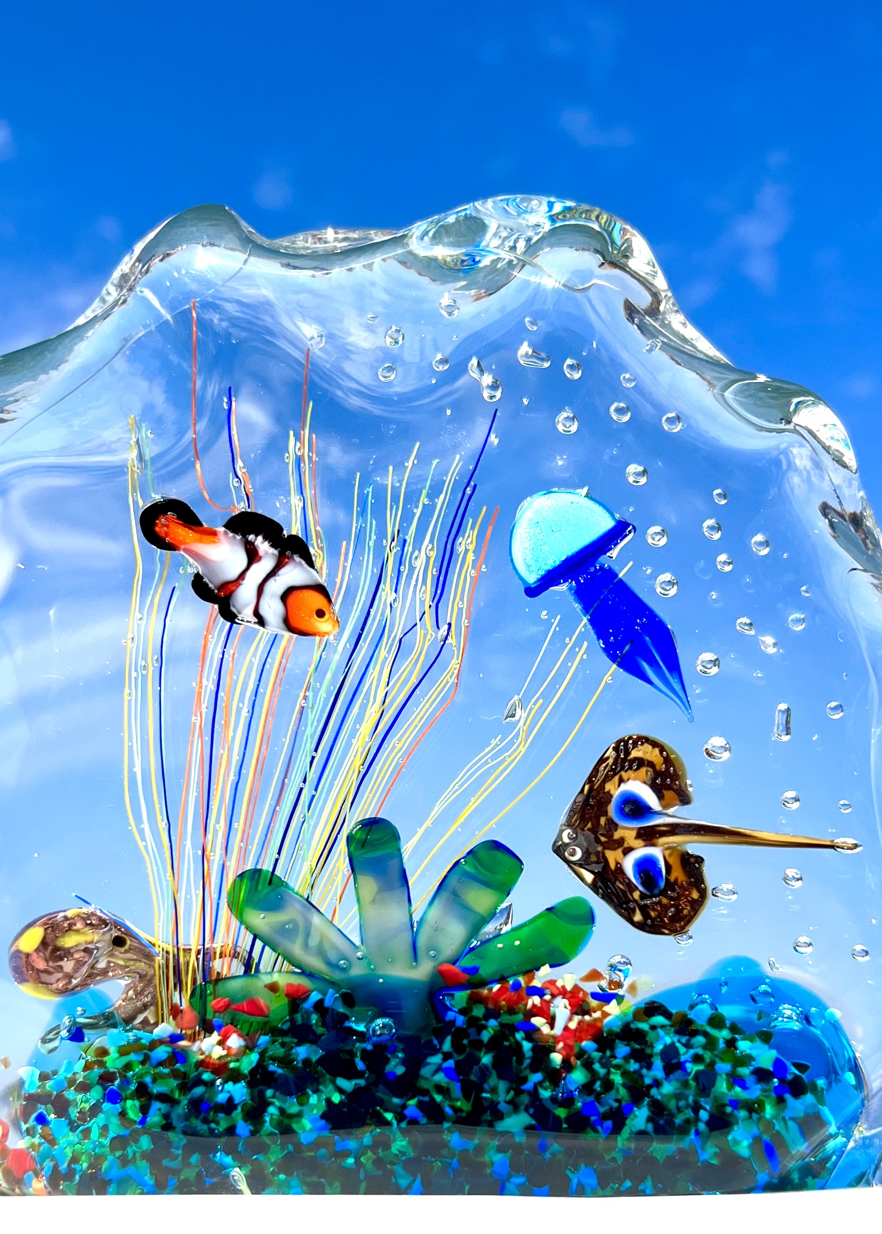 Half-moon aquarium sculpture in Murano glass.